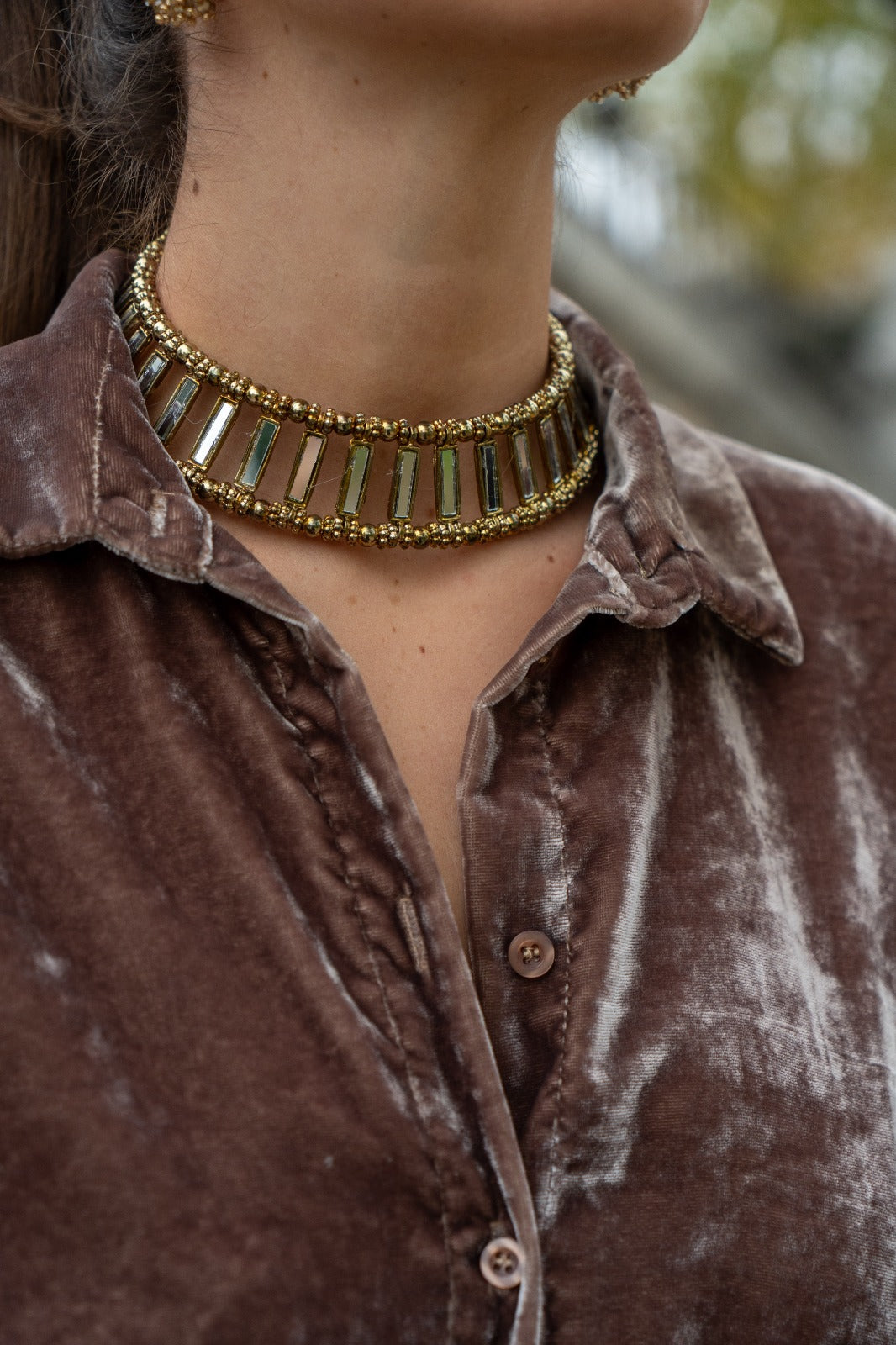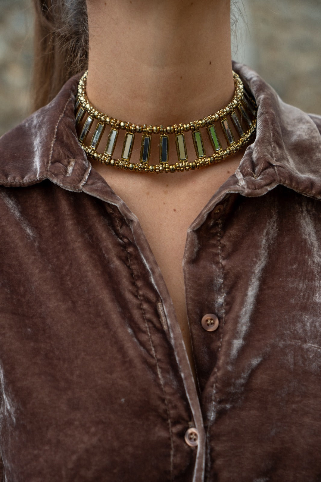 Choker rigido, formado por pequeños espejos ajustados a unos cordones dorados.