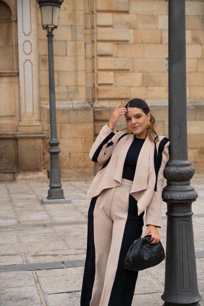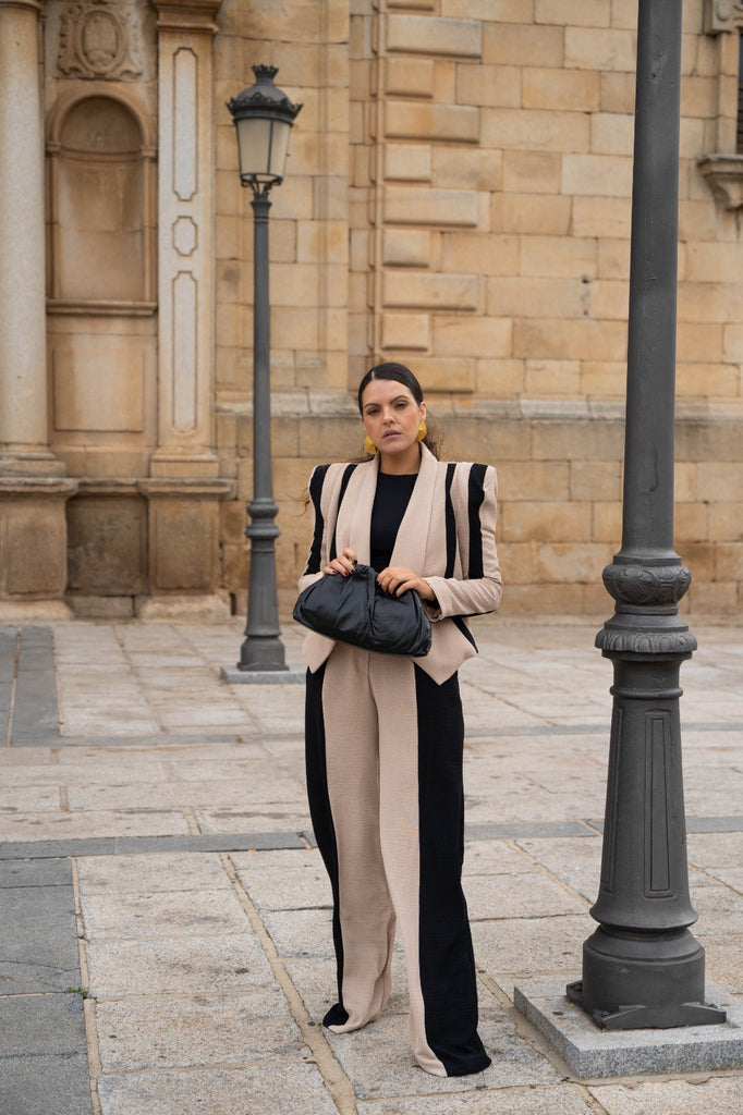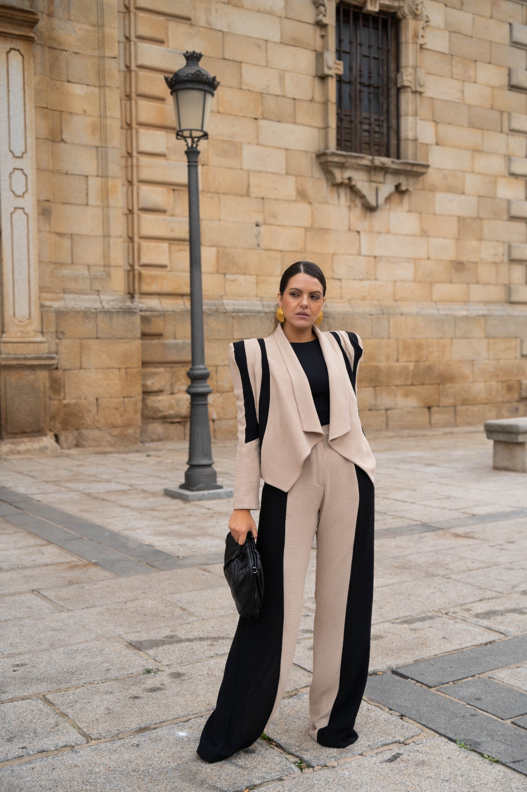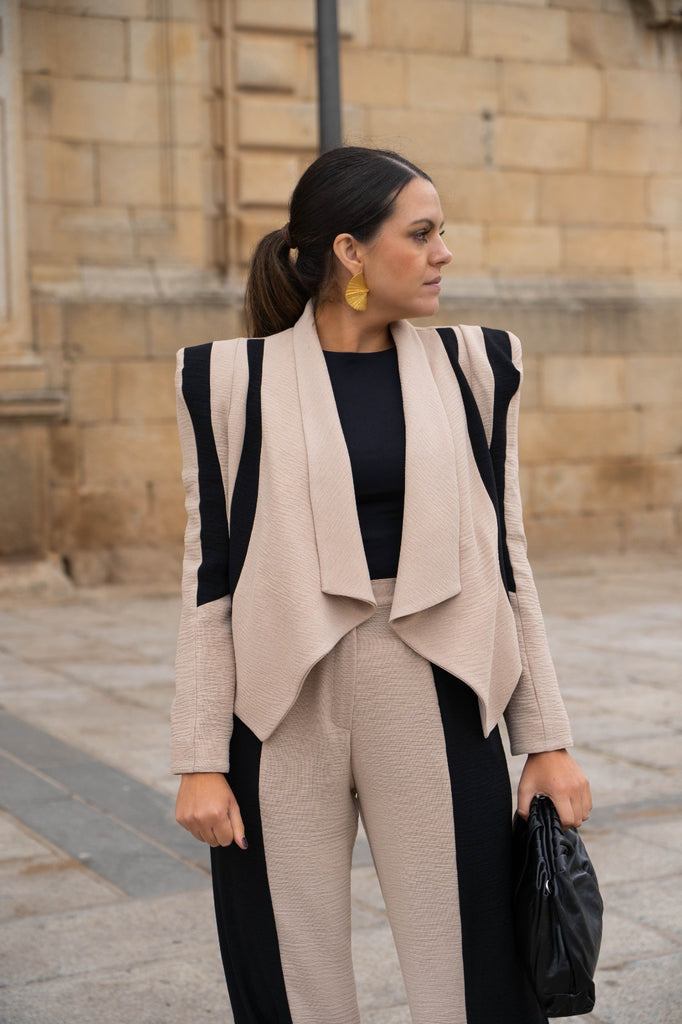 Conjunto compuesto por blazer corta, manga larga, forma delantera con picos y pantalon con cintura alta, ancho. Bicolor beige y negro.
