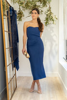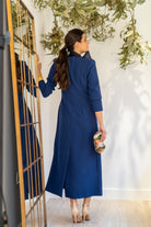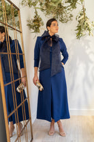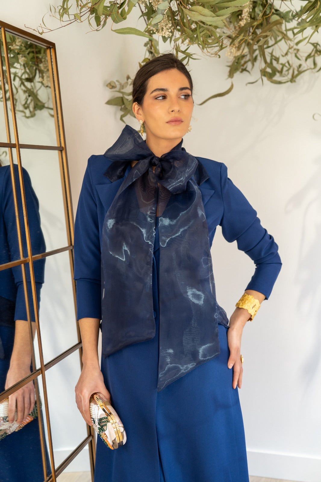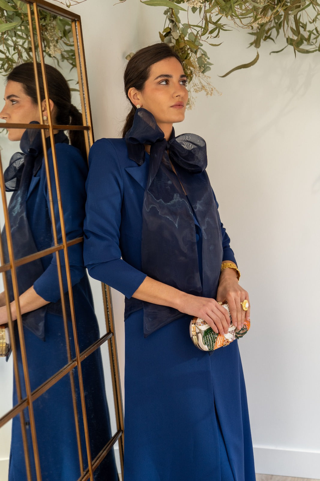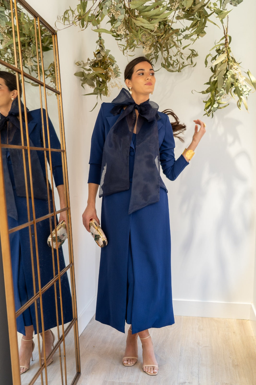 Conjunto compuesto por vestido palabra de honor, abertura trasera y abrigo cuello smokin con lazo de organza, manga francesa. En color azul.