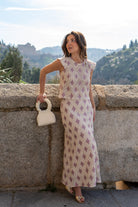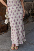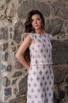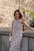 Conjunto compuesto por blusa escote redondo, sin mangas y falda alta con cintura, abertura trasera. En crochet beige y rosa.