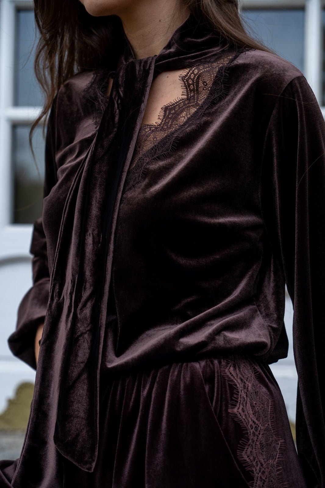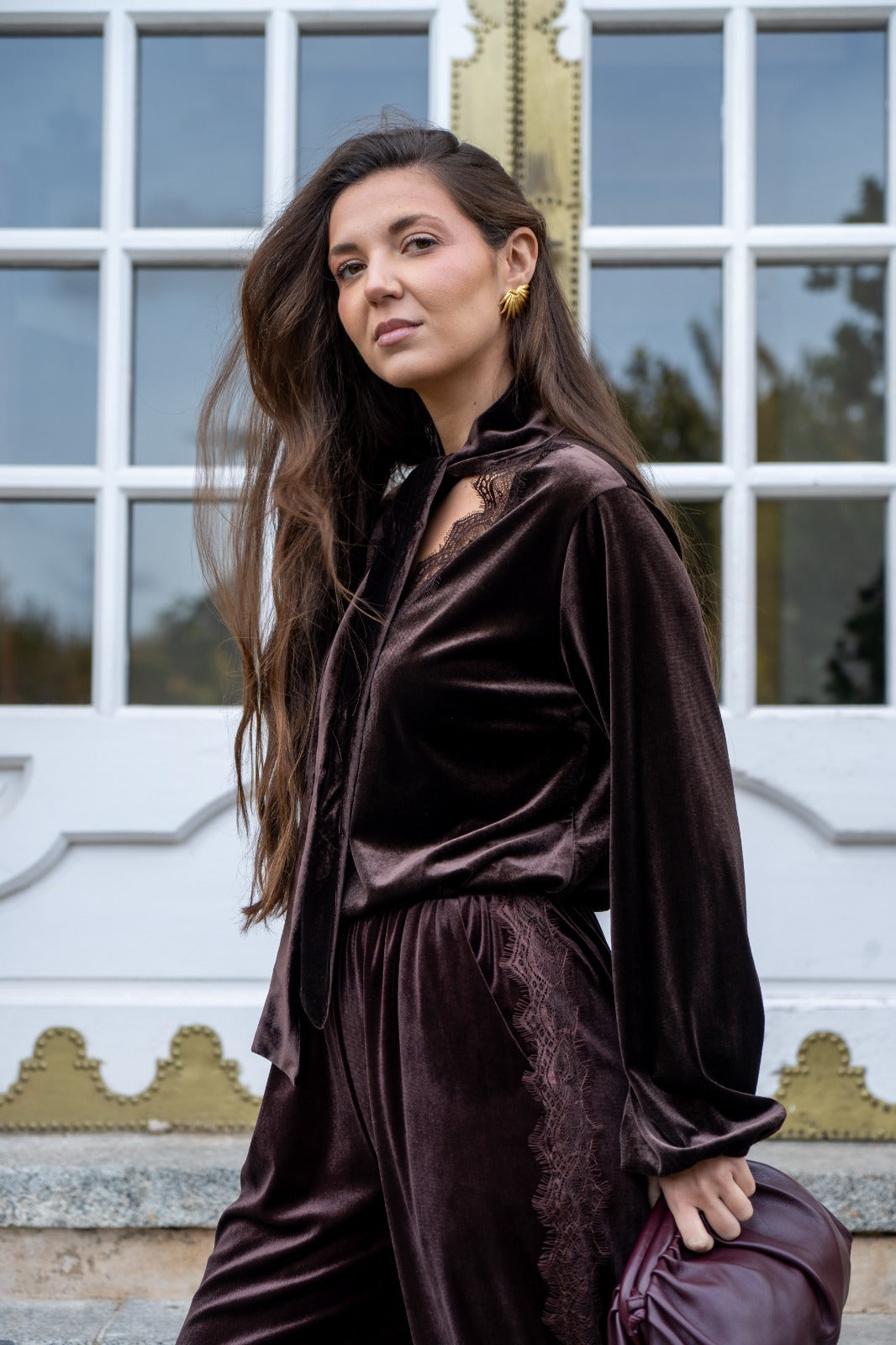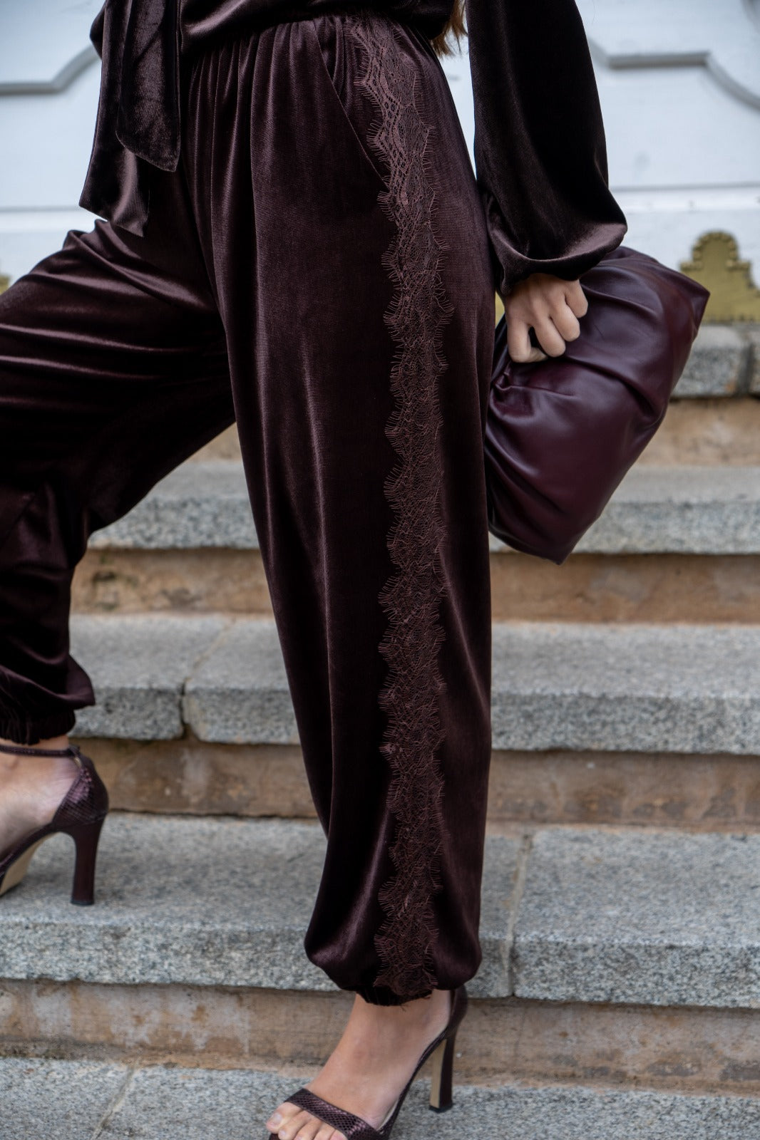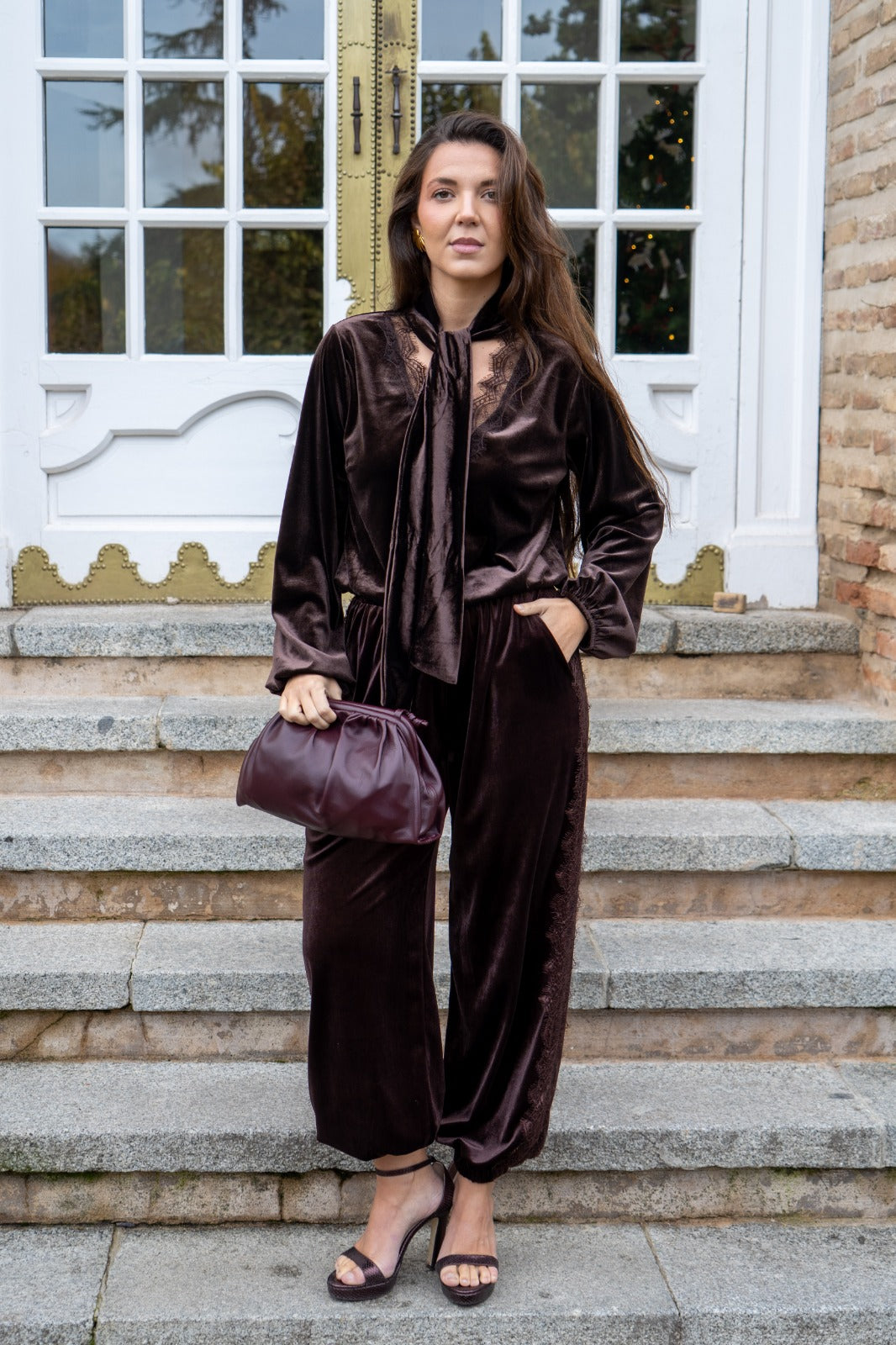 Conjunto compuesto por blusa, escote a pico con puntilla, manga larga con puño engomado y pantalón bombacho, cintura engomada, puntilla en los laterales, en color marrón.