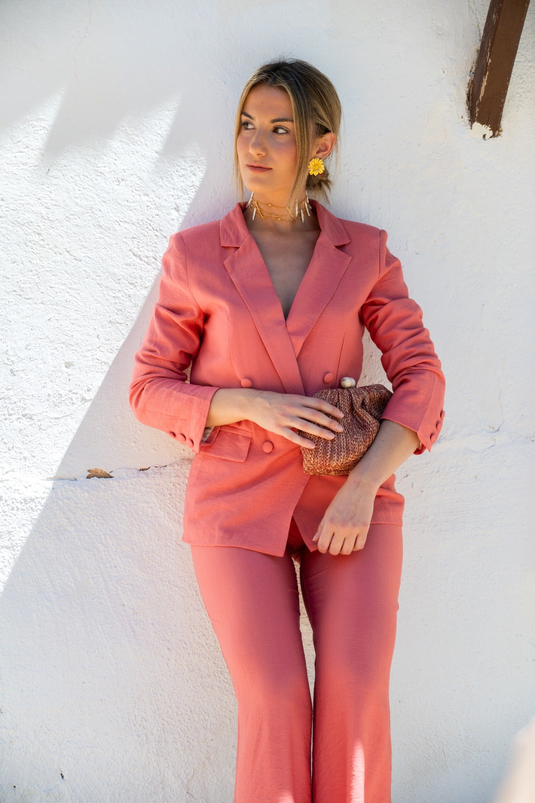 Conjunto compuesto por chaqueta manga larga, cruzada y pantalon alto, cintua, bolsillos laterales. En color coral.