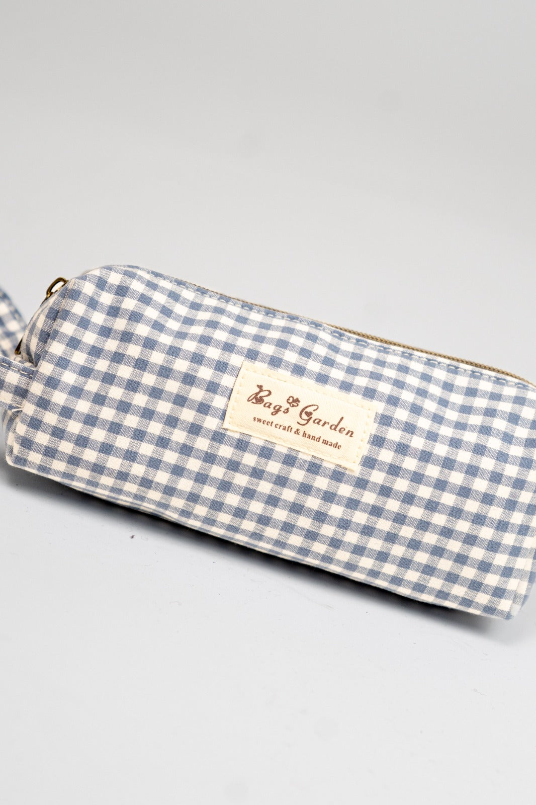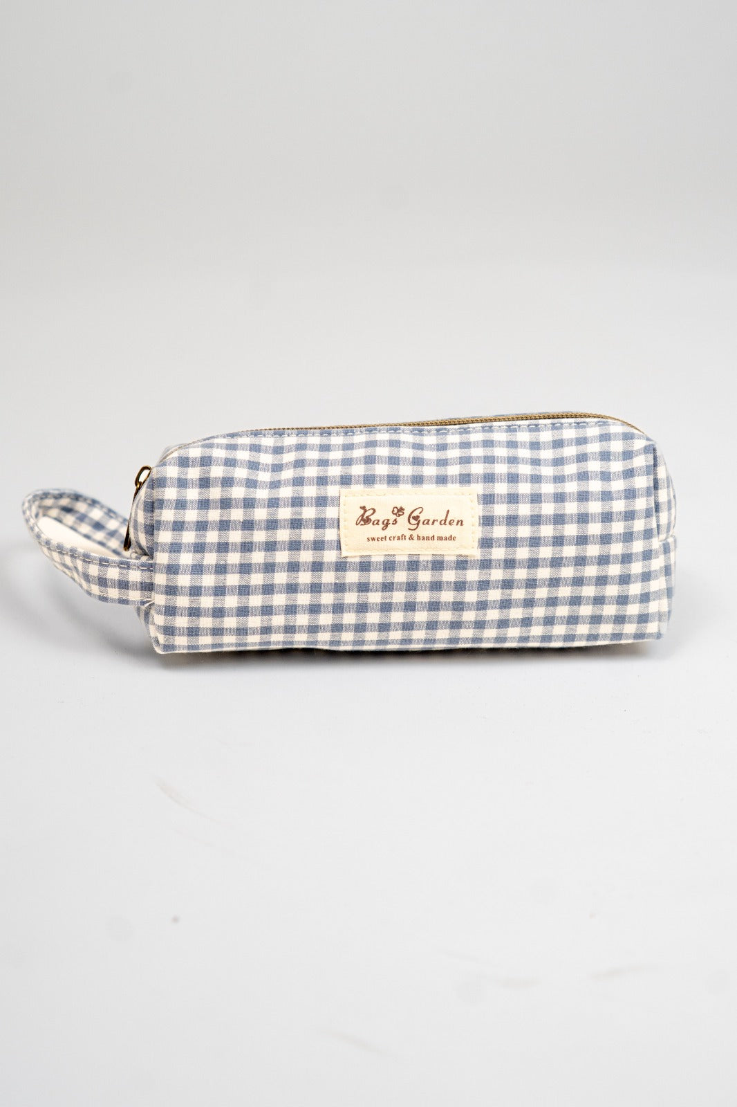 Estuche o neceser pequeño, cierre con cremallera, asa a un lado. En vichy blanco y azul.