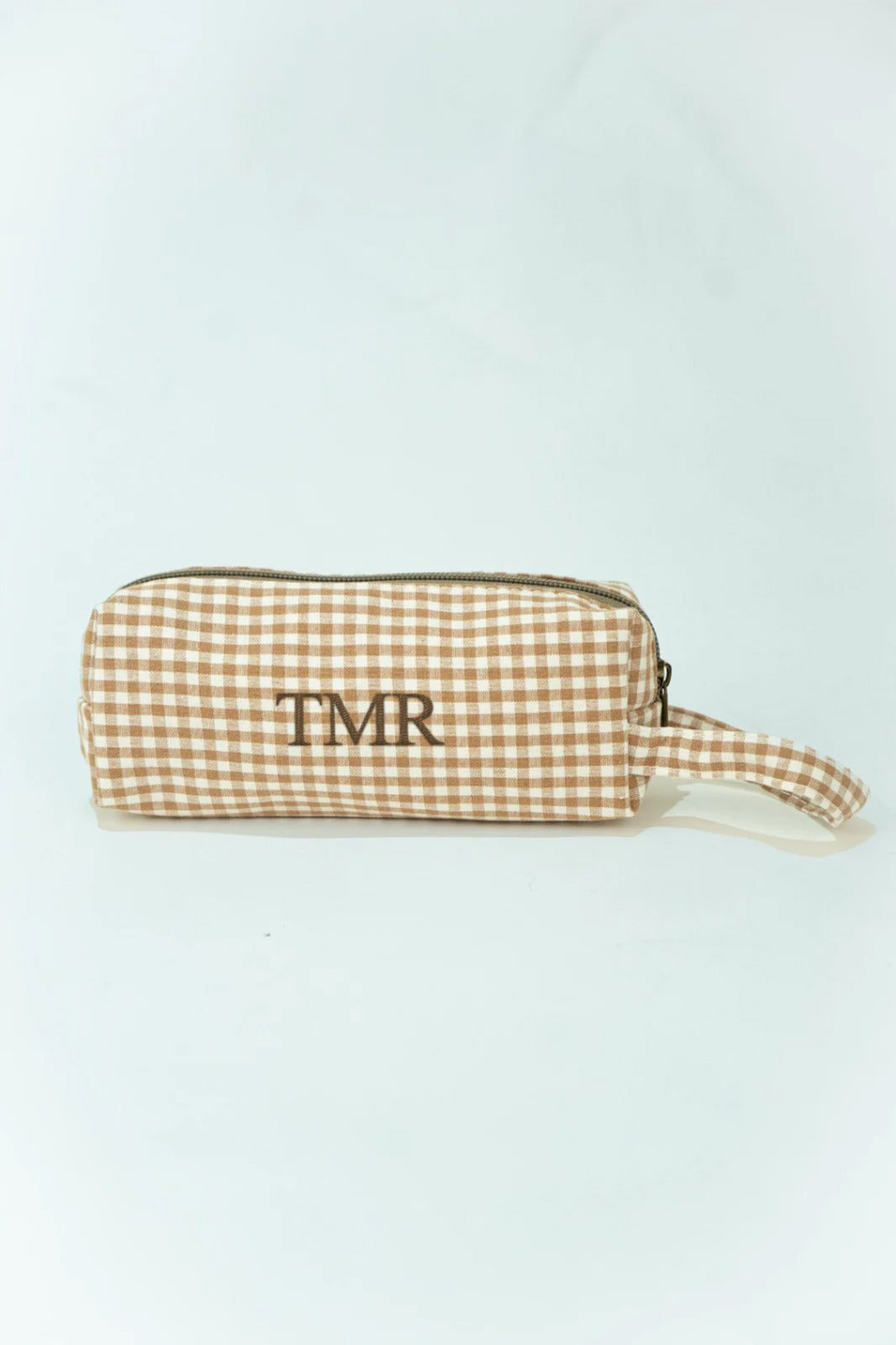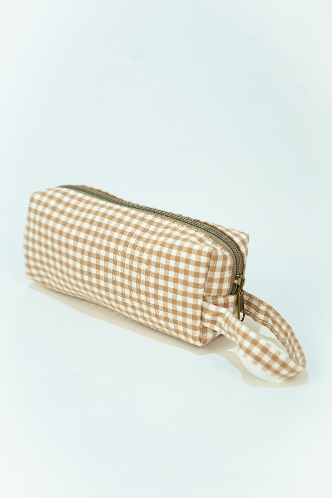 Estuche o neceser pequeño, cierre con cremallera, asa a un lado. En vichy blanco y marrón.