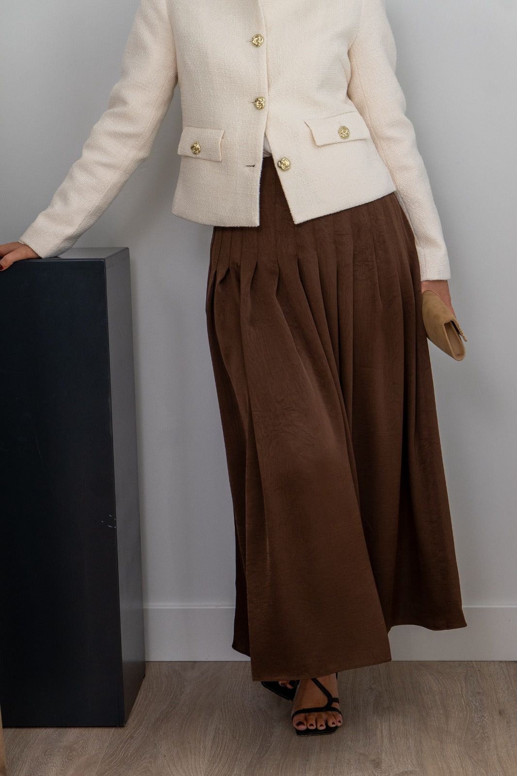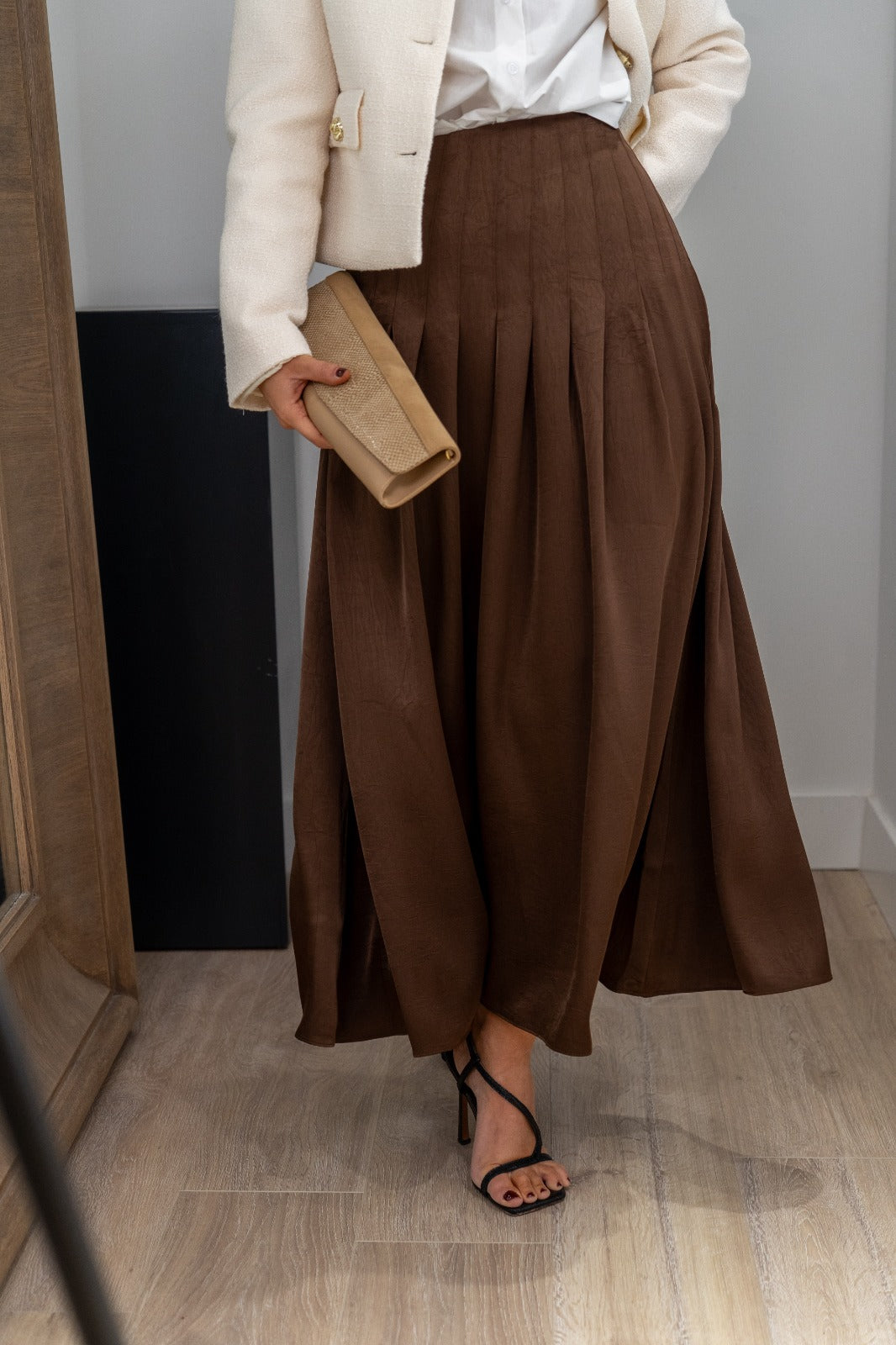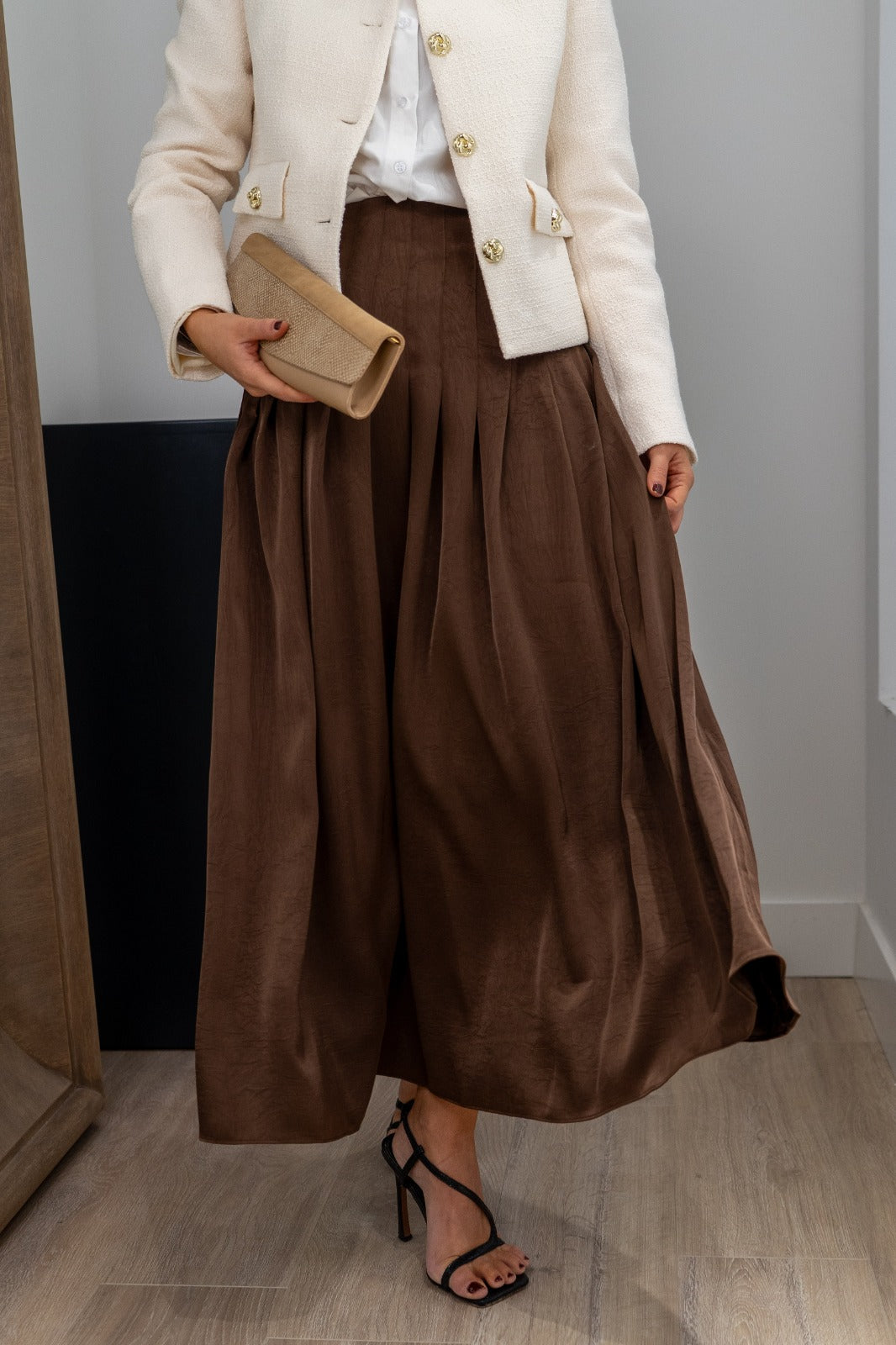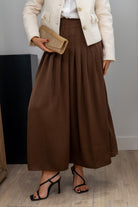 Falda midi, cintura alta, plisada, fluida con movimiento. En color marrón.