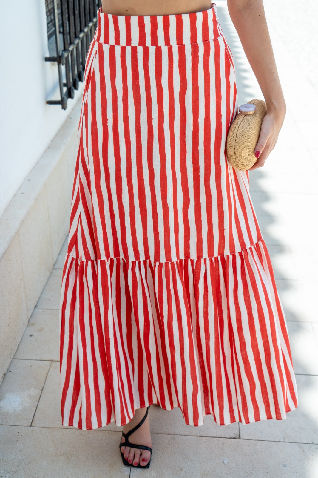 Falda larga, cintura alta, engomada de detras, volante abajo. En rayas blancas y rojas.
