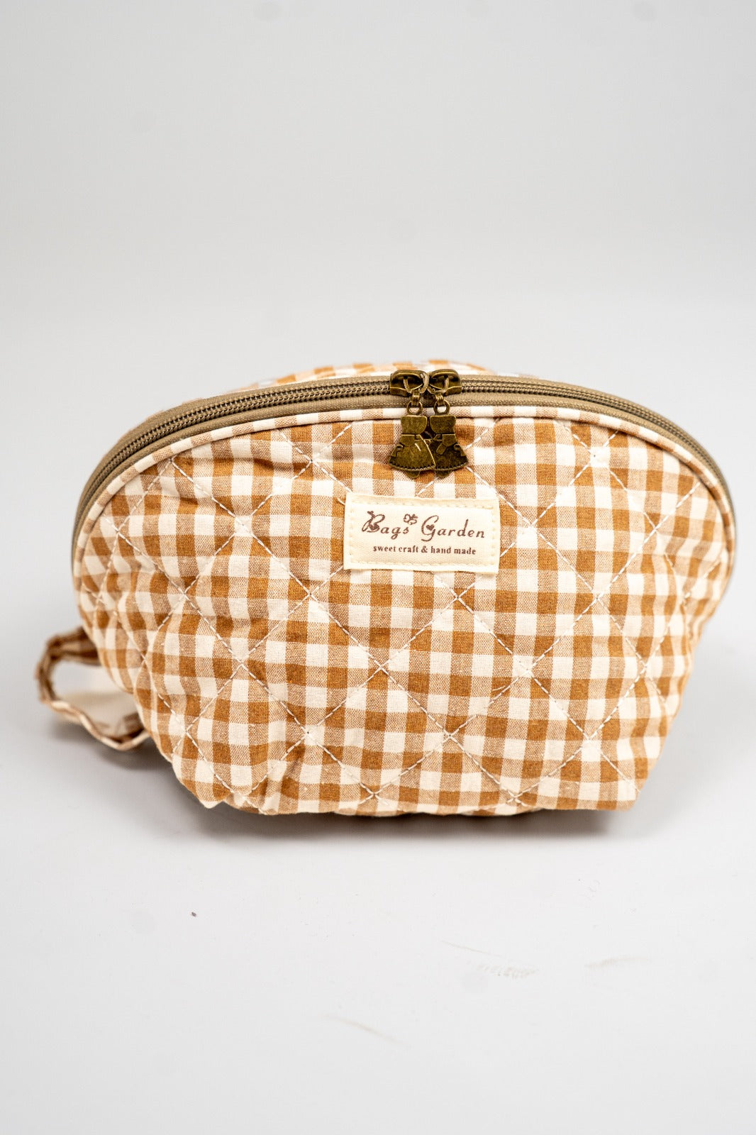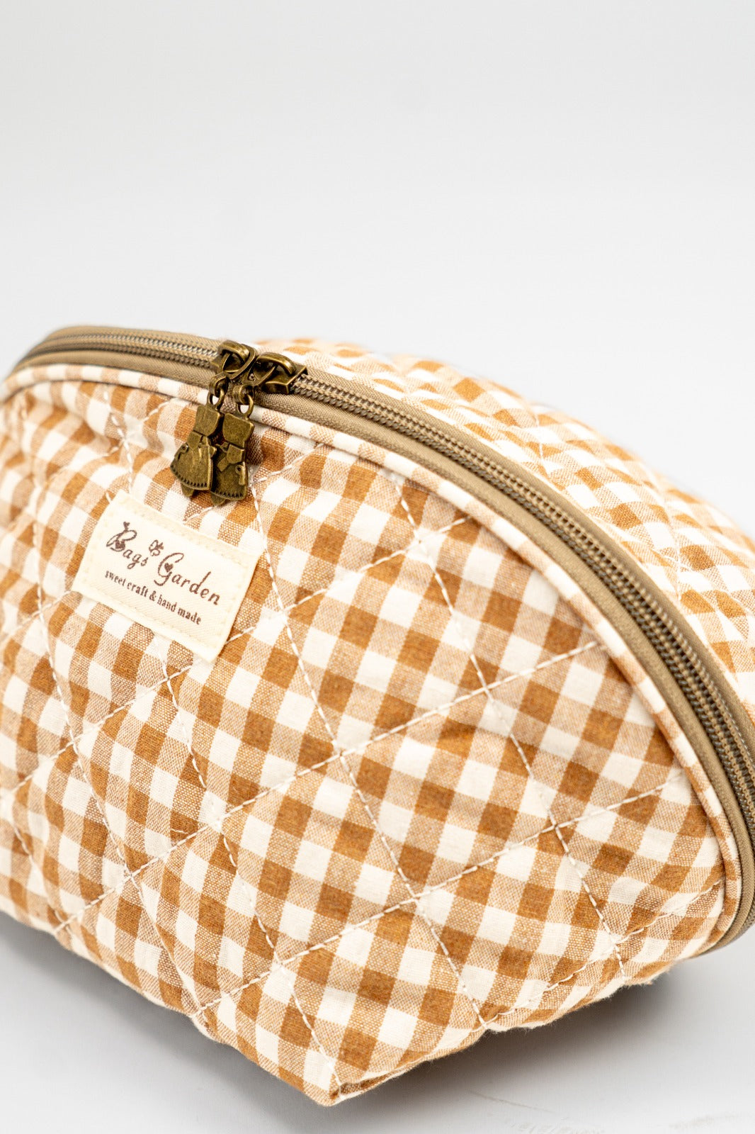 Neceser cierre con cremallera, asa a un lado, en vichy blanco y marrón.