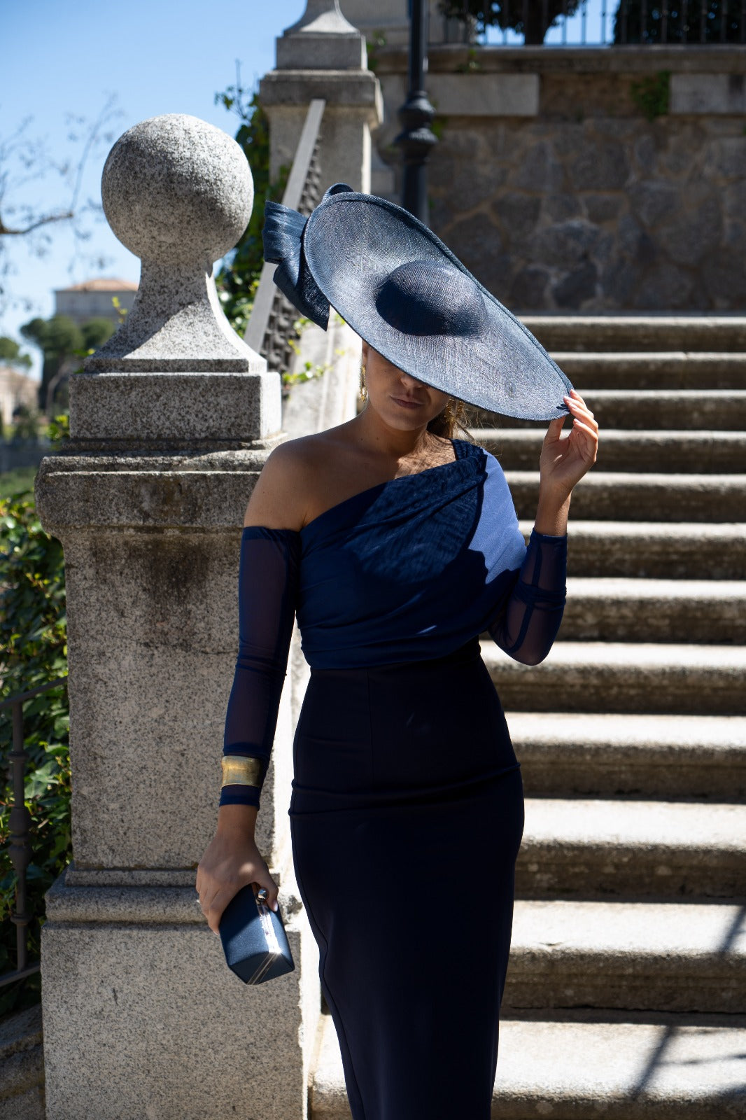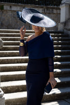 Pamela con base de sinamay de seda, complementada con una elgante lazada en sinamay, en color azul.