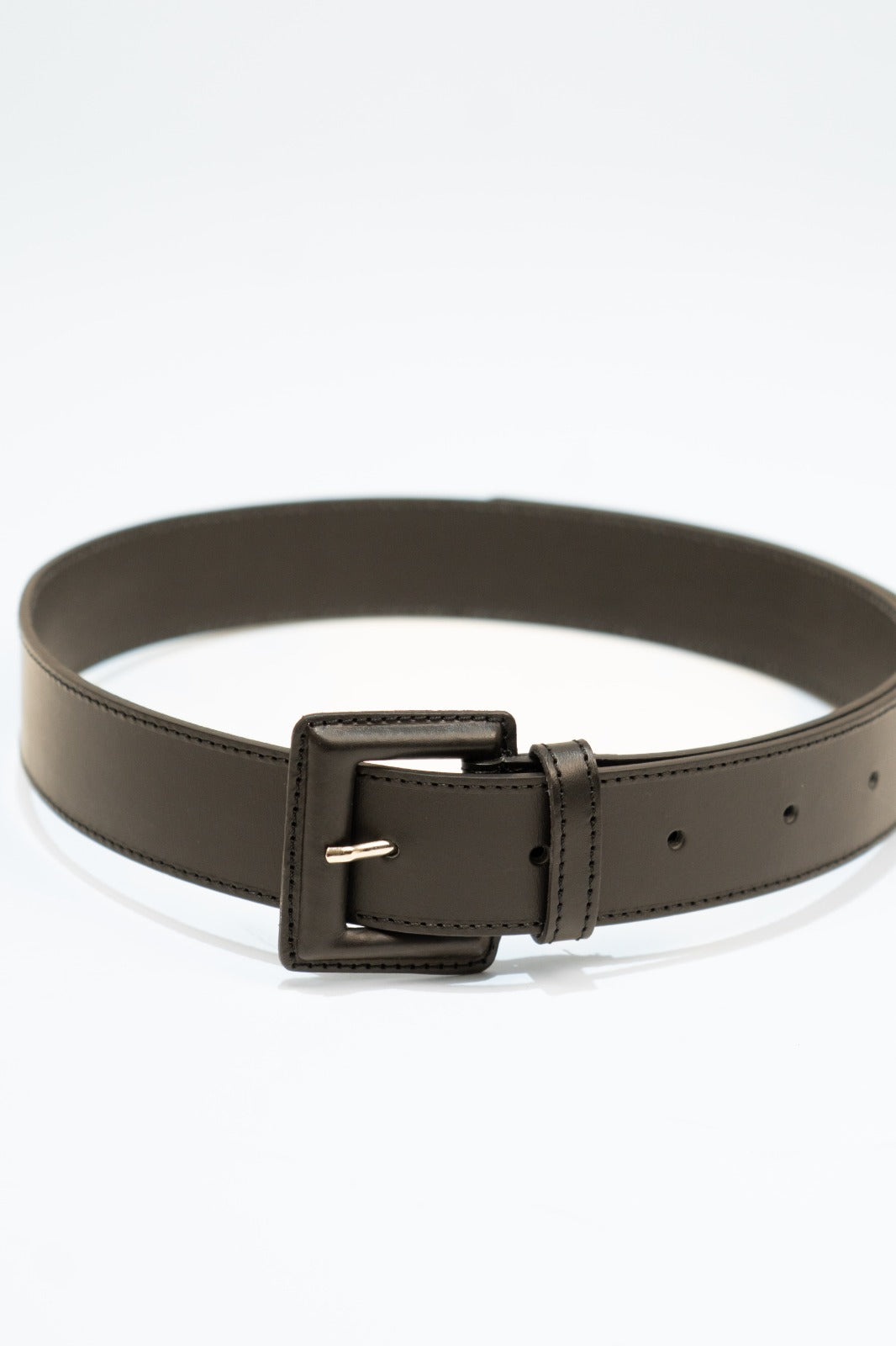 Cinturón confeccionado en piel color negro. Cierre delantero con hebilla forrada en piel.