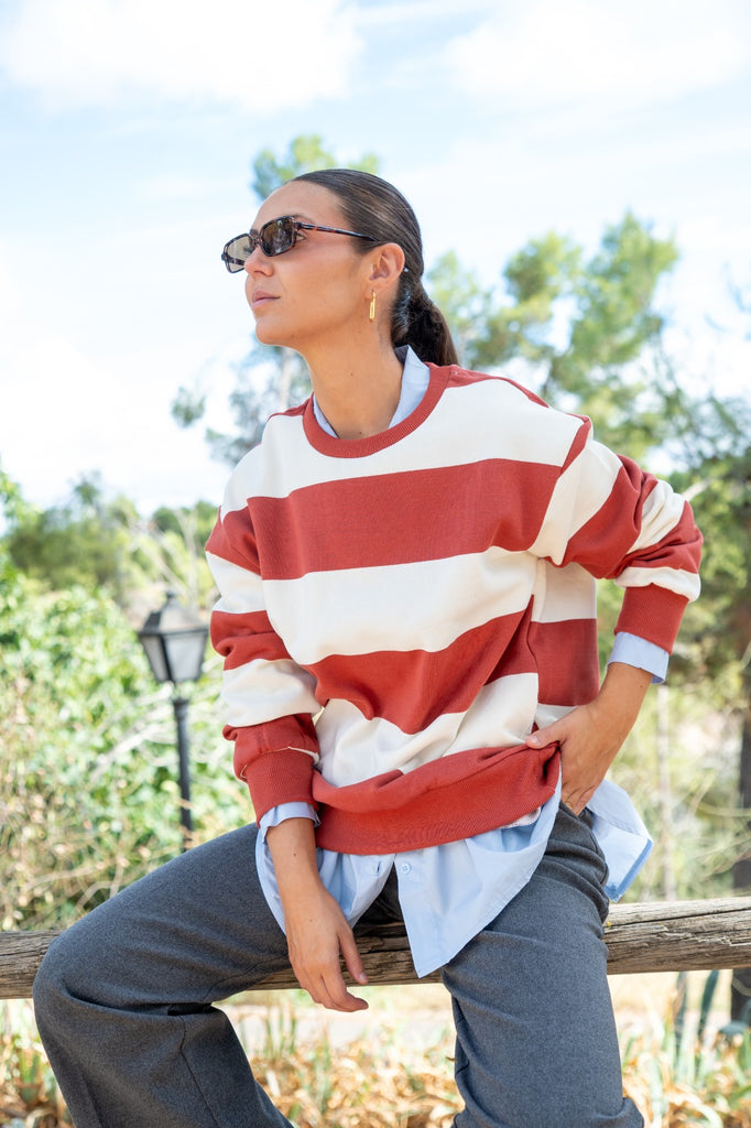 Sudadera escote redondo, bolsillos laterales, a rayas beige y teja.
