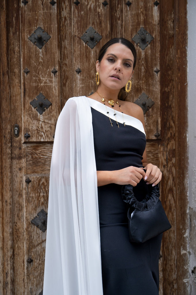 Vestido largo, asimétrico, capa larga en un hombro, abertura delantera en un lado. Bicolor negro y blanco.