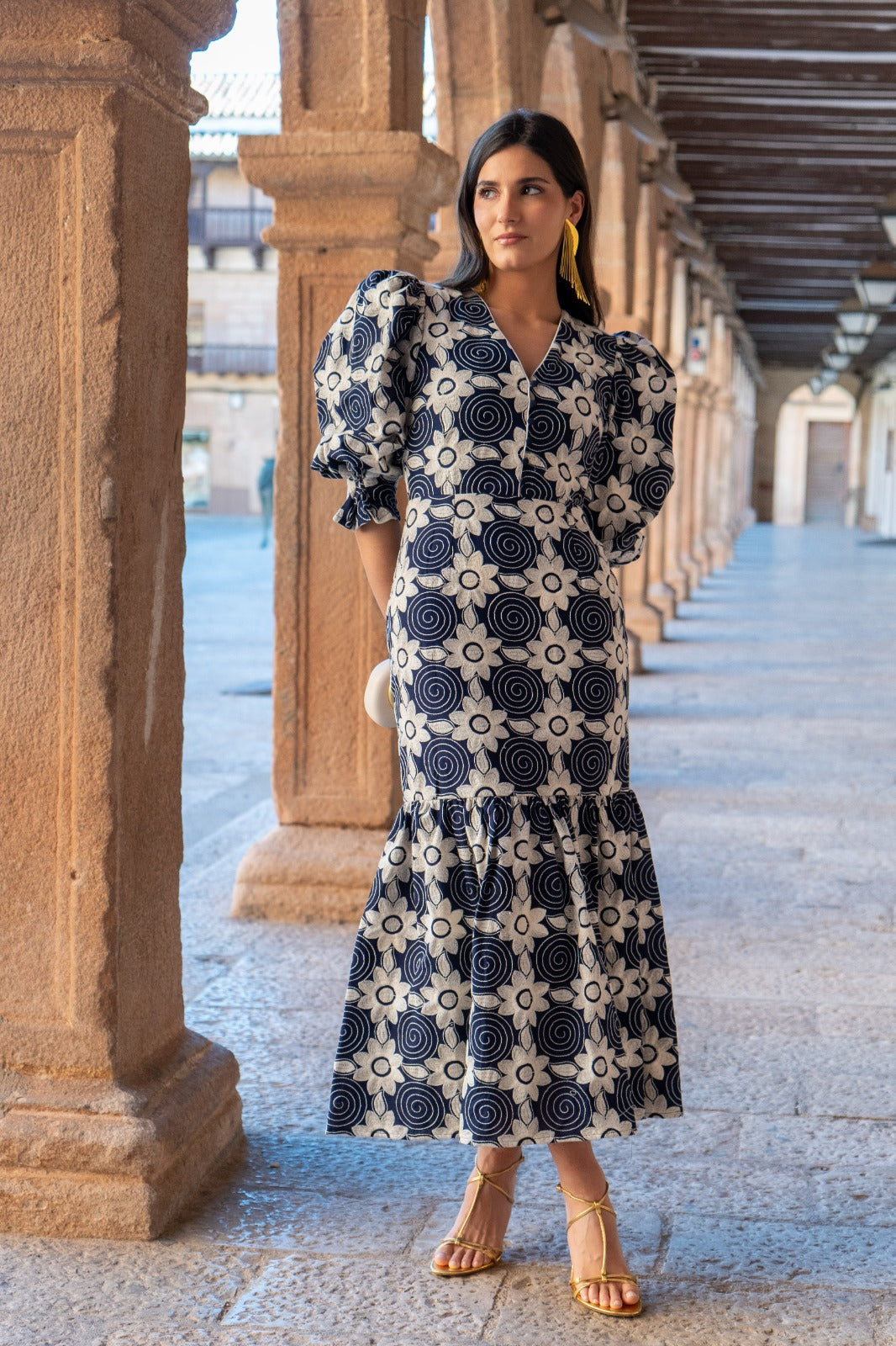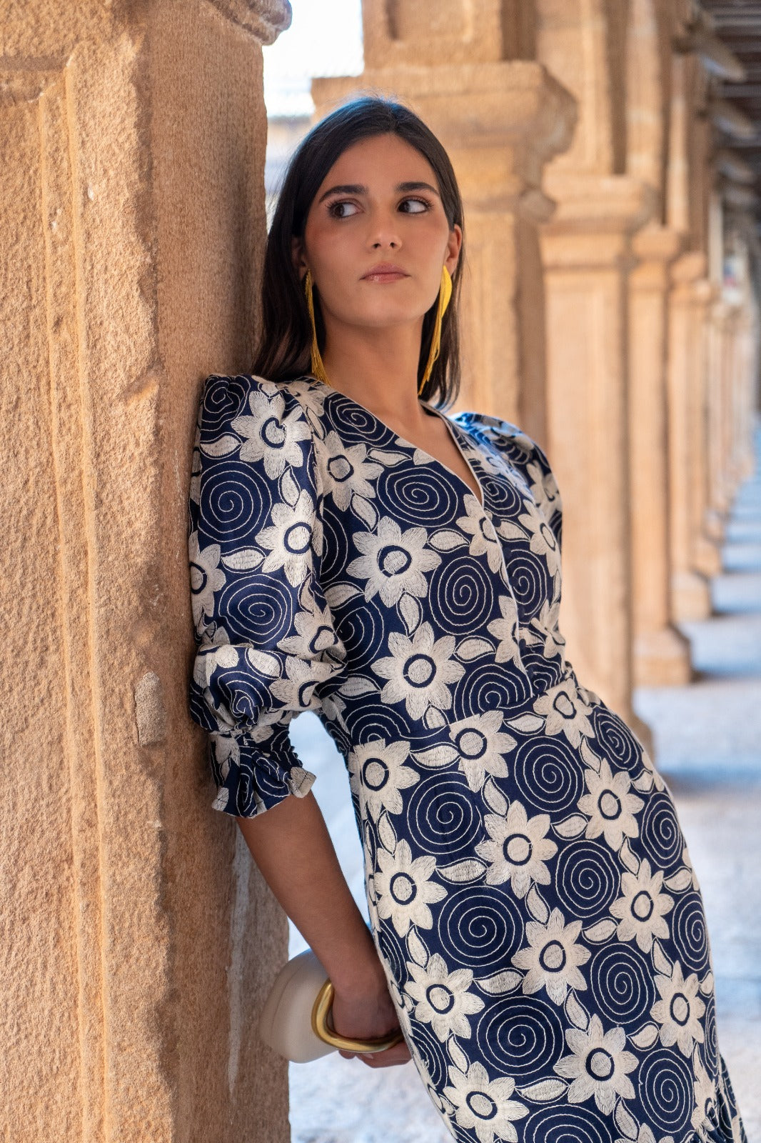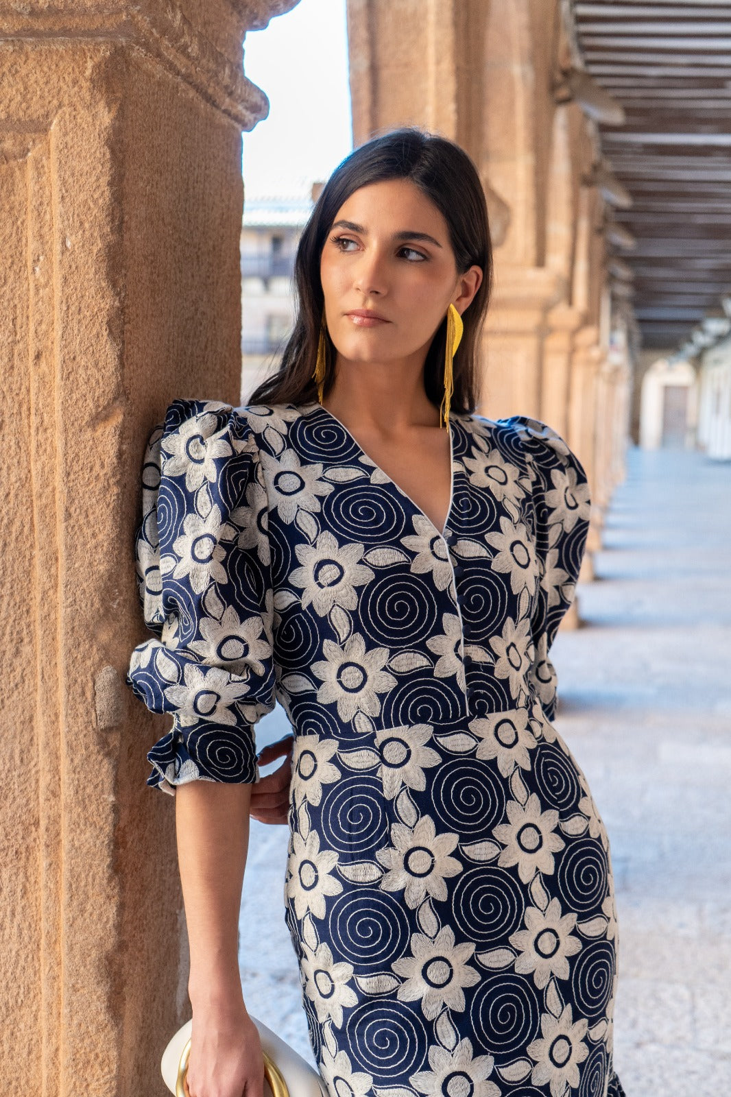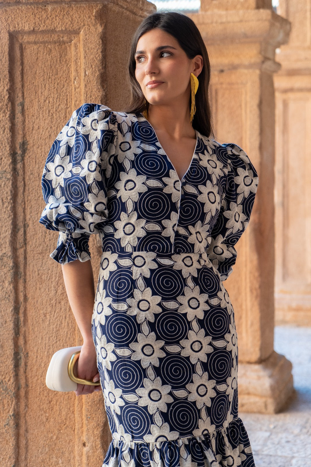 Vestido midi, escote a pico y botones, manga larga con volumen en hombros, entallado, falda con volante a la rodilla. En color azul con dibujo bordado en beige.