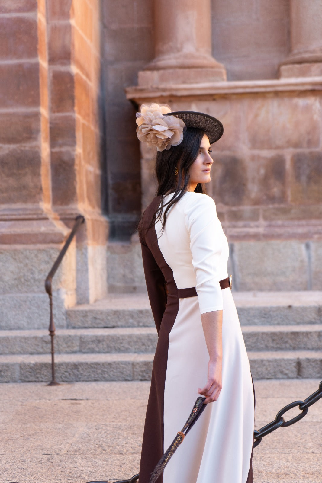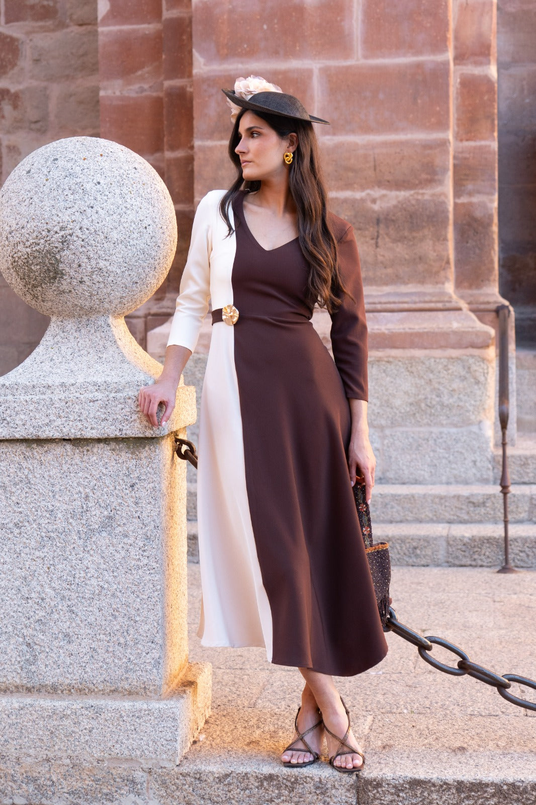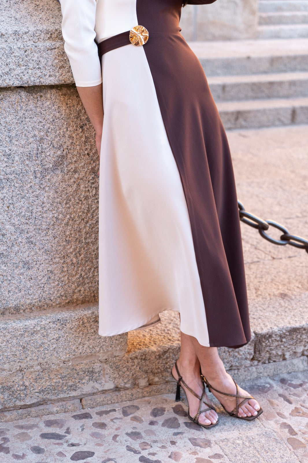 Vestido midi, escote pico, media manga, corte en cintura detalle dorado, evase, falda con movimiento. Bicolor beige y marrón.