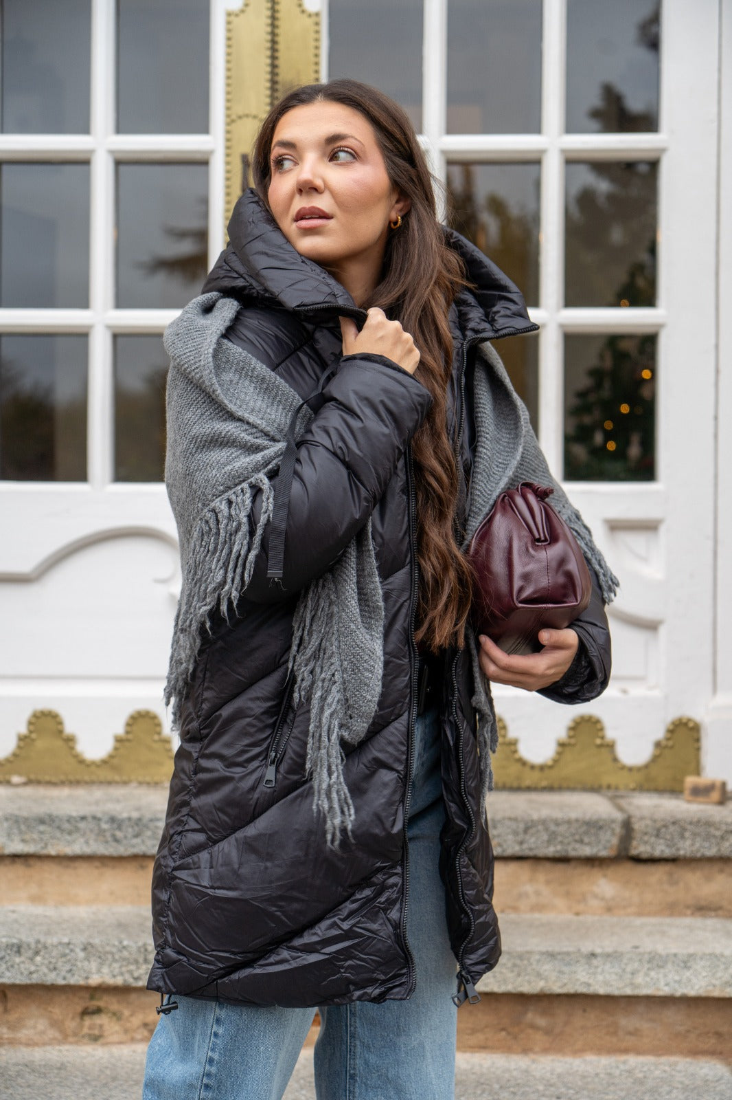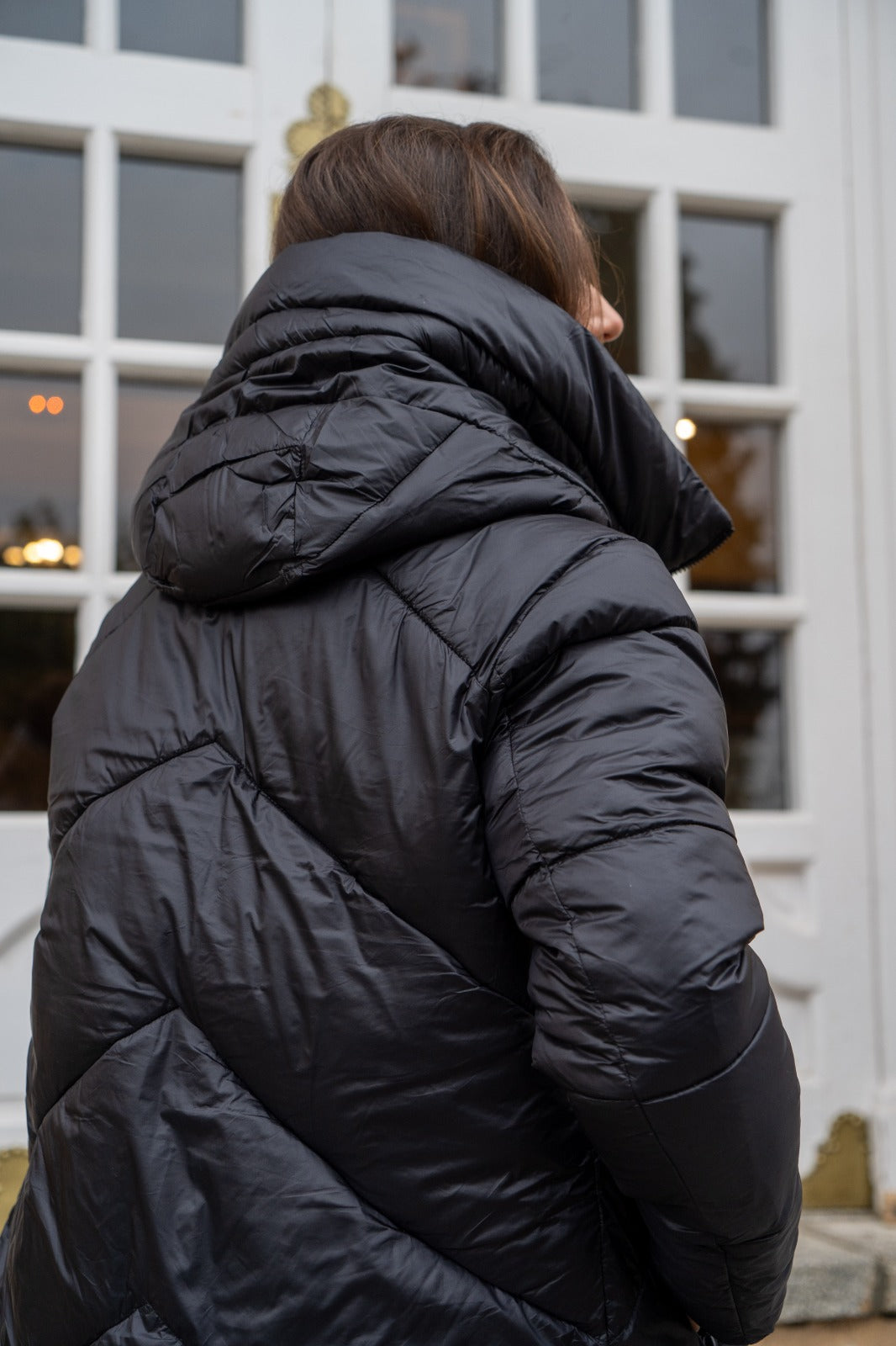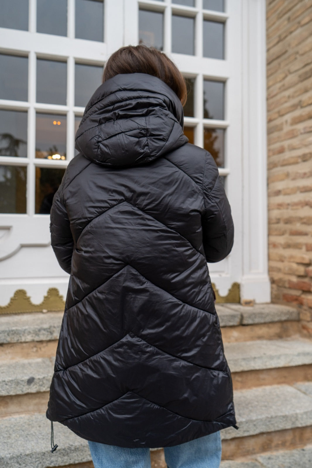 Abrigo, tipo globo, cuello subido con cordón, bolsillos laterales, cierre con cremallera, en color negro.