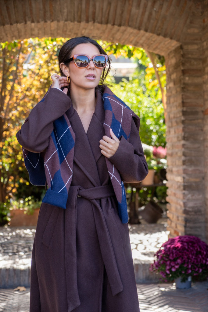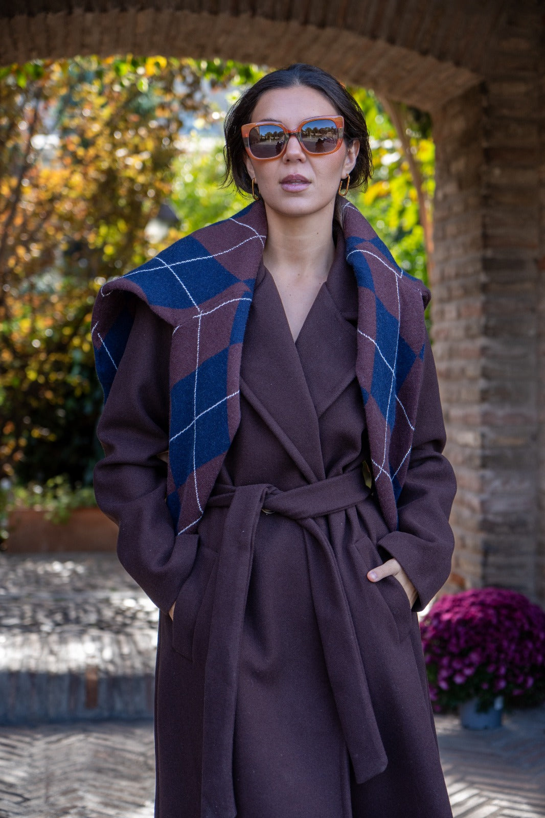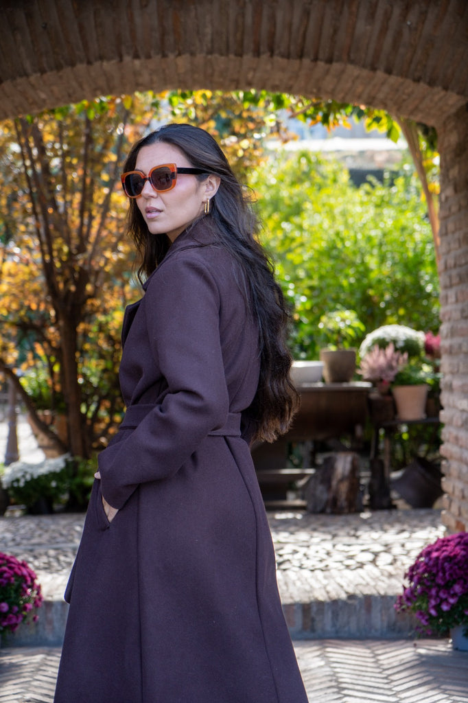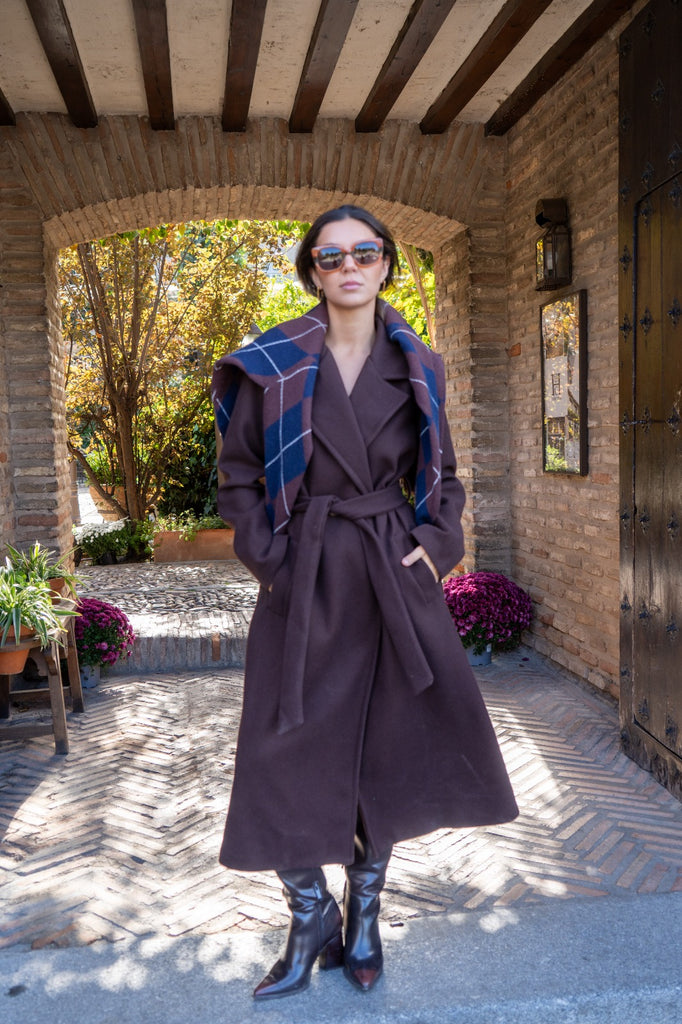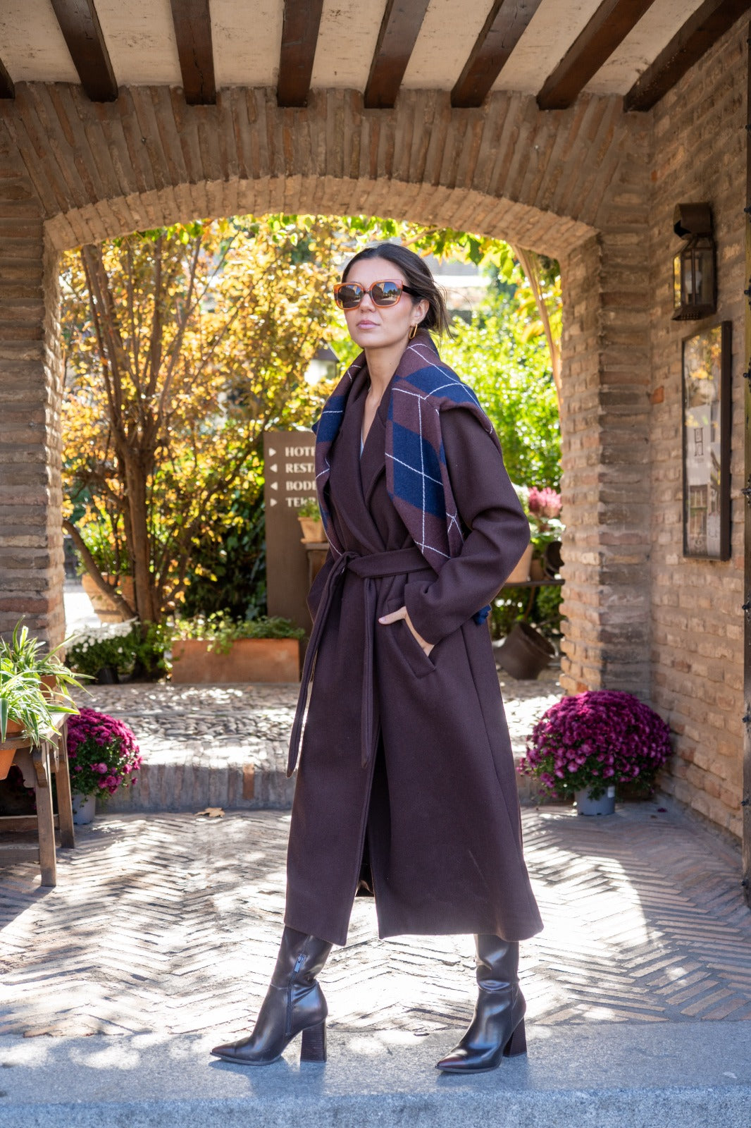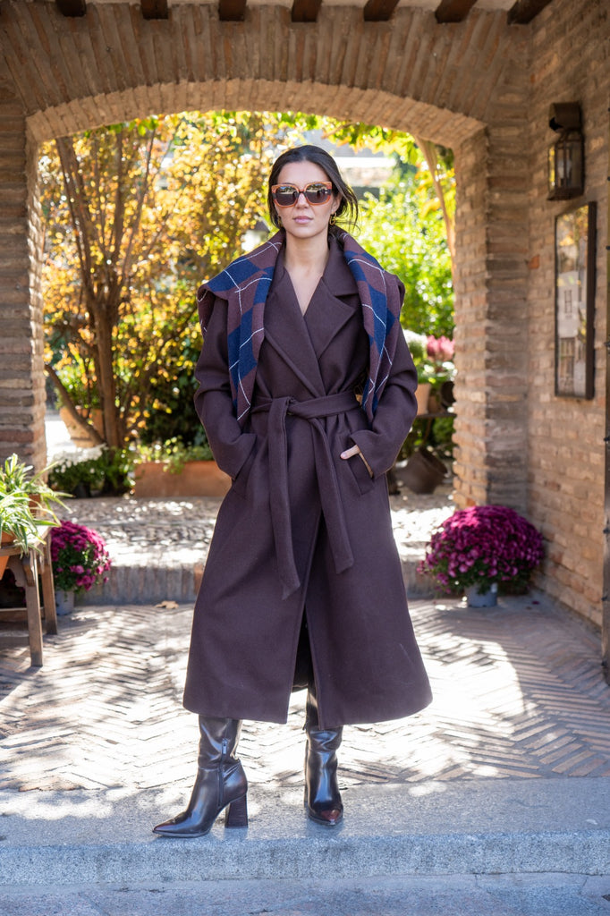 Casaco comprido, tipo lã, quente, com gola de lapela, bolsos laterais e cinto. Na cor castanha.