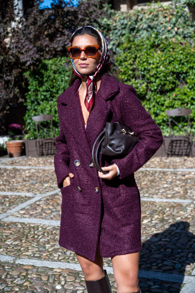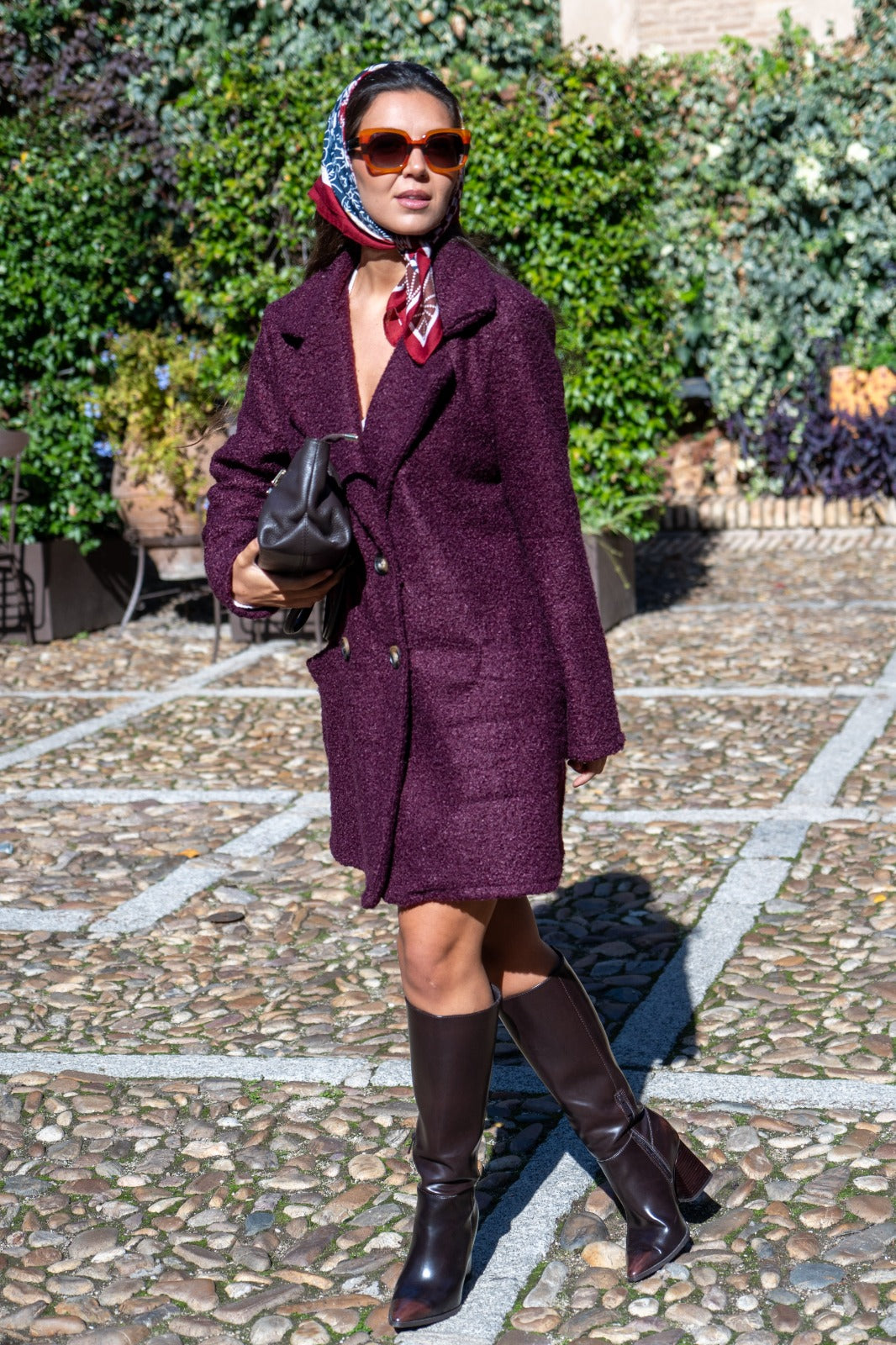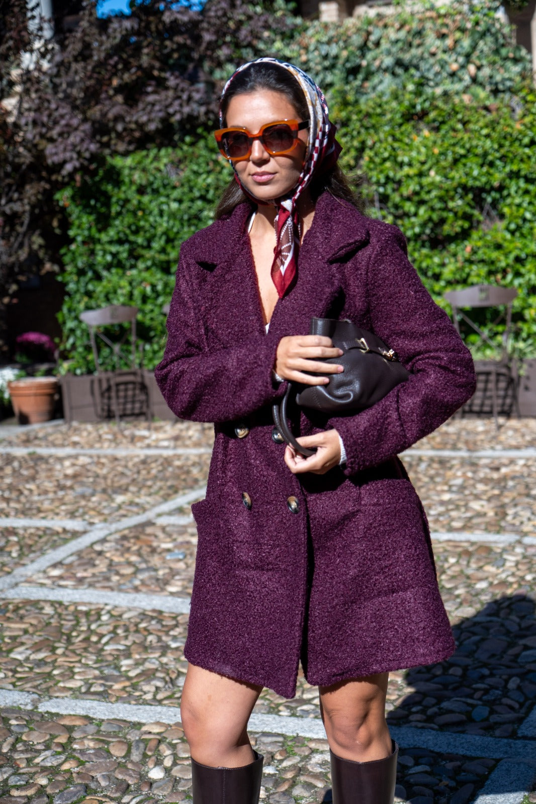 Casaco com gola de lapela, bolsos laterais, corte largo e fecho frontal com botões duplos. Na cor beringela.