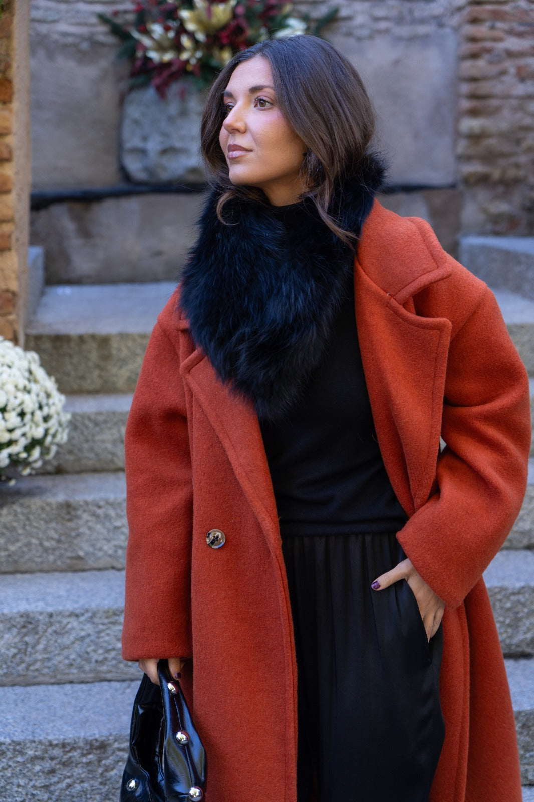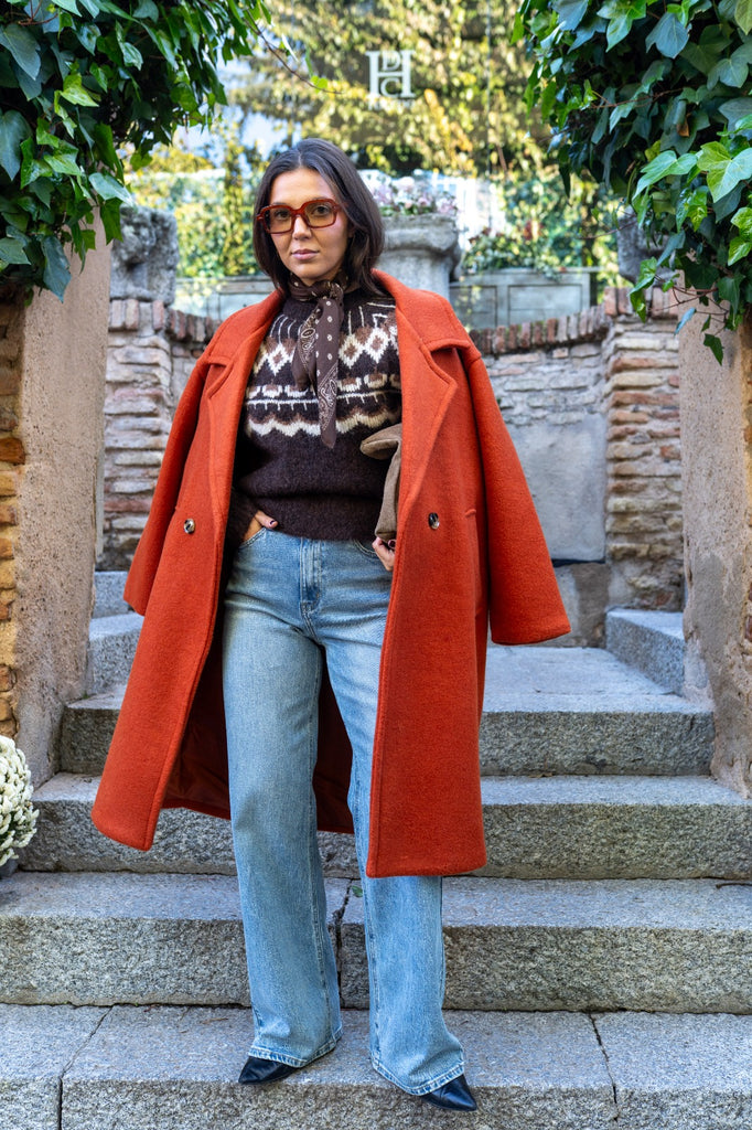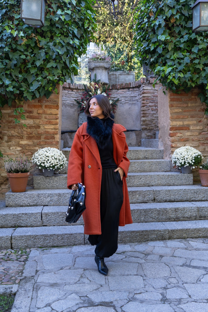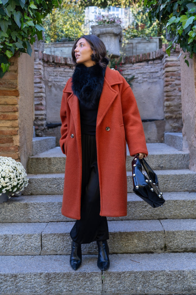 Abrigo tipo paño, calentito, cuello solapa, bolsillos laterales, cruzado con botones. En color naranja.