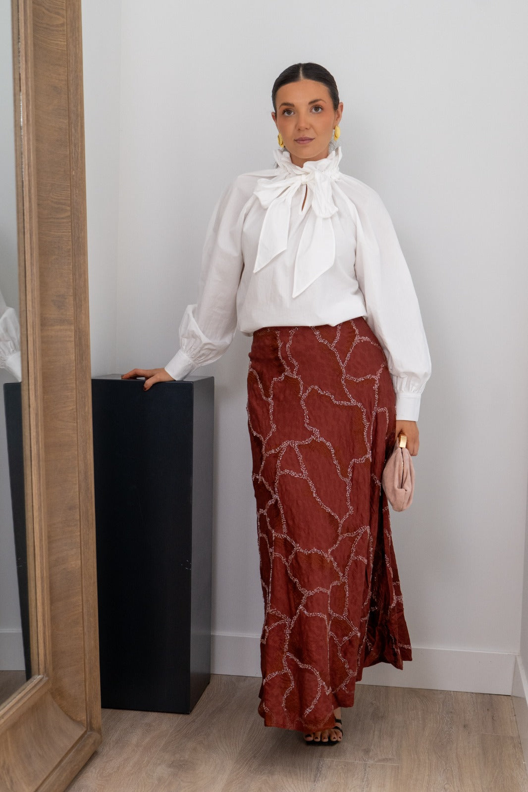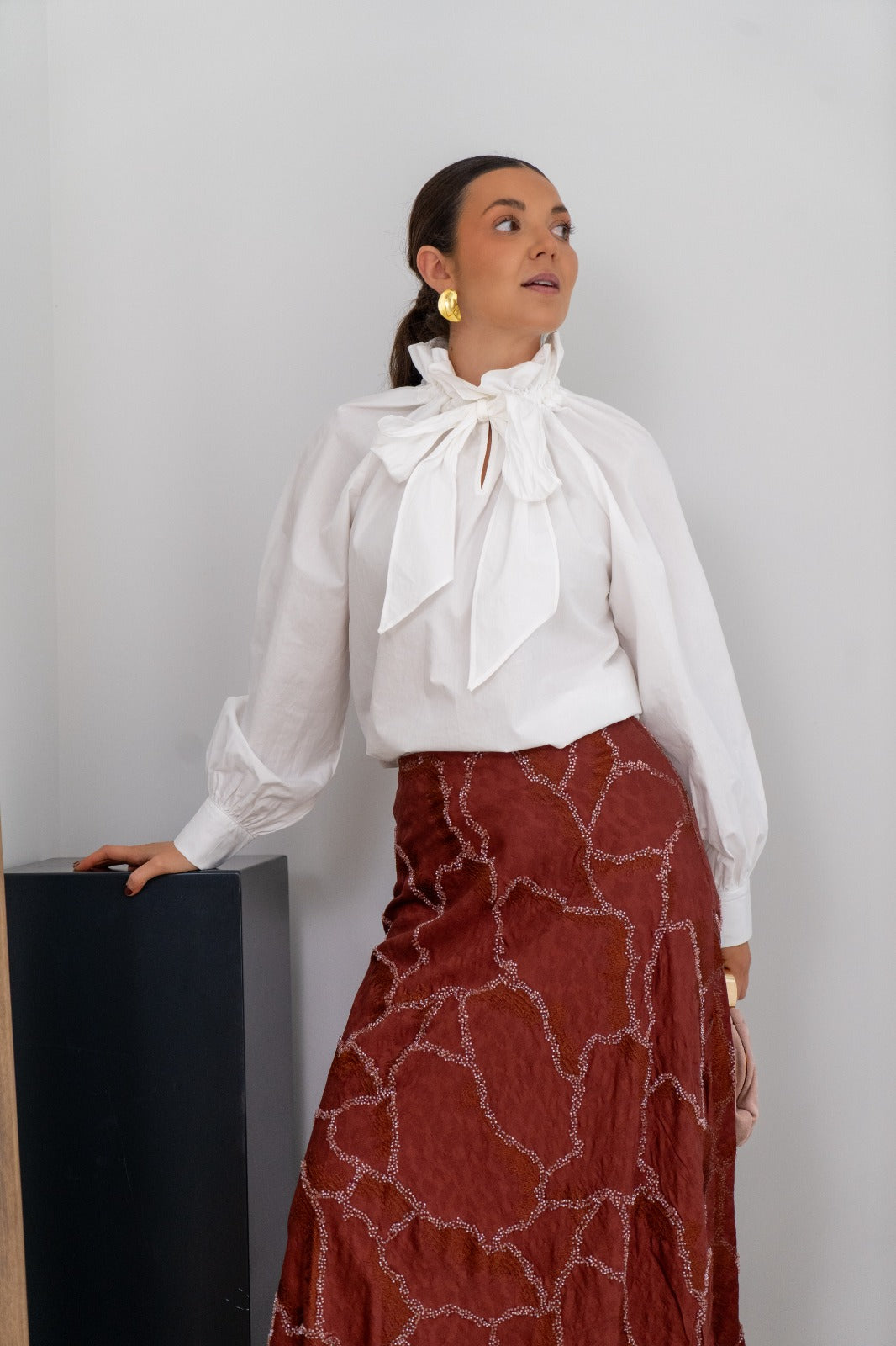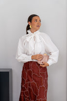 Blusa cuello subido, lazo a un lado, manga larga con puño. En color blanco.