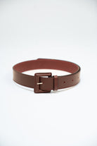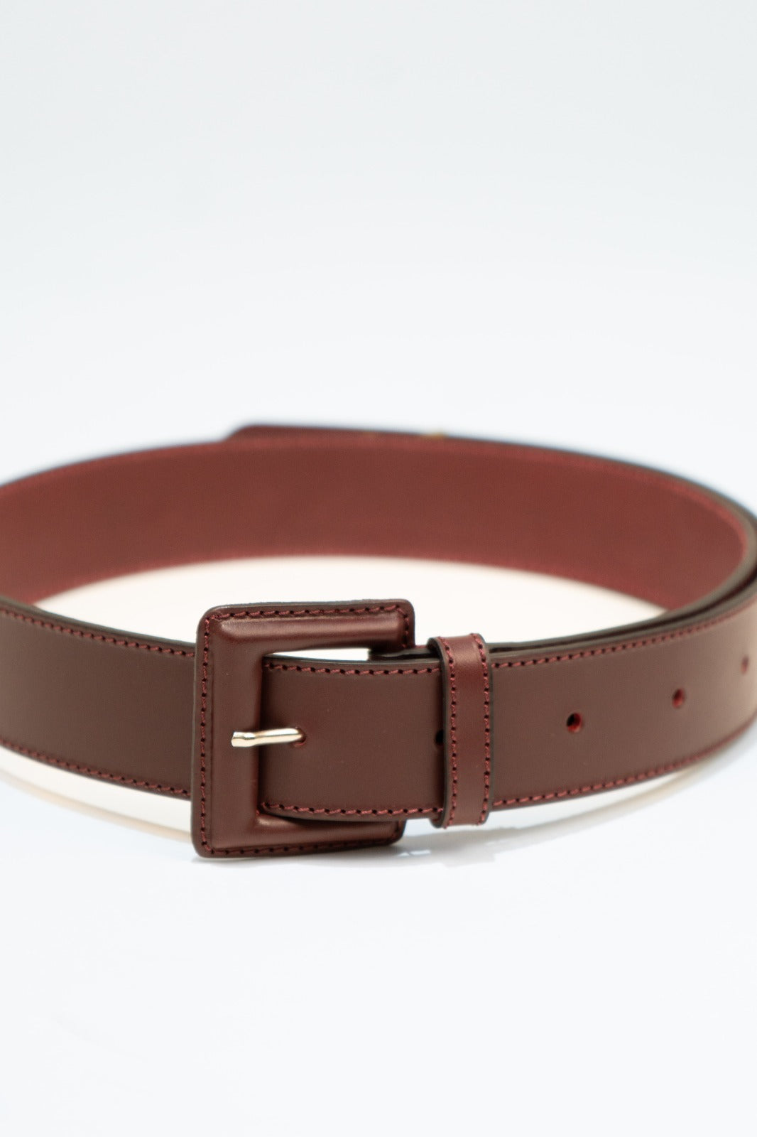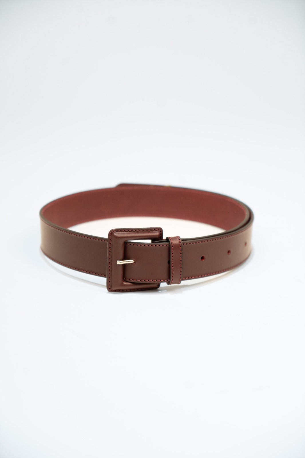 Cinto em pele cor de vinho. Fecho frontal com fivela revestida a pele.