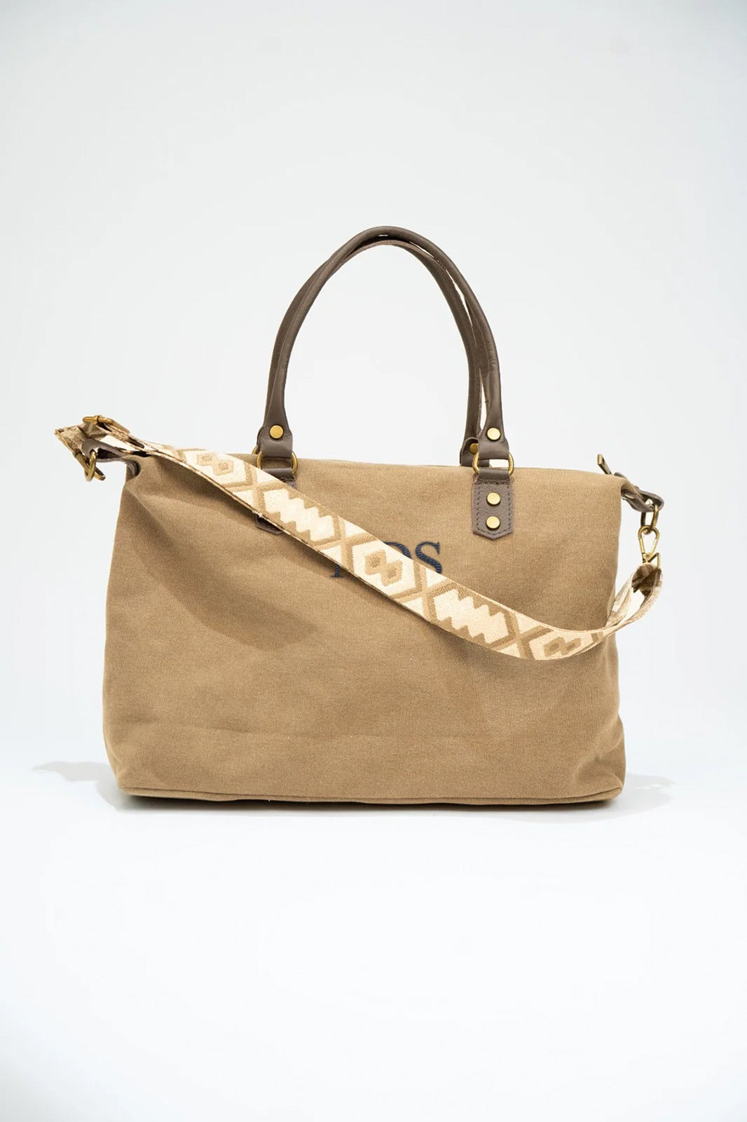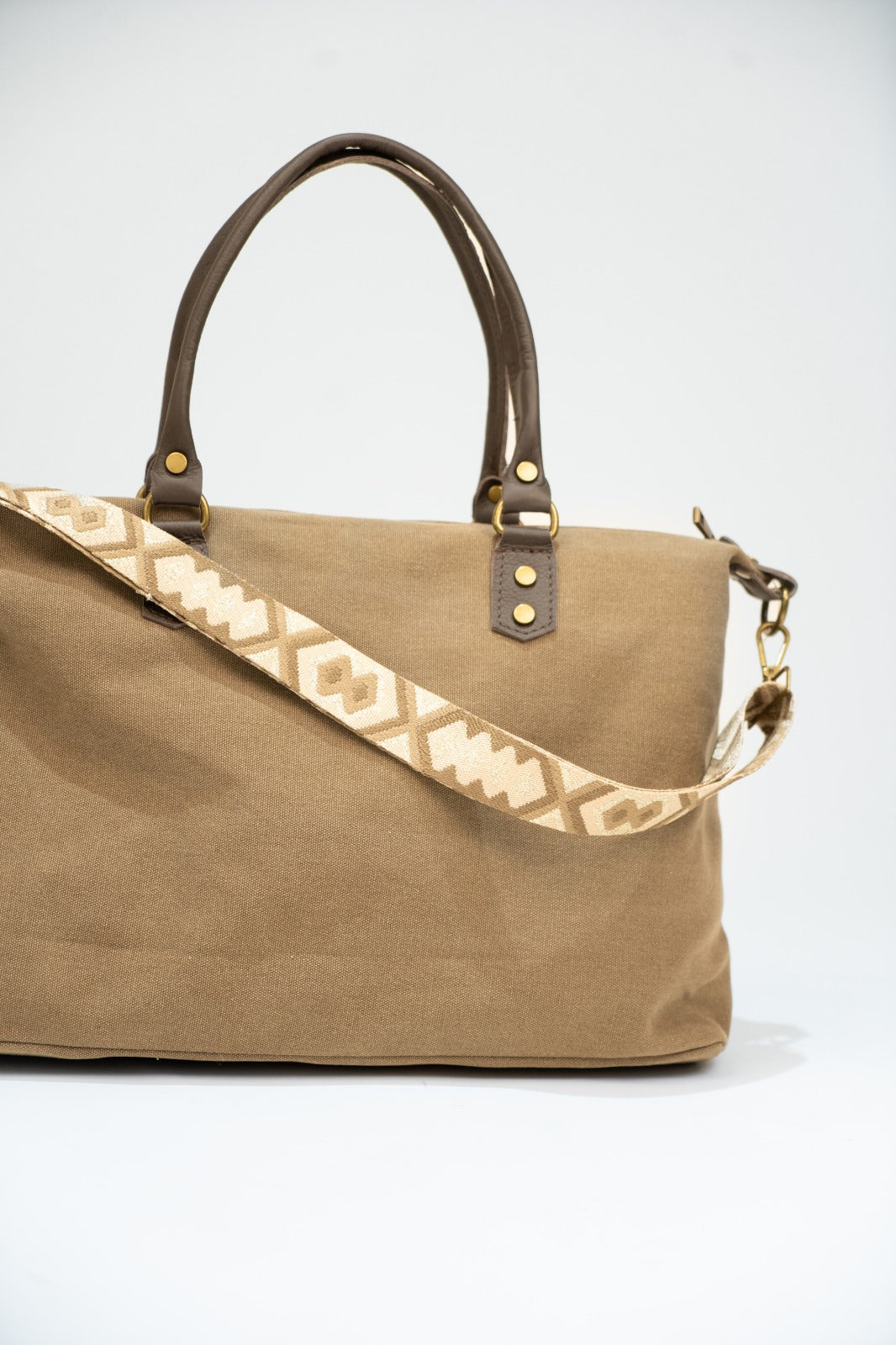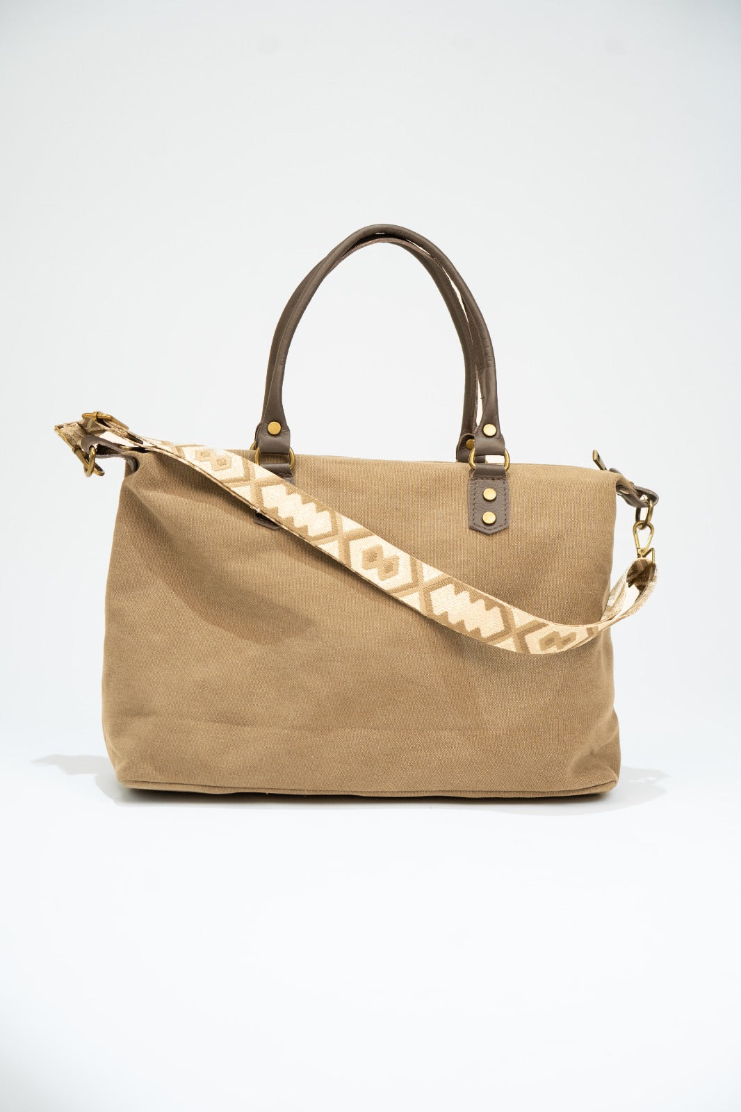 Saco em lona com alças fixas em pele e alça removível e ajustável em algodão castanho-chocolate. Fecho de correr, forro preto e bolso interior. Tons terra.