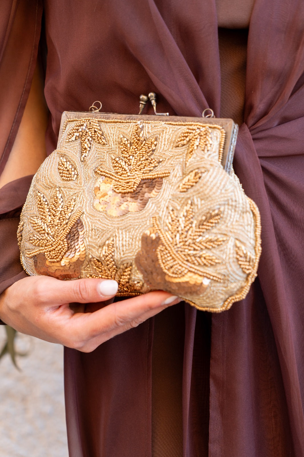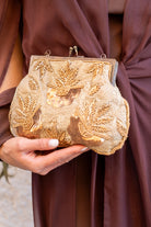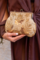 Bolso cierre cruzado dorado, con cadena para colgar, en color beige con abalorios y lentejuelas.