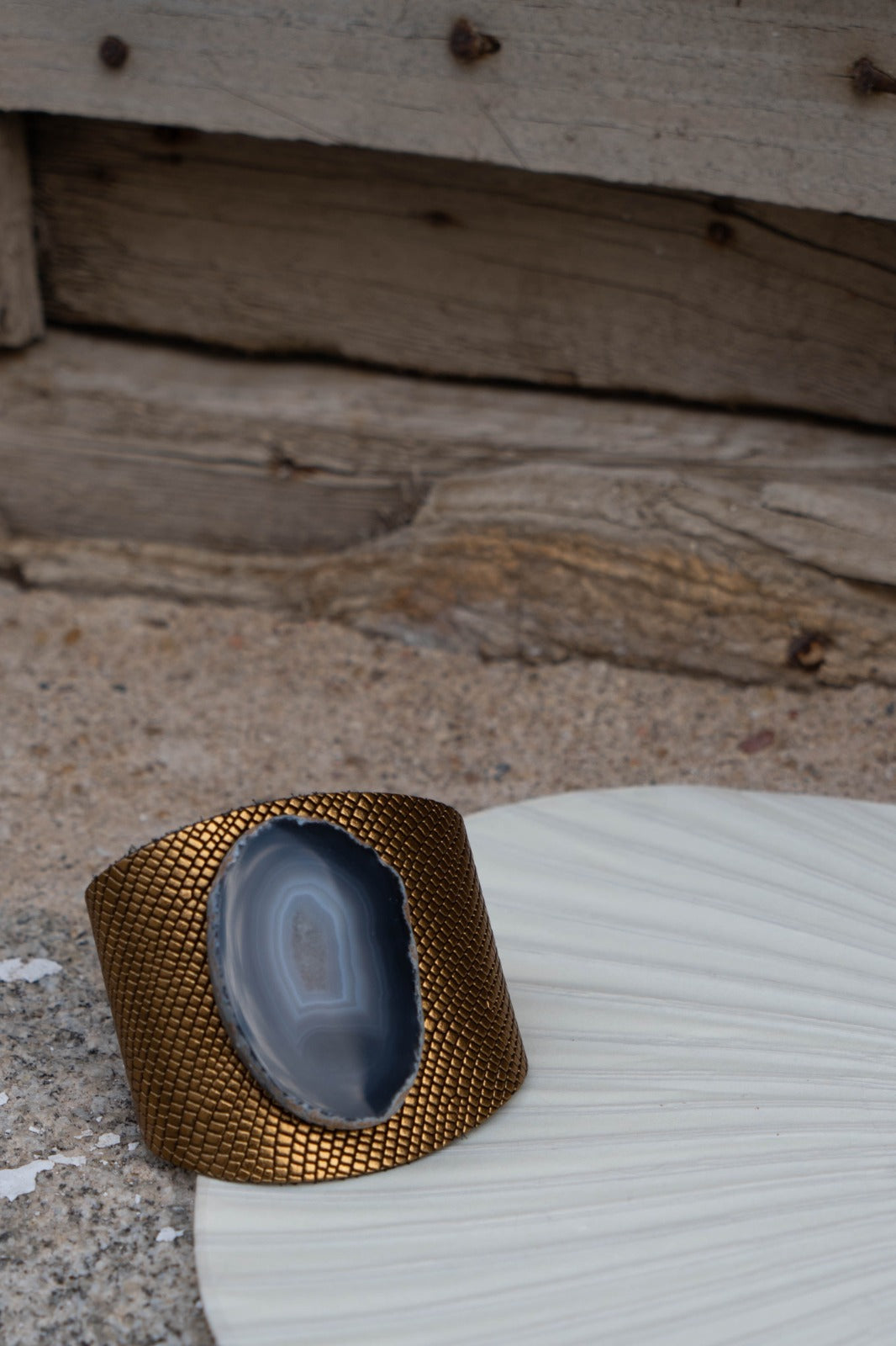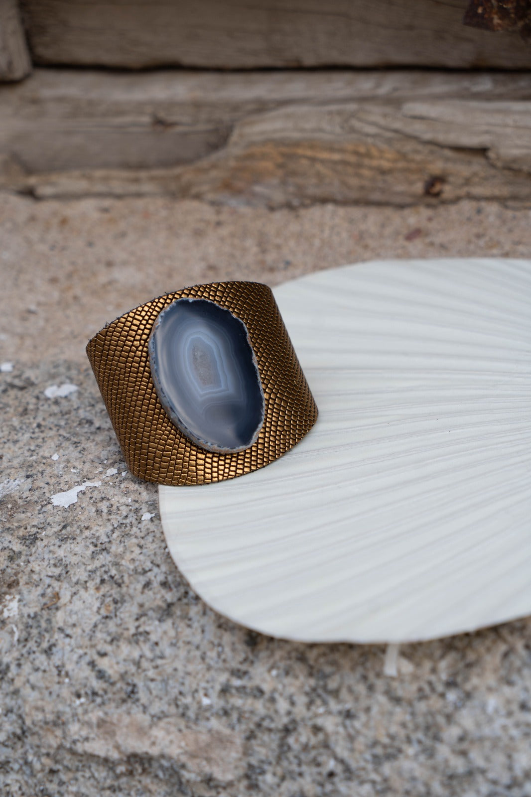 Pulseira, pulseira em couro, peça metálica gravada com pedra natural. Na cor dourada.