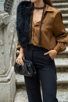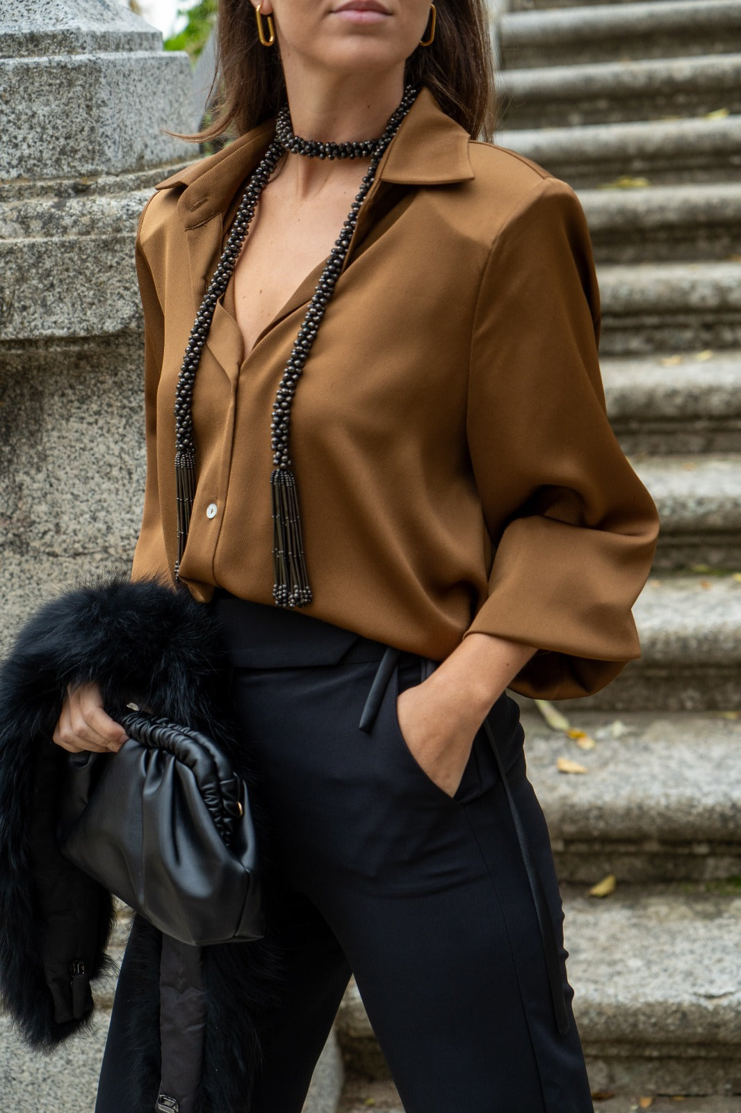Camisa básica em cetim, manga comprida com punhos, botões em madrepérola, em castanho.