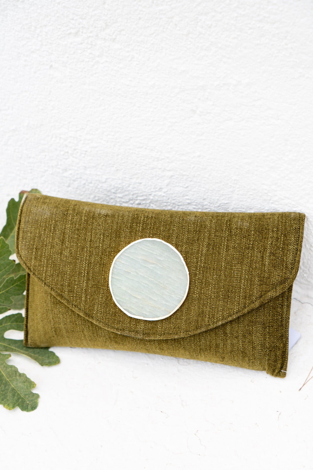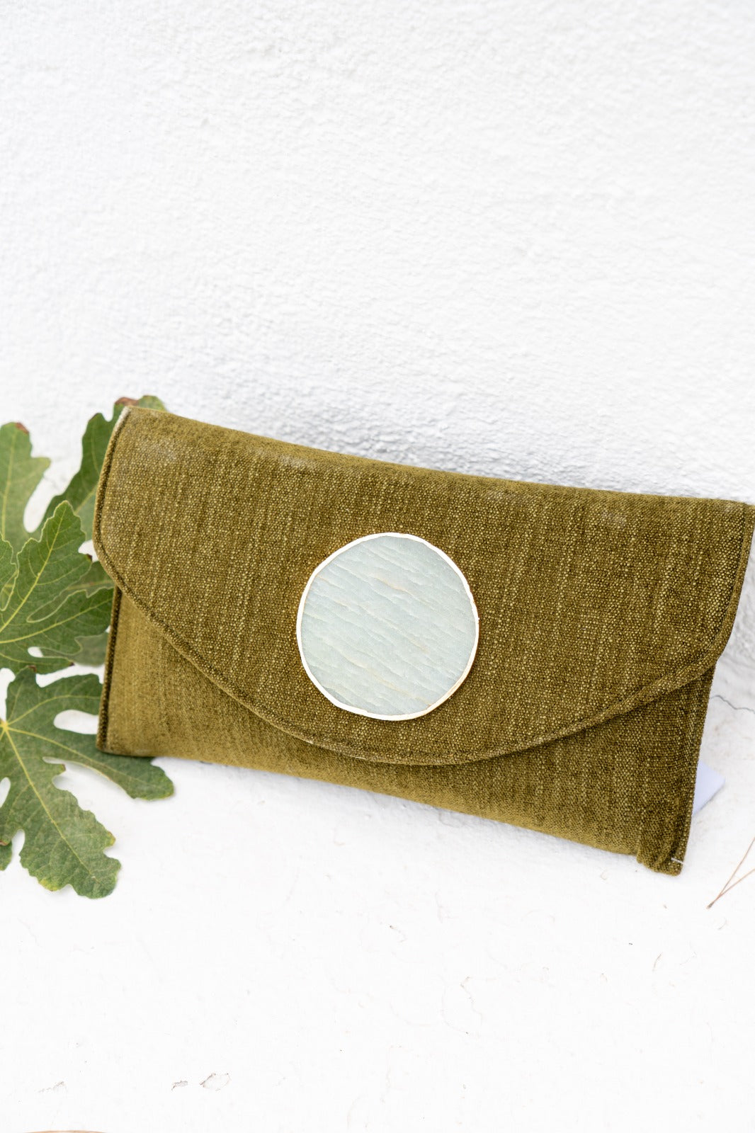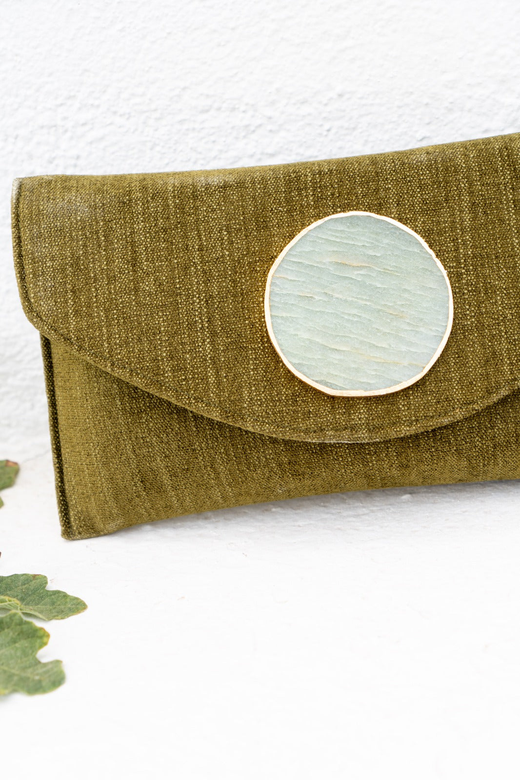 Bolsa carteira comprida em formato de envelope, confecionada em tecido macio, com detalhe de pedra ao centro, fecho magnético e alça de corrente dourada. Na cor verde.