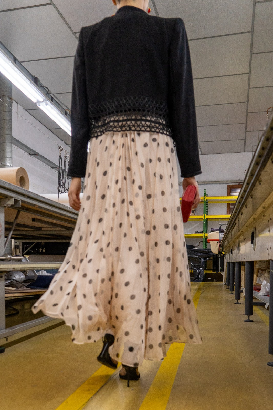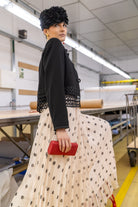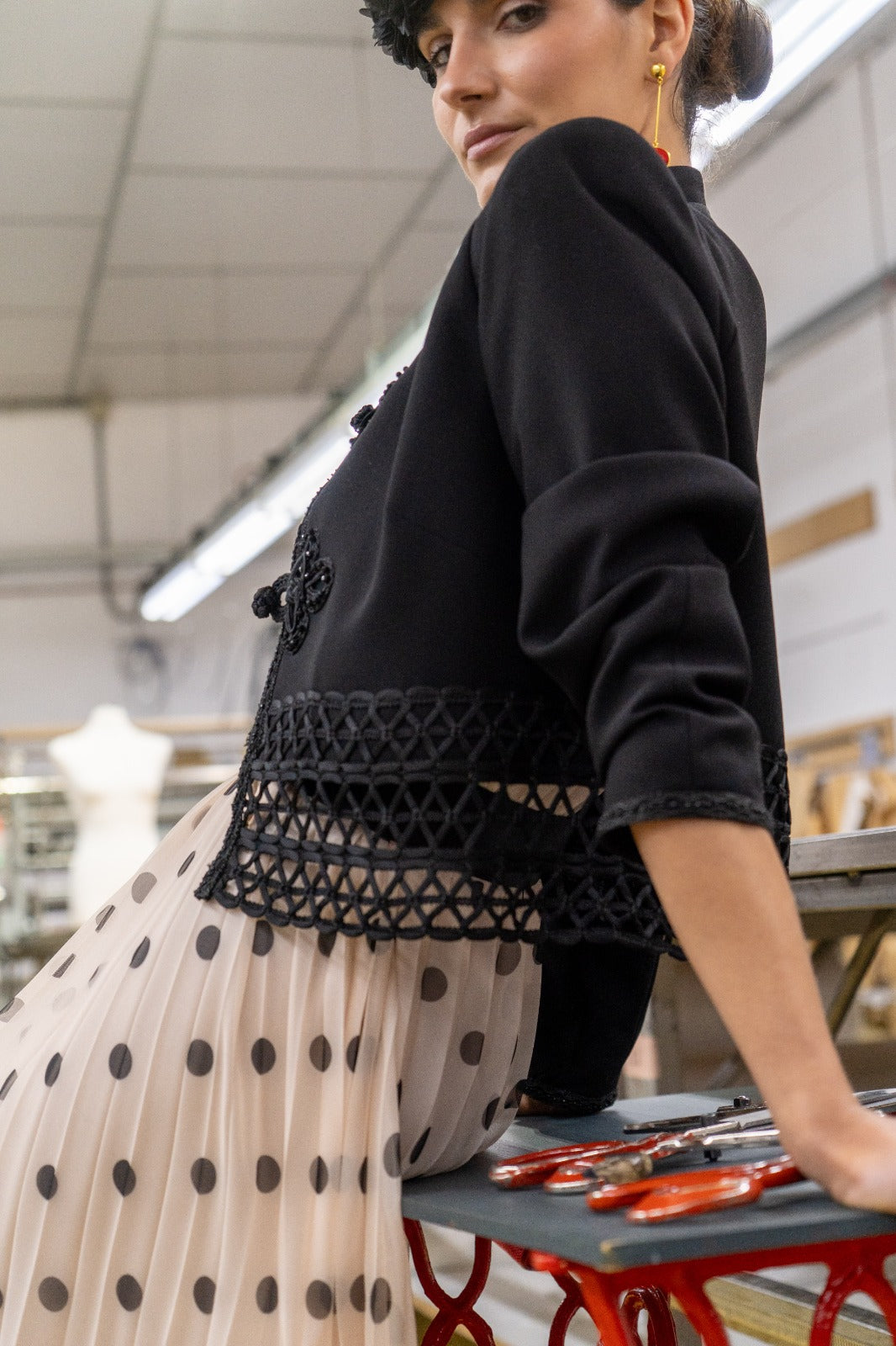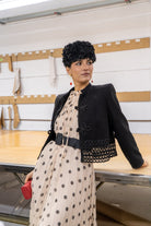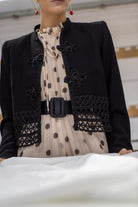 Chaqueta corta en color negro con detalle de cierre alamares, cuello mao, manga larga, bajo en guipur. En color negro.