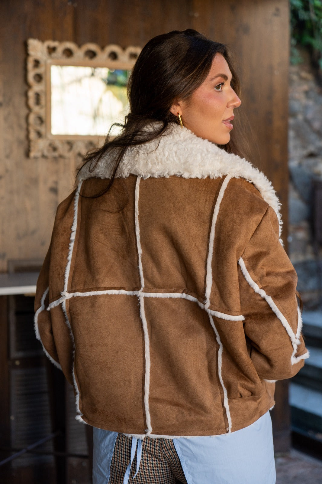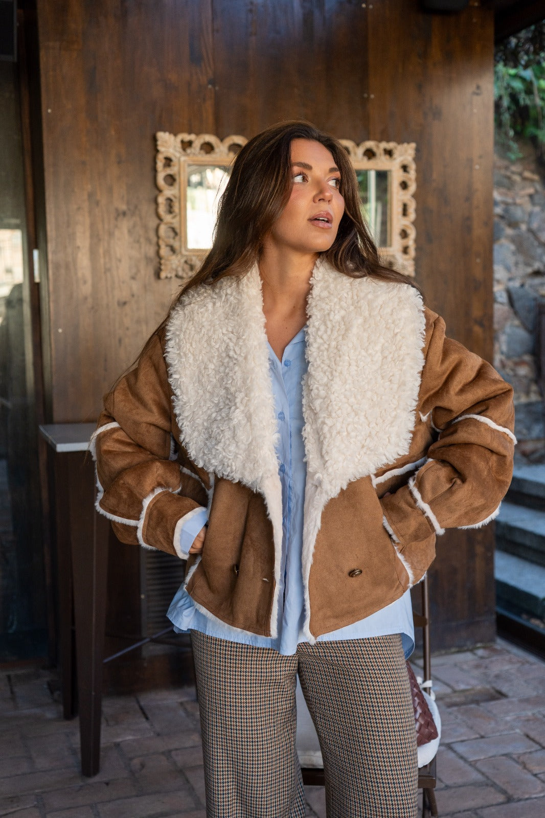 Chaqueta corta, cuello con borreguito blanco, cruzada con botones, bolsillo lateral, en color camel, con detalles borrego blanco.