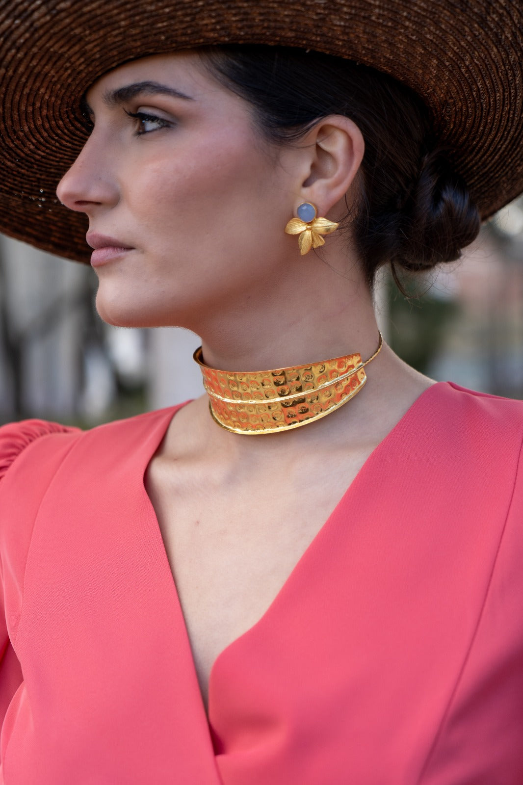 Choker en forma de hoja, ancho por delante y cordón fino por detrás, en color dorado.