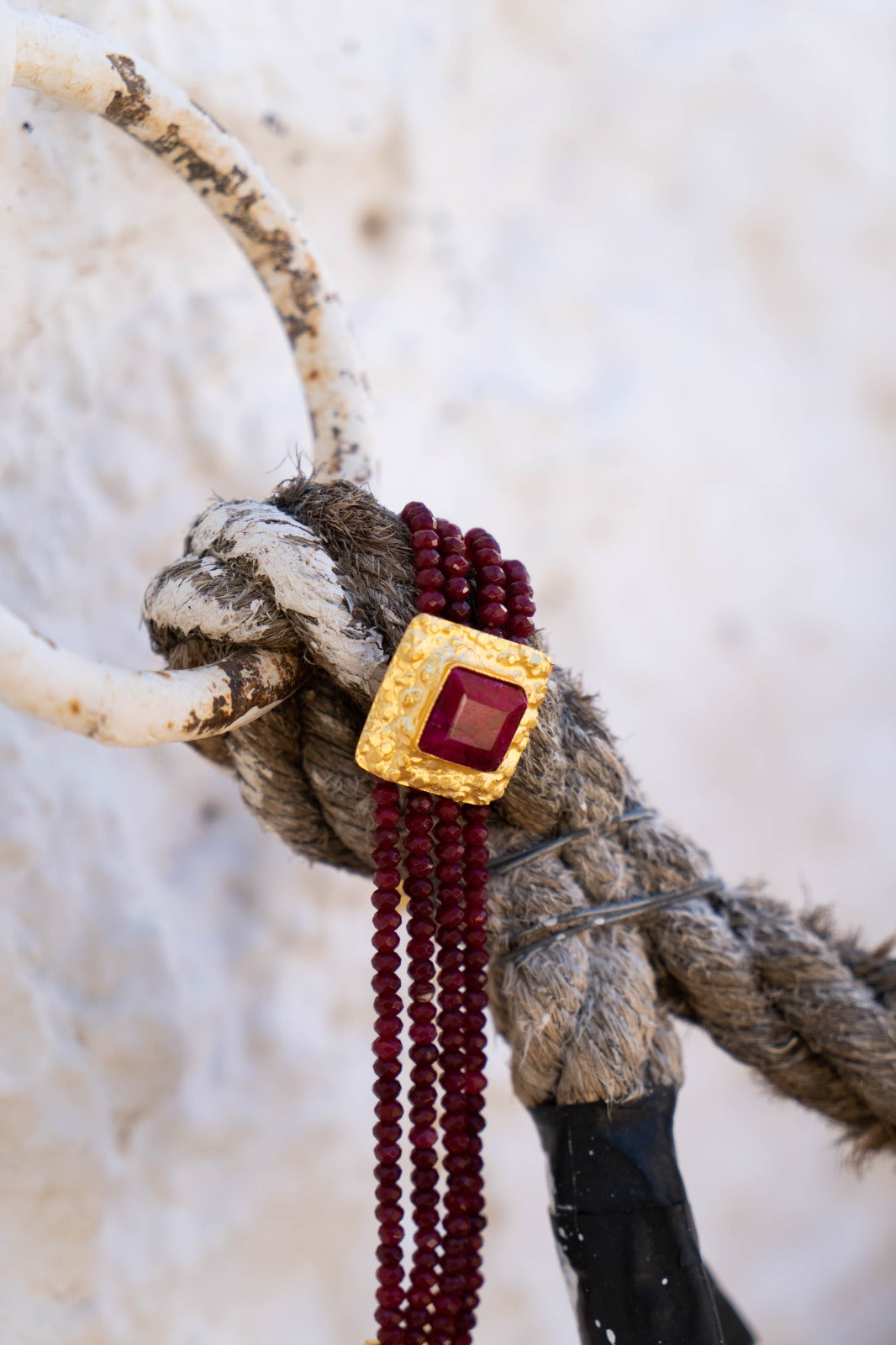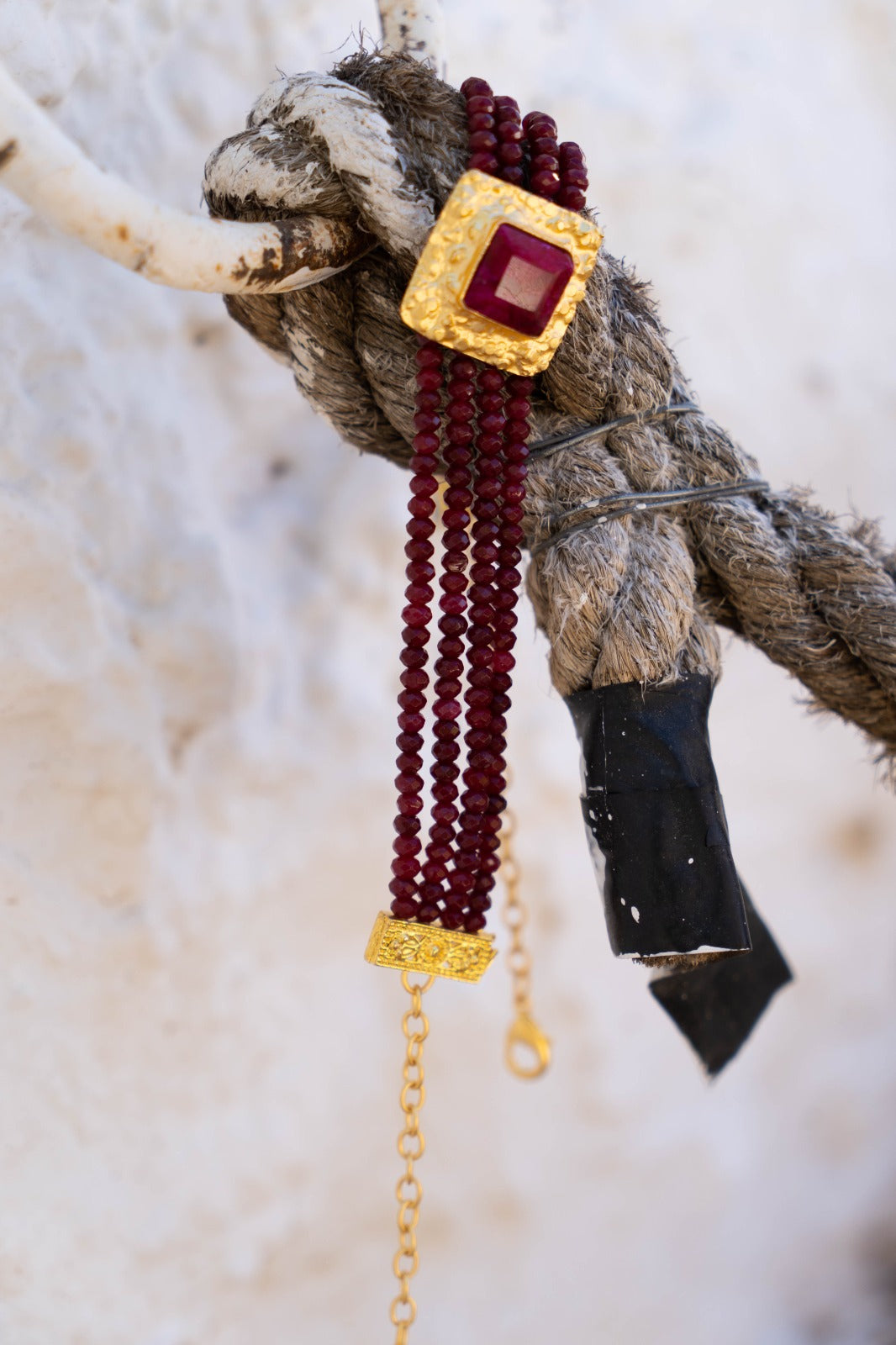 Gargantilha composta por quatro fileiras de pedras e um quadrado no centro com uma pedra grande, feita à mão peça por peça.