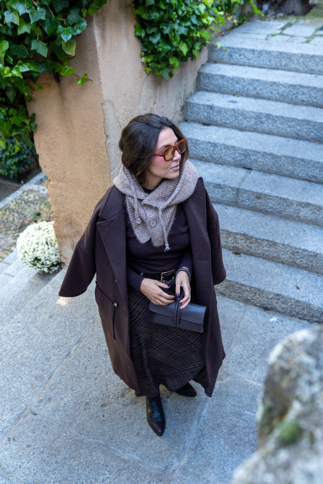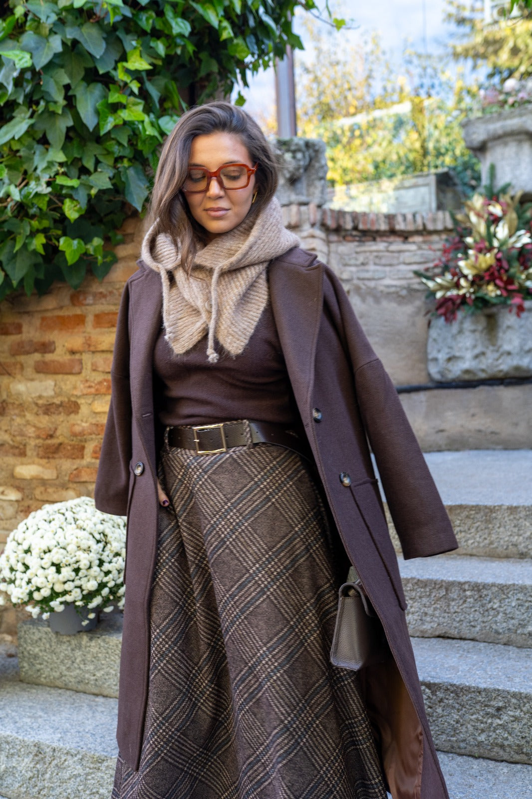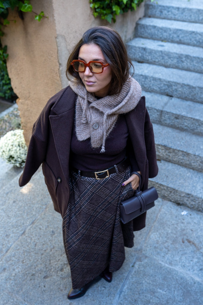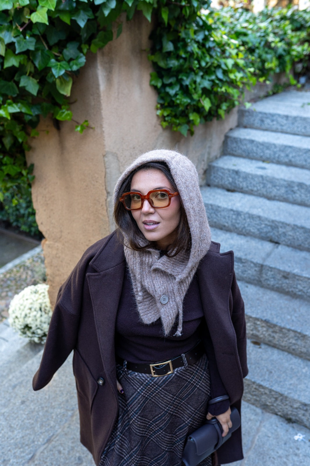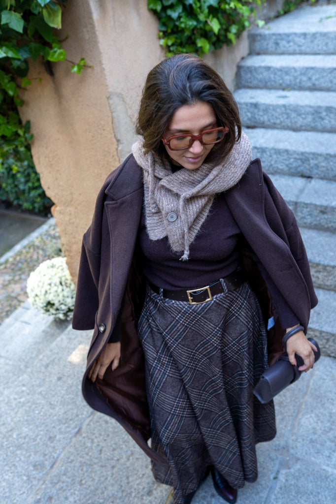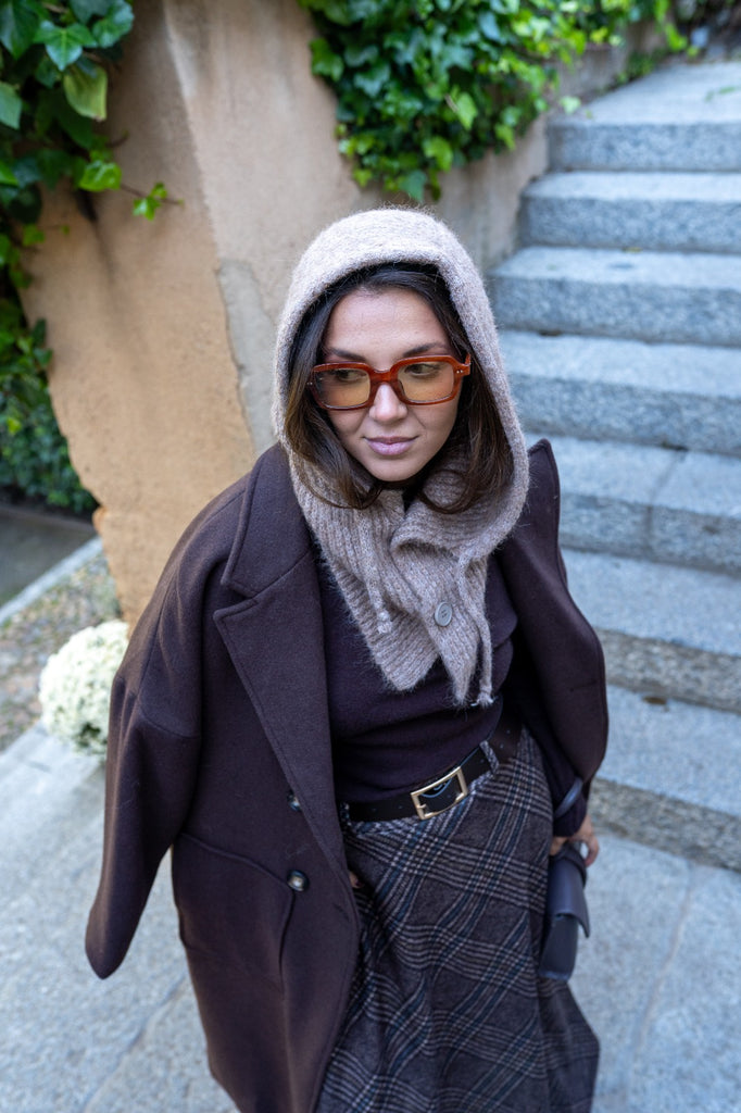 Combinación de gorro y bufanda, con botones en el cuello, en color topo.