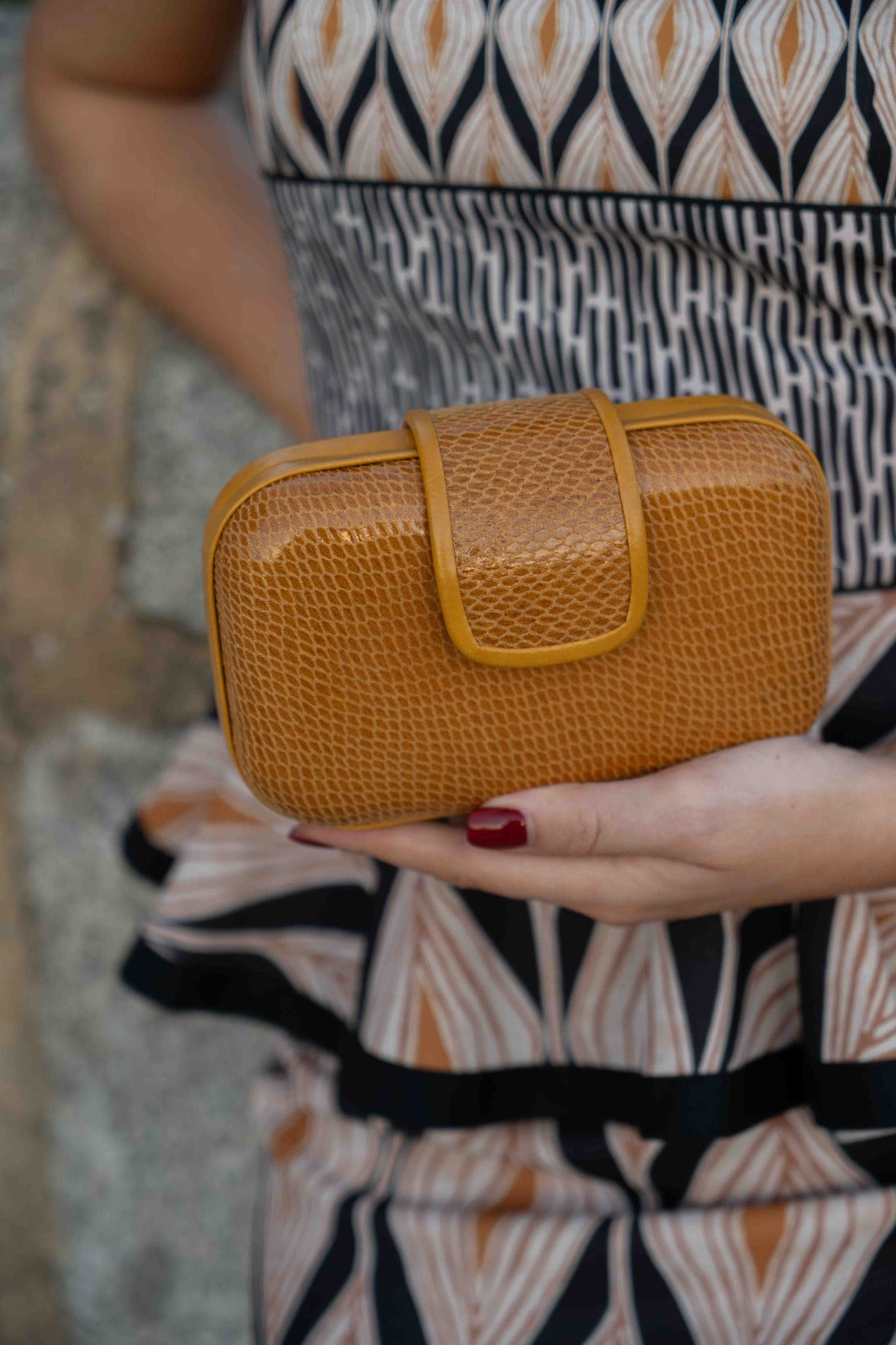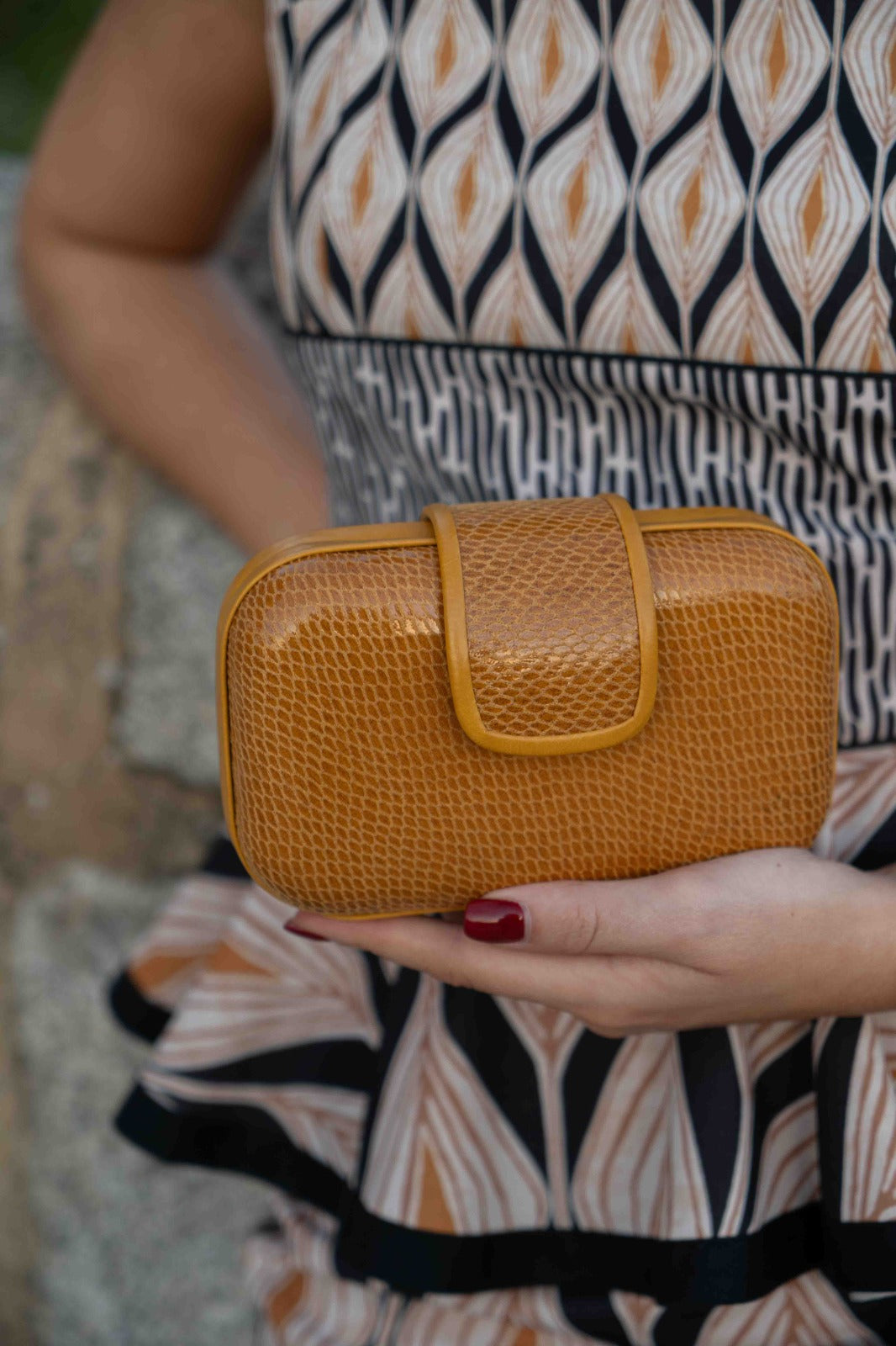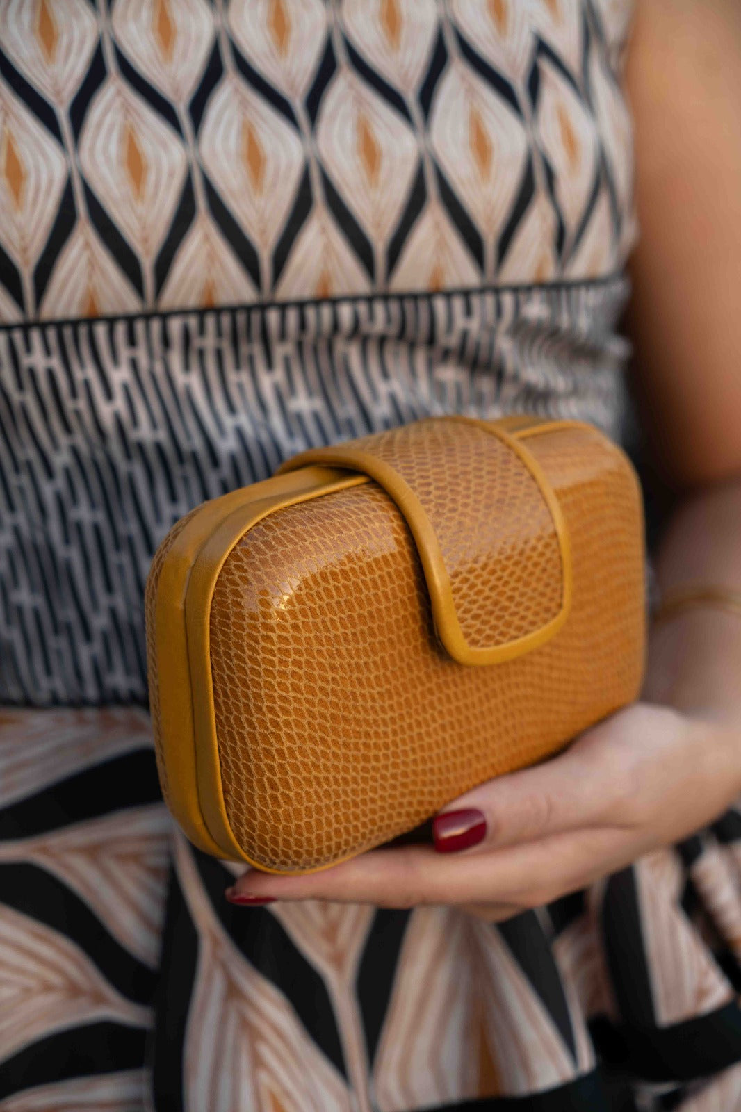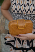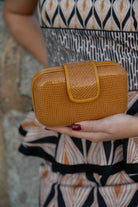 Carteira oval, fecho magnético, corrente dourada para pendurar. Na cor mostarda.