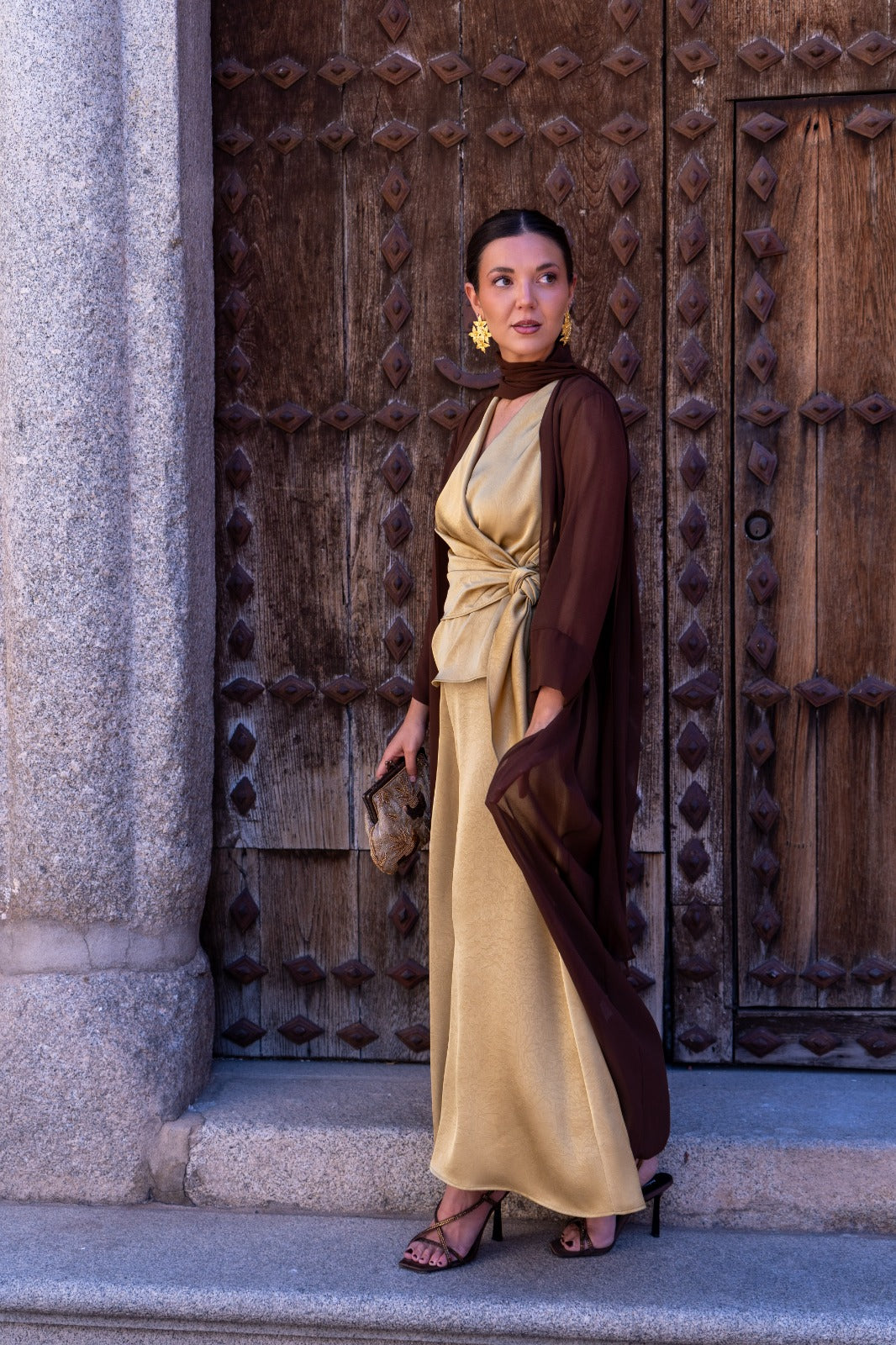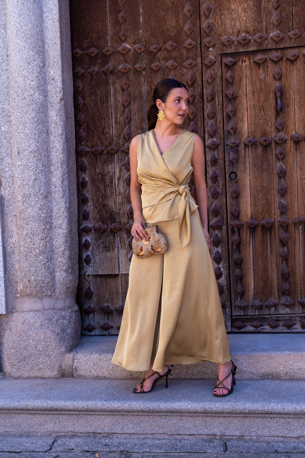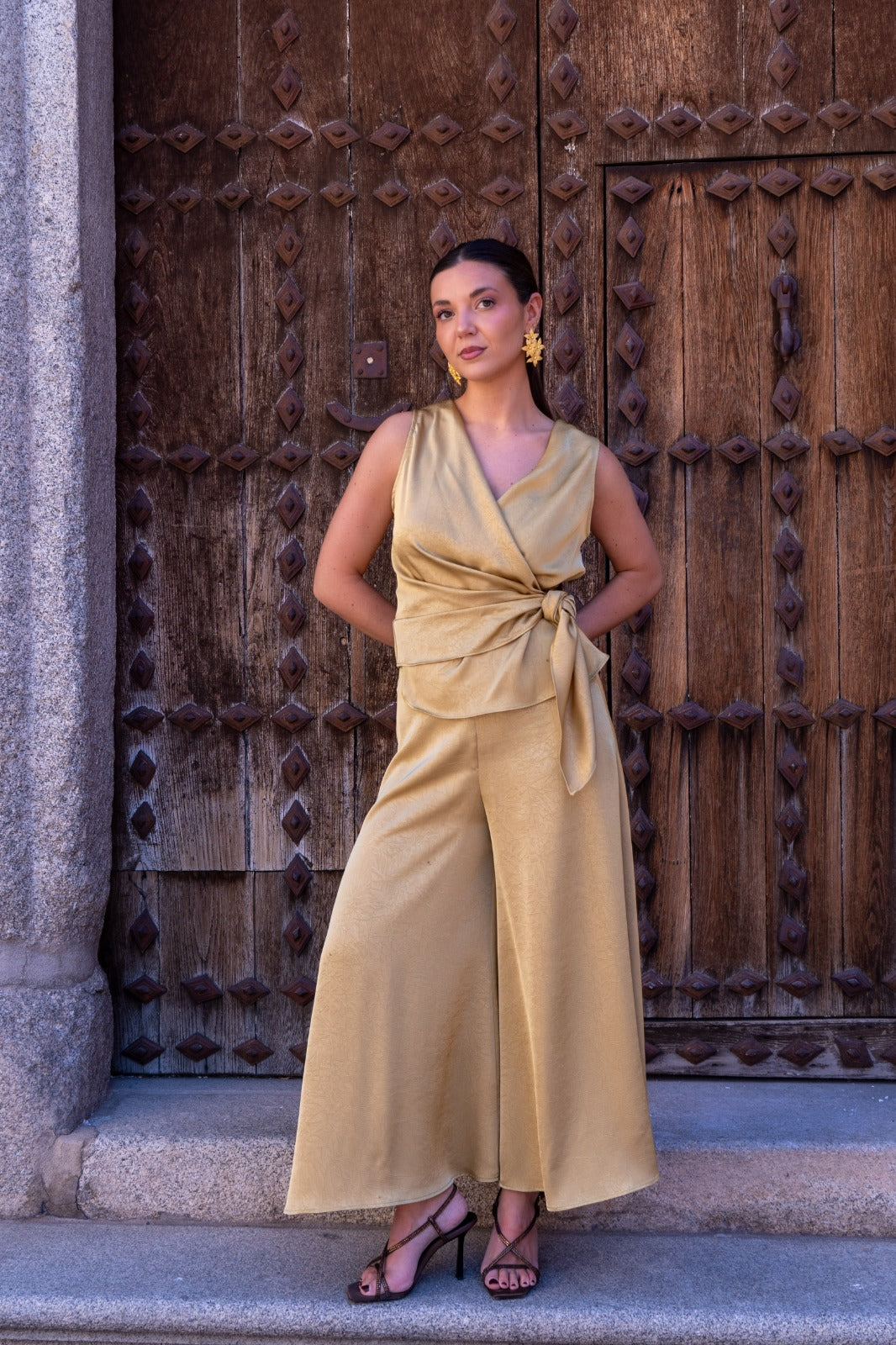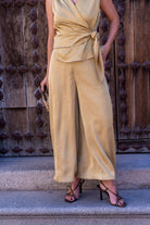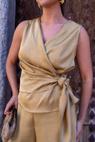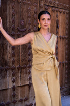 Conjunto compuesto por blusa cruzada, anudada a un lado, sin mangas y pantalón plazzo ancho, goma en la parte trasera de la cintura. En color mostaza.