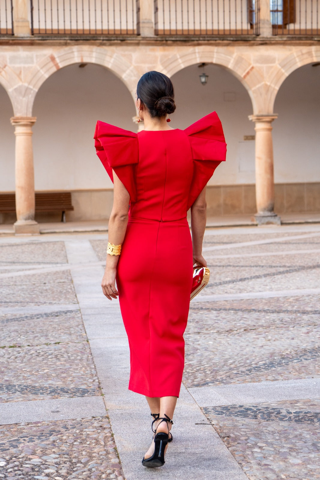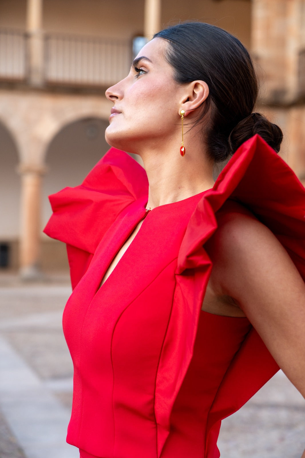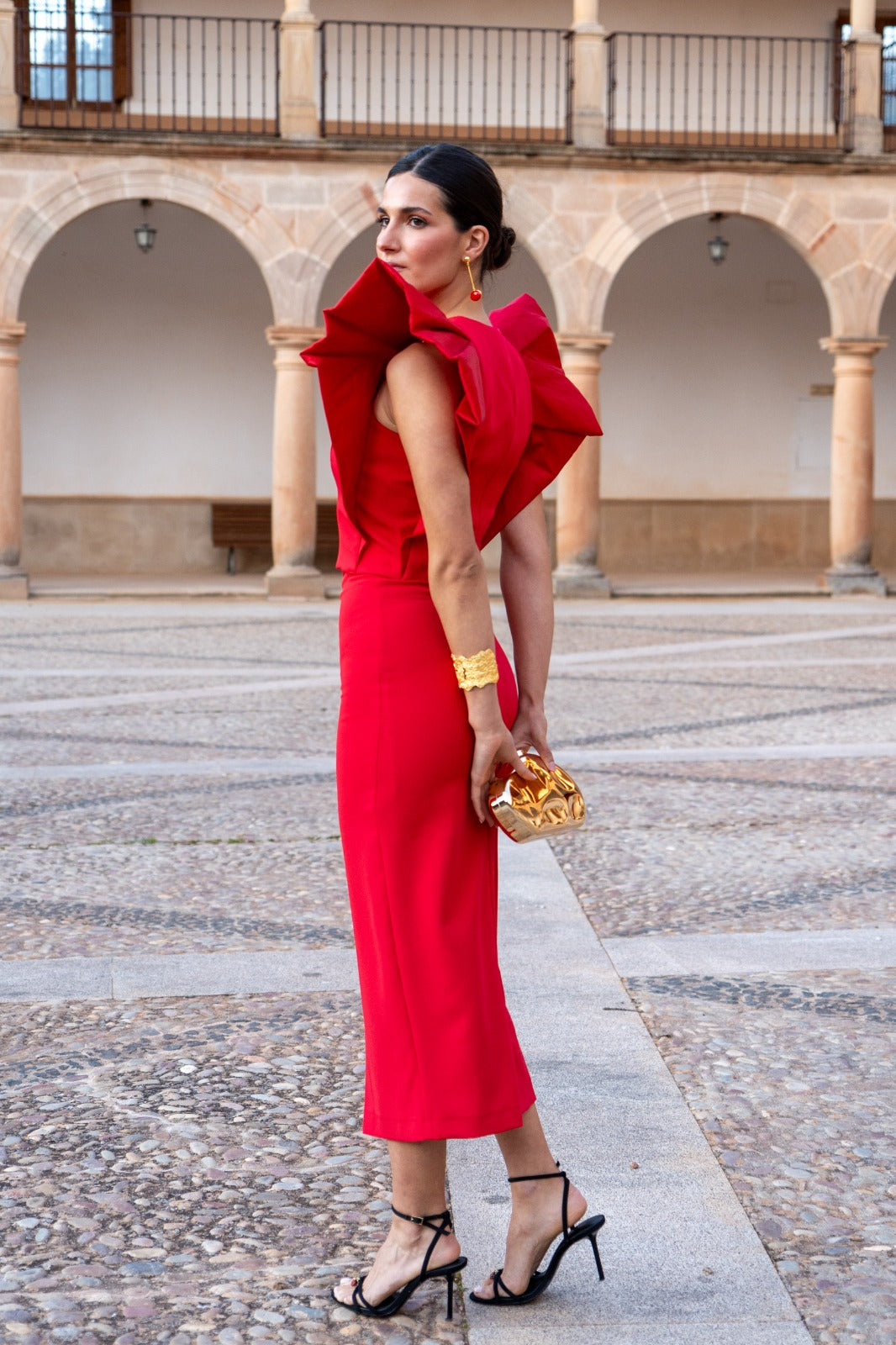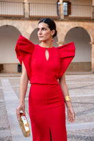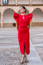 Conjunto compuesto por top escote redondo con lagrima, sin mangas, maxi volante en hombros y falda entubada con abertura delantera. En color rojo.