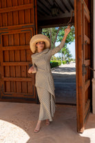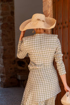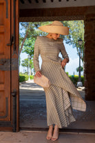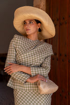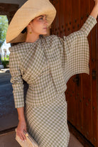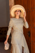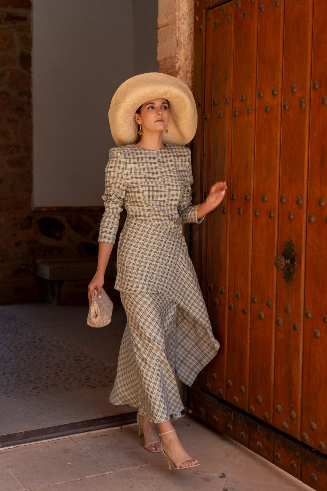 Conjunto compuesto por top escote cerrado, manga larga, entallado y drapeado asimétrico. Falda alta, corte evasé. En cuadros neutros.