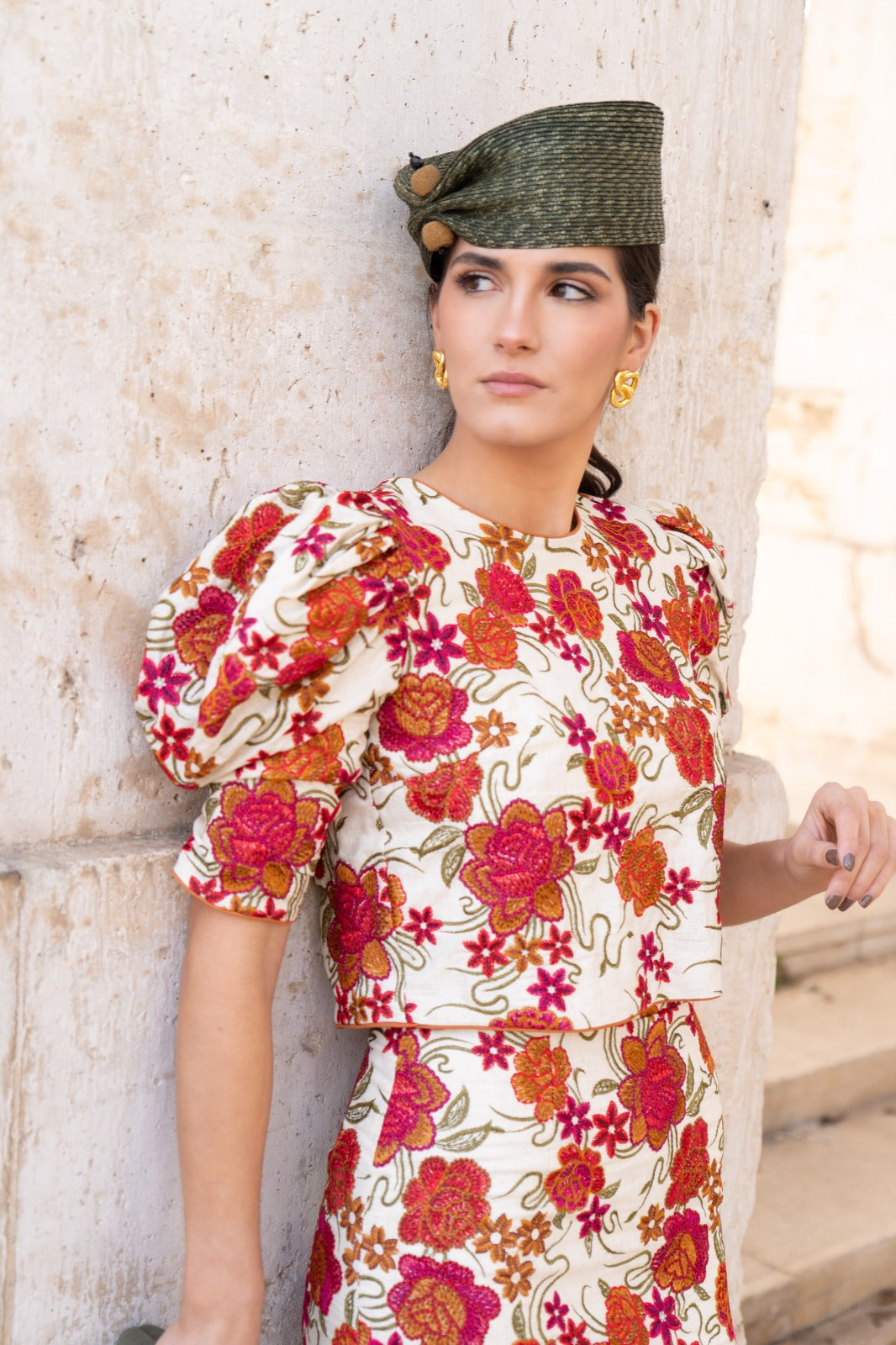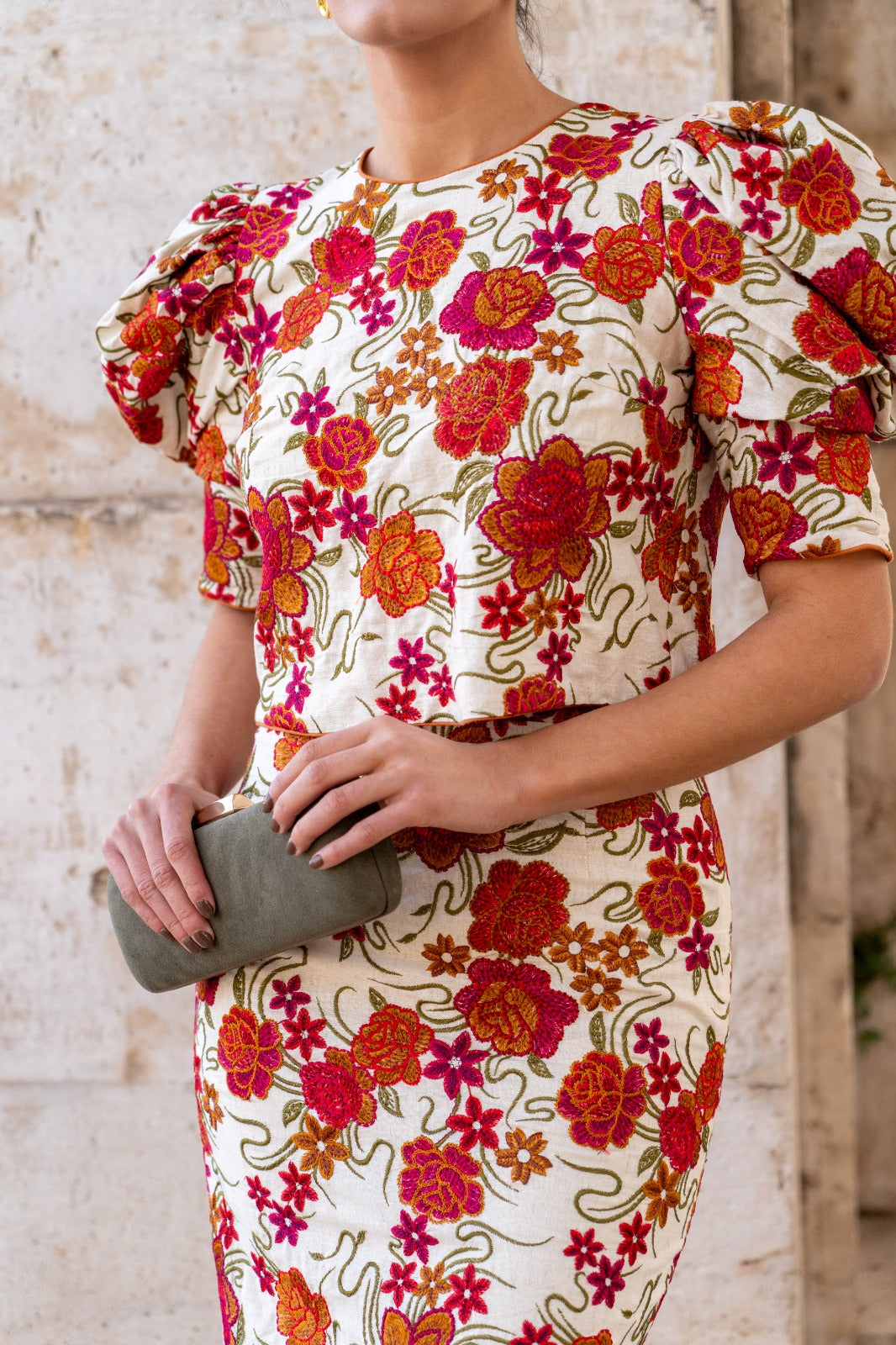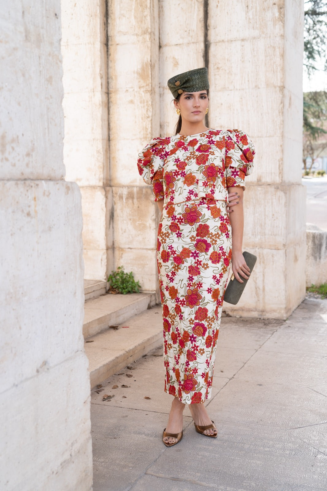 Conjunto compuesto por blusa escote redondo, manga corta abullonada, espalda cruzada abierta y falda recta, abertura trasera. En color beige con bordados.