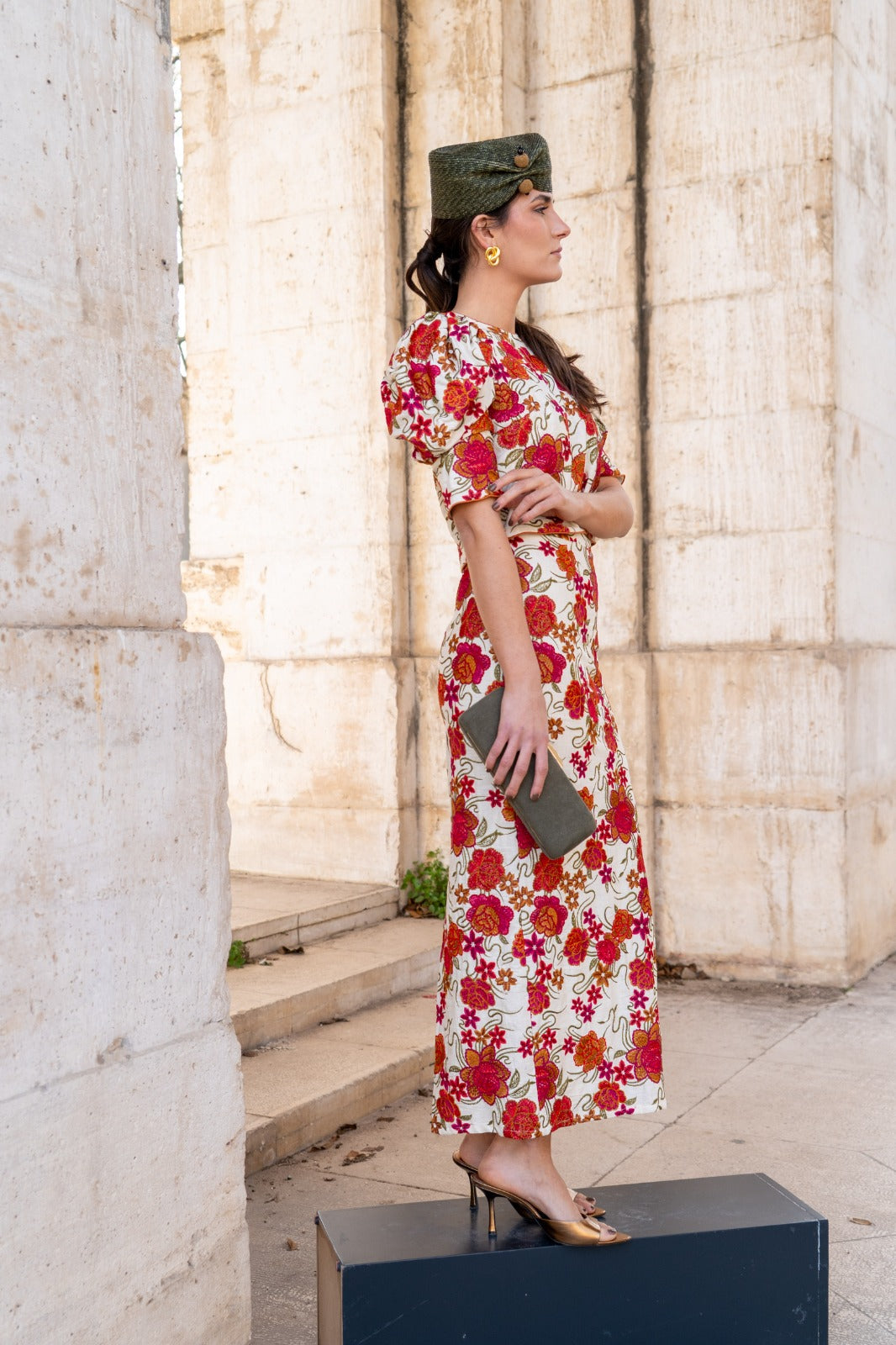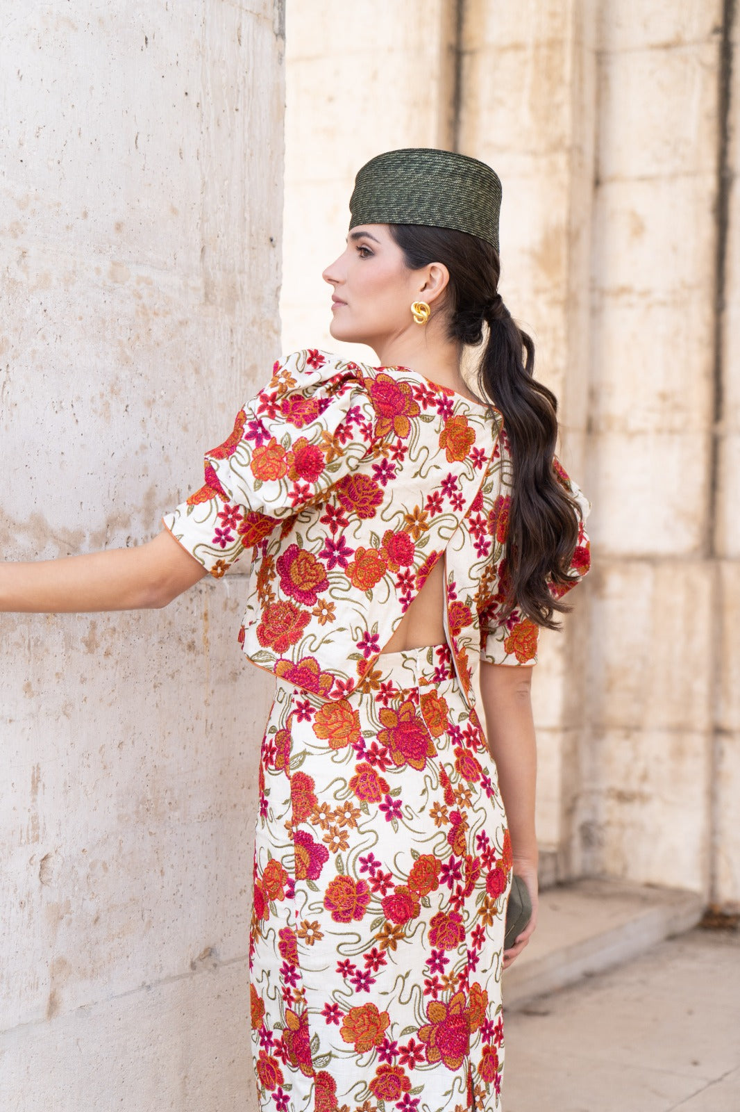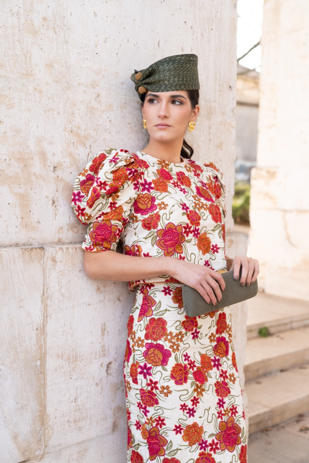 Conjunto compuesto por blusa escote redondo, manga corta abullonada, espalda cruzada abierta y falda recta, abertura trasera. En color beige con bordados.