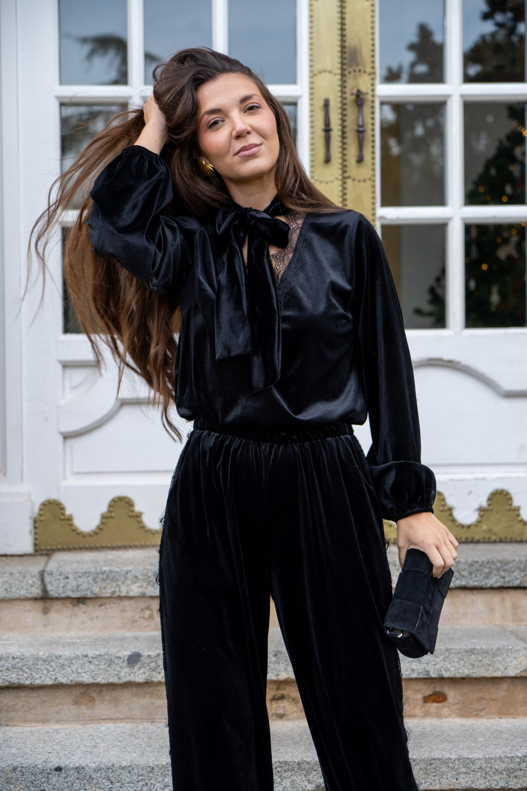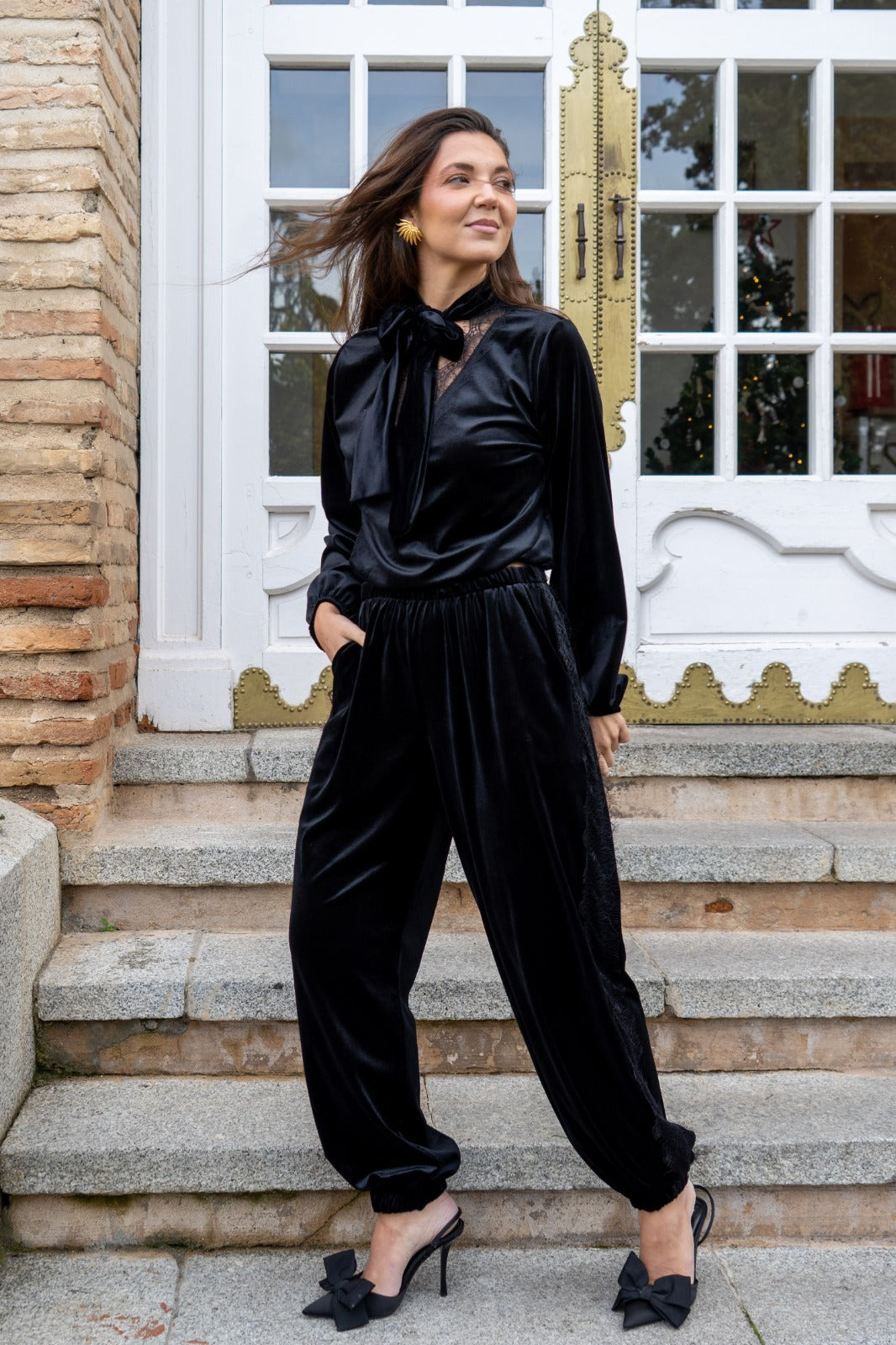 Conjunto compuesto por blusa, escote a pico con puntilla, manga larga con puño engomado y pantalón bombacho, cintura engomada, puntilla en los laterales, en color negro.