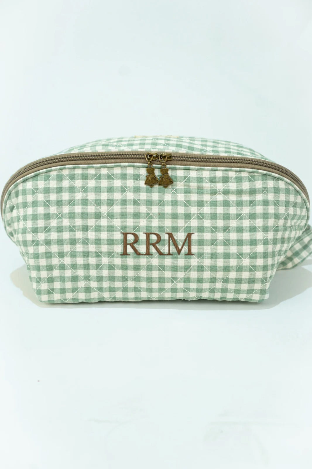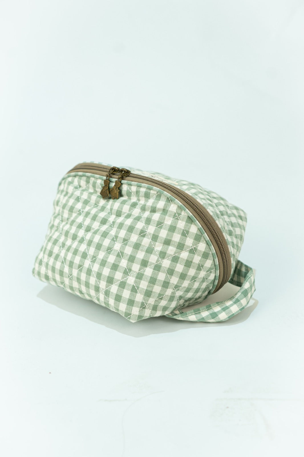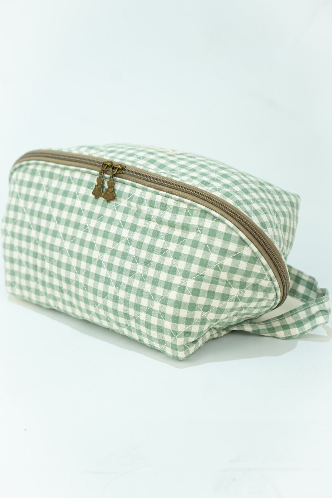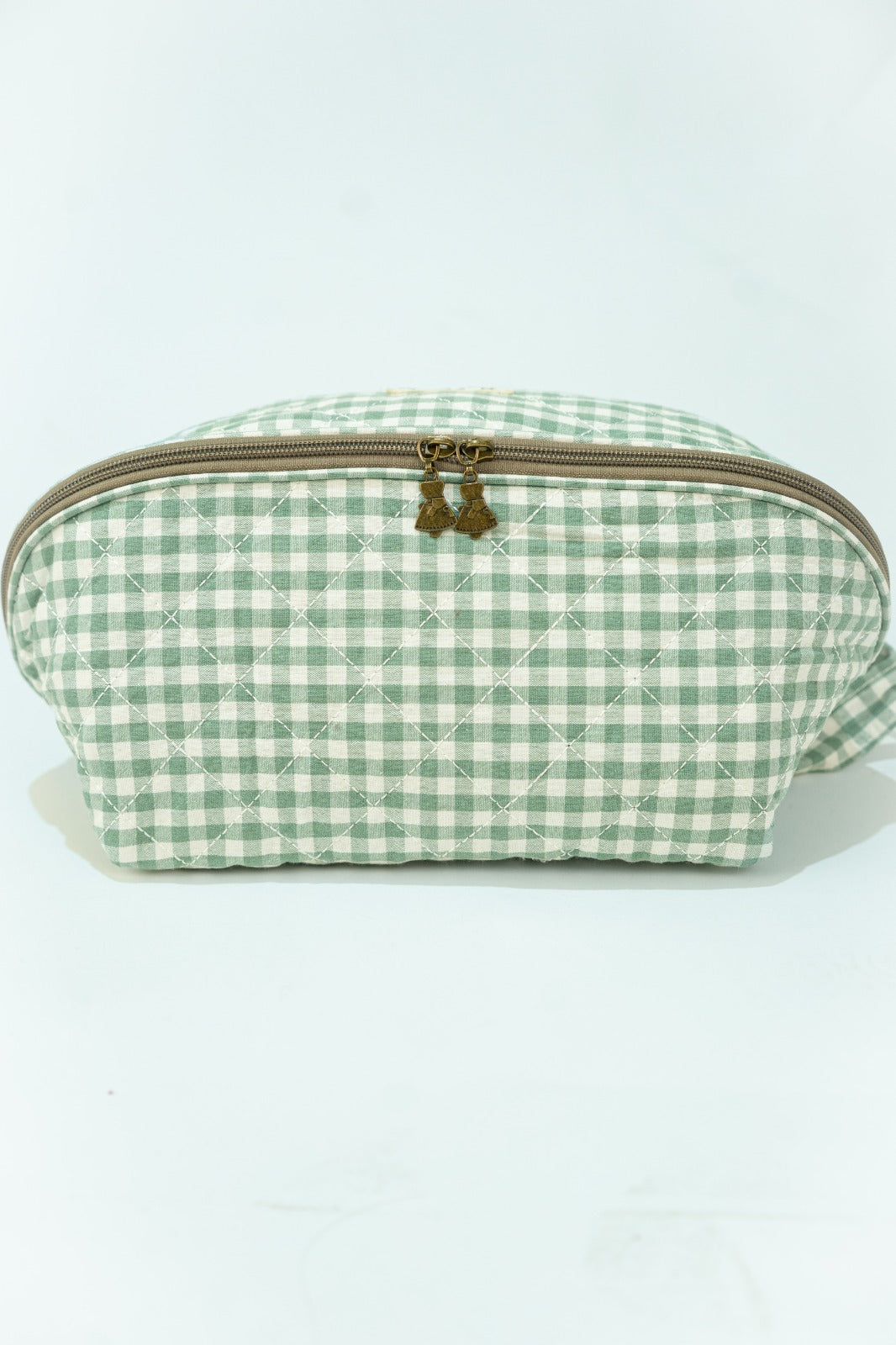 Nécessaire com fecho de correr, alça lateral, bolsos interiores, em xadrez vichy branco e verde.