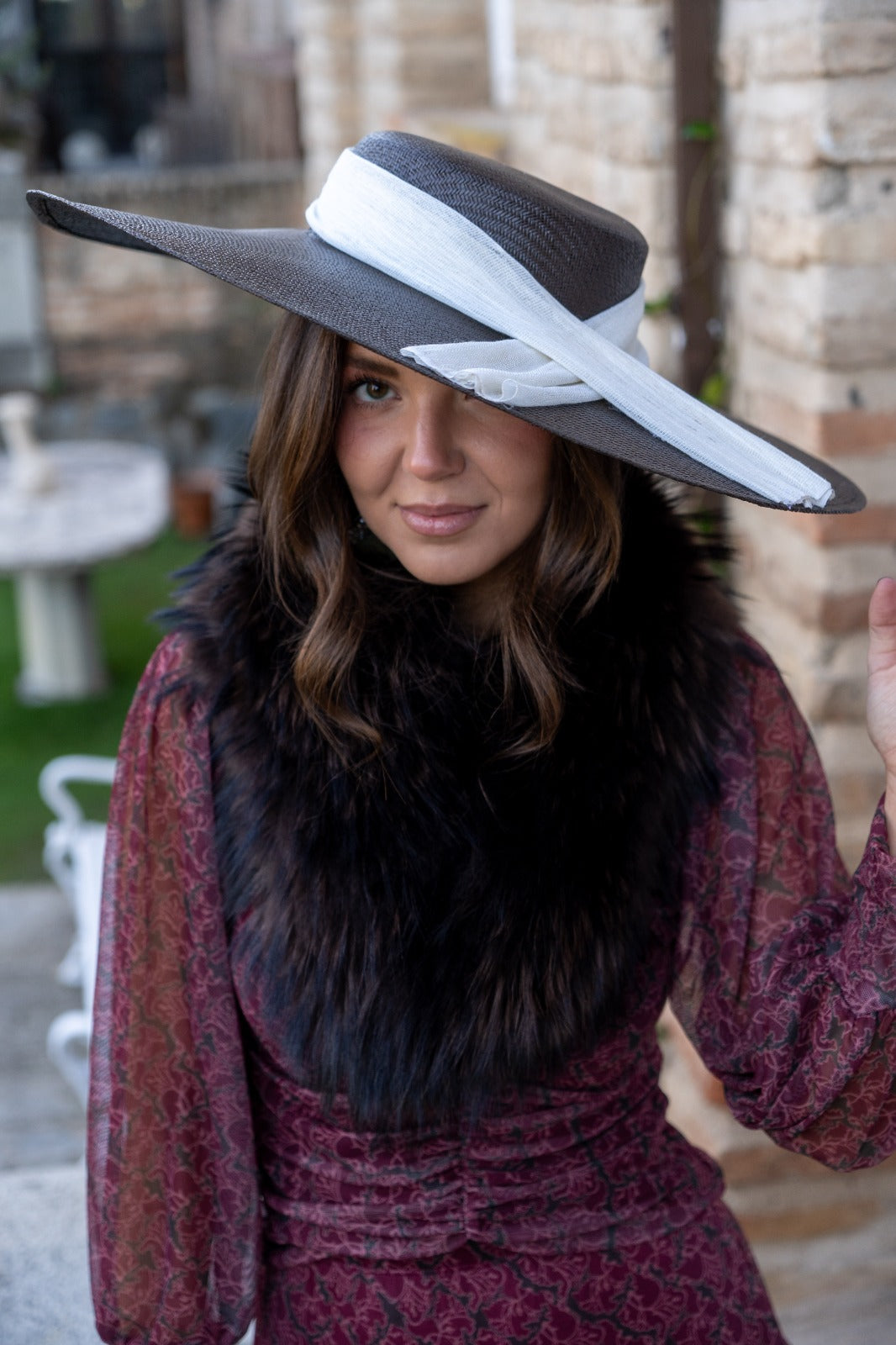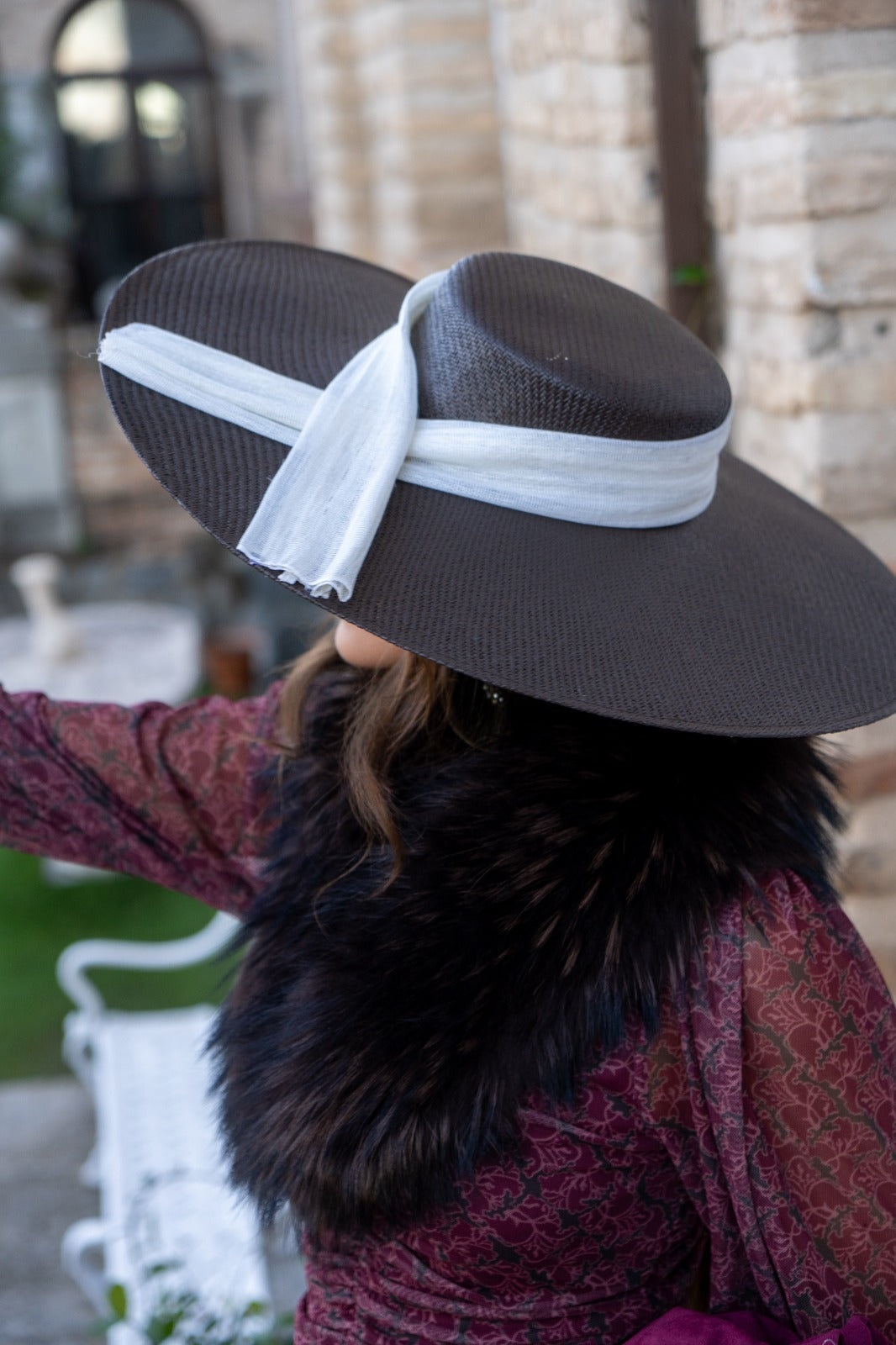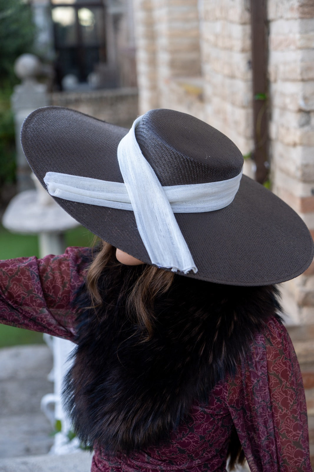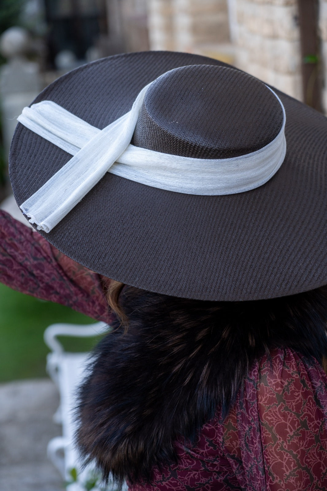 Pamela de fibra natural, teñida a mano de forma artesanal, con detalle lazo en beige. Sujeción con diadema.