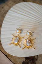 Brincos com uma pedra central redonda, de onde emergem vários raios, e uma inferior oval com linhas em todas as direções.