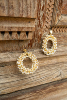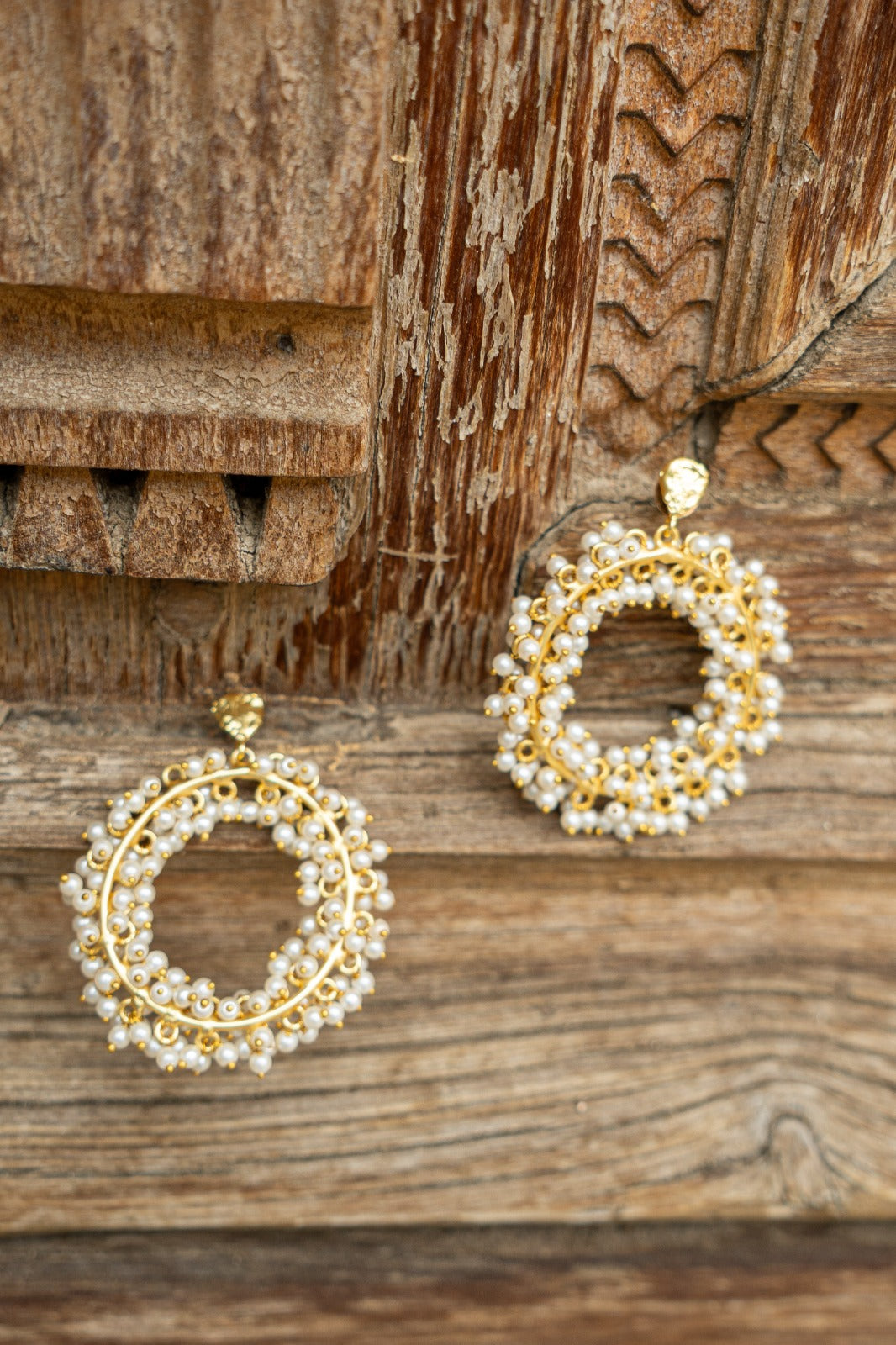 Brincos de argola frontal formados por um círculo rodeado de mini pérolas, com fecho de porca.