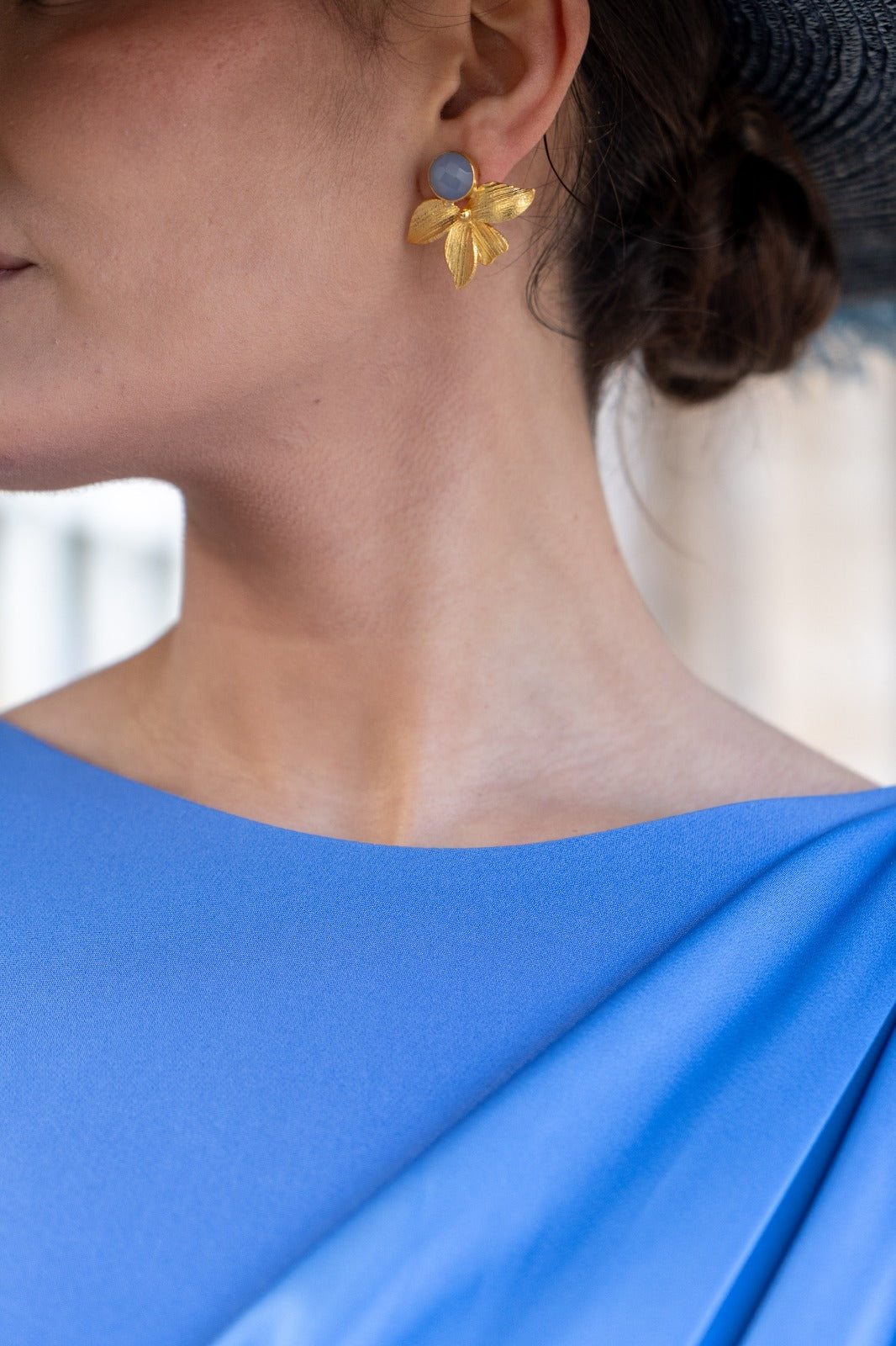Cada pendiente presenta cuatro hojas que culminan en una piedra circular en la parte superior, cierre con tuerca.