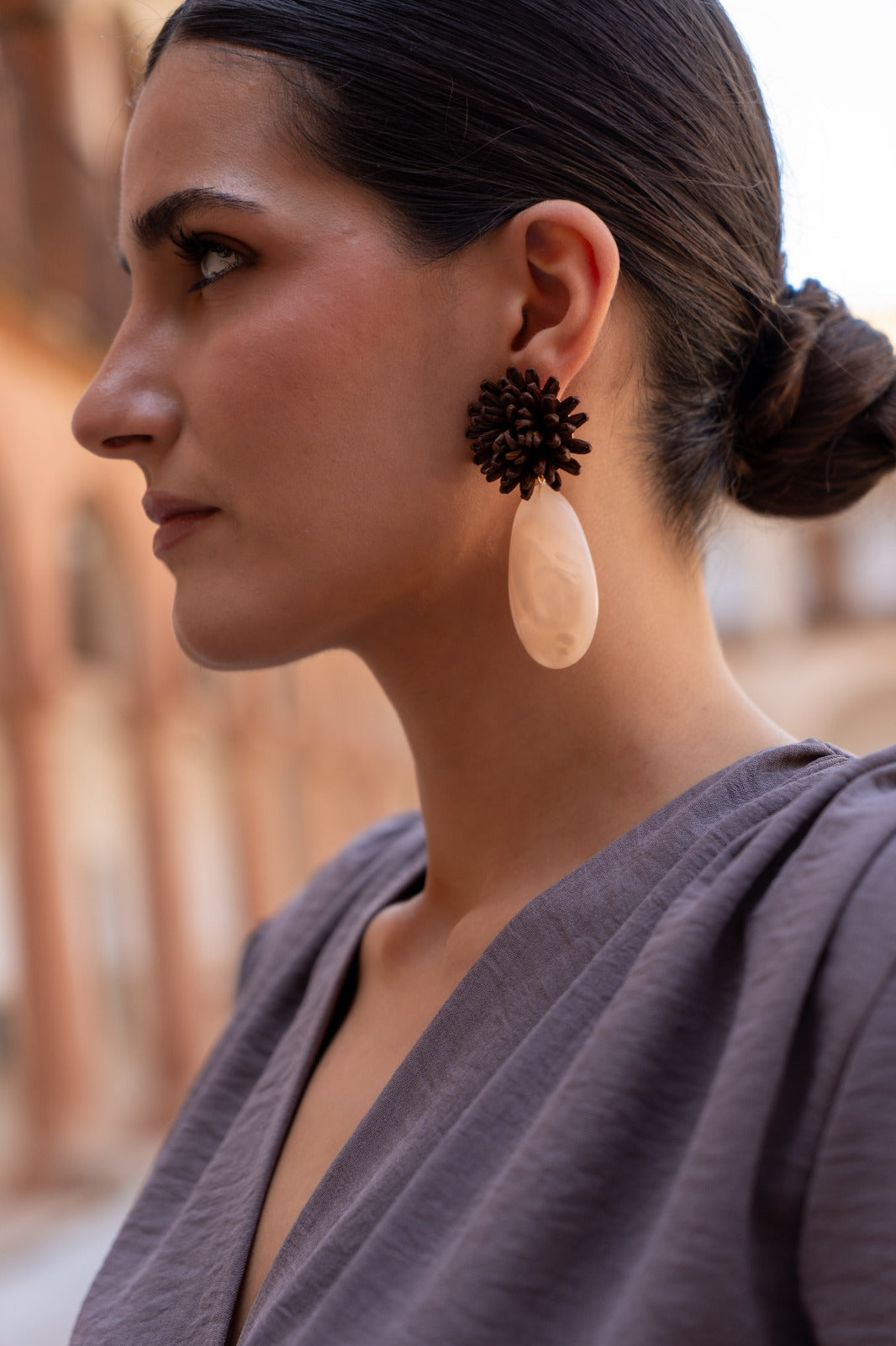Pendientes formados por una flor y una piedra, cierre con tuerca. En color marrón y beige.