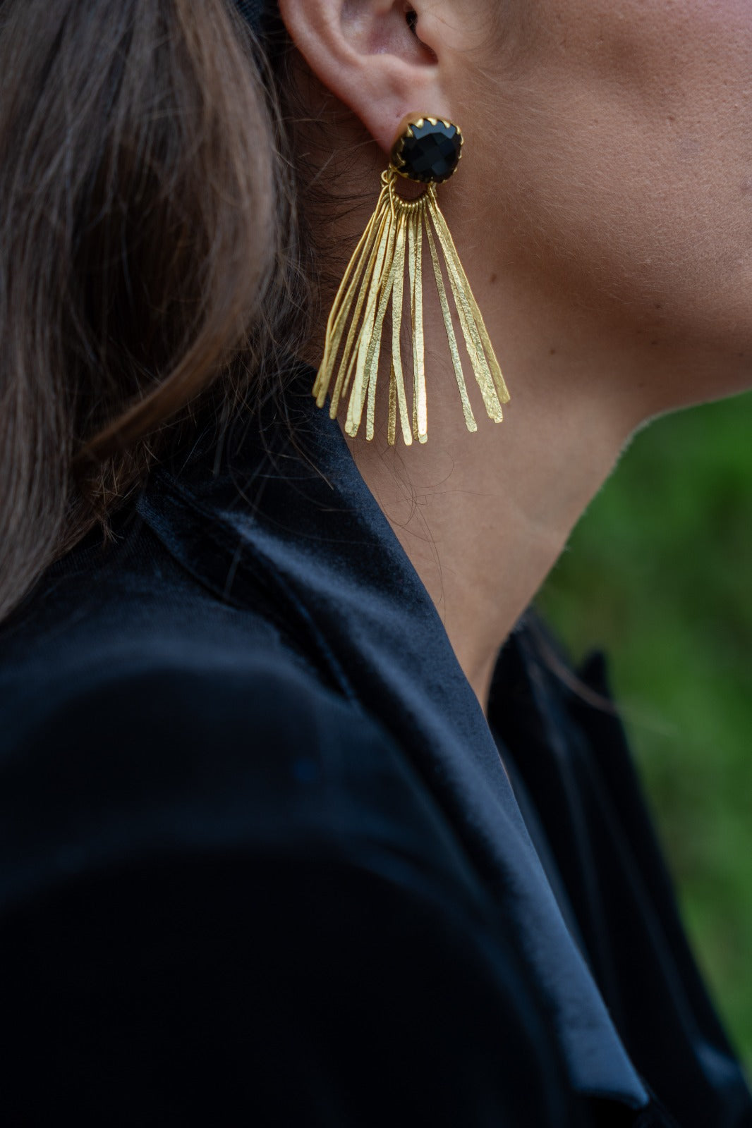 Brincos compostos por uma pedra superior e uma elegante disposição de hastes douradas que formam um semicírculo na parte inferior.
