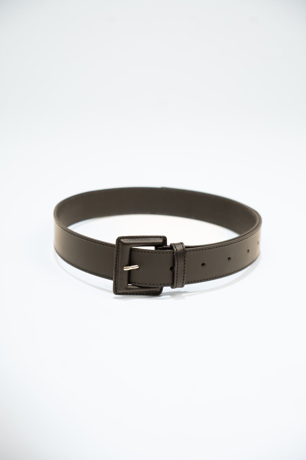 Cinto em pele preta. Fecho frontal com fivela revestida a pele.
