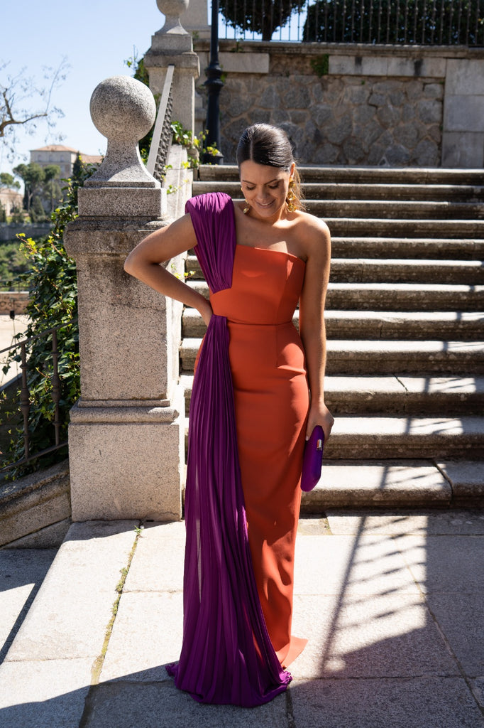 Vestido longo assimétrico de crepe, sem alças, com pregas de georgette cobrindo o ombro proeminente. Corte na cintura, saia reta e laço de pregas que acompanha a ombreira. Disponível em coral e roxo.
