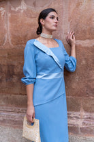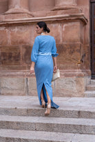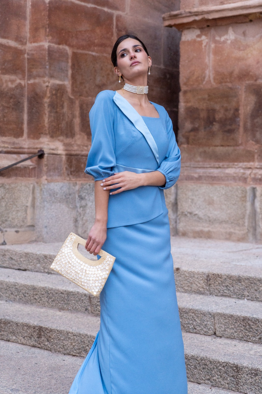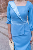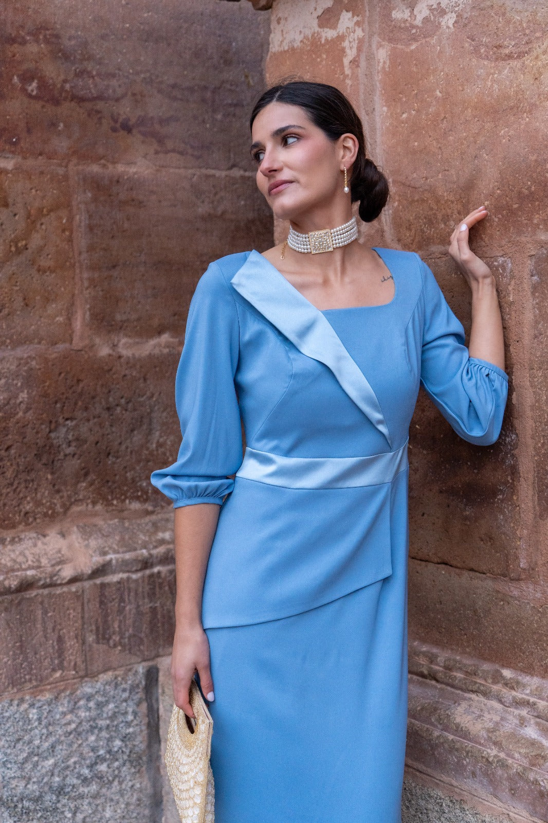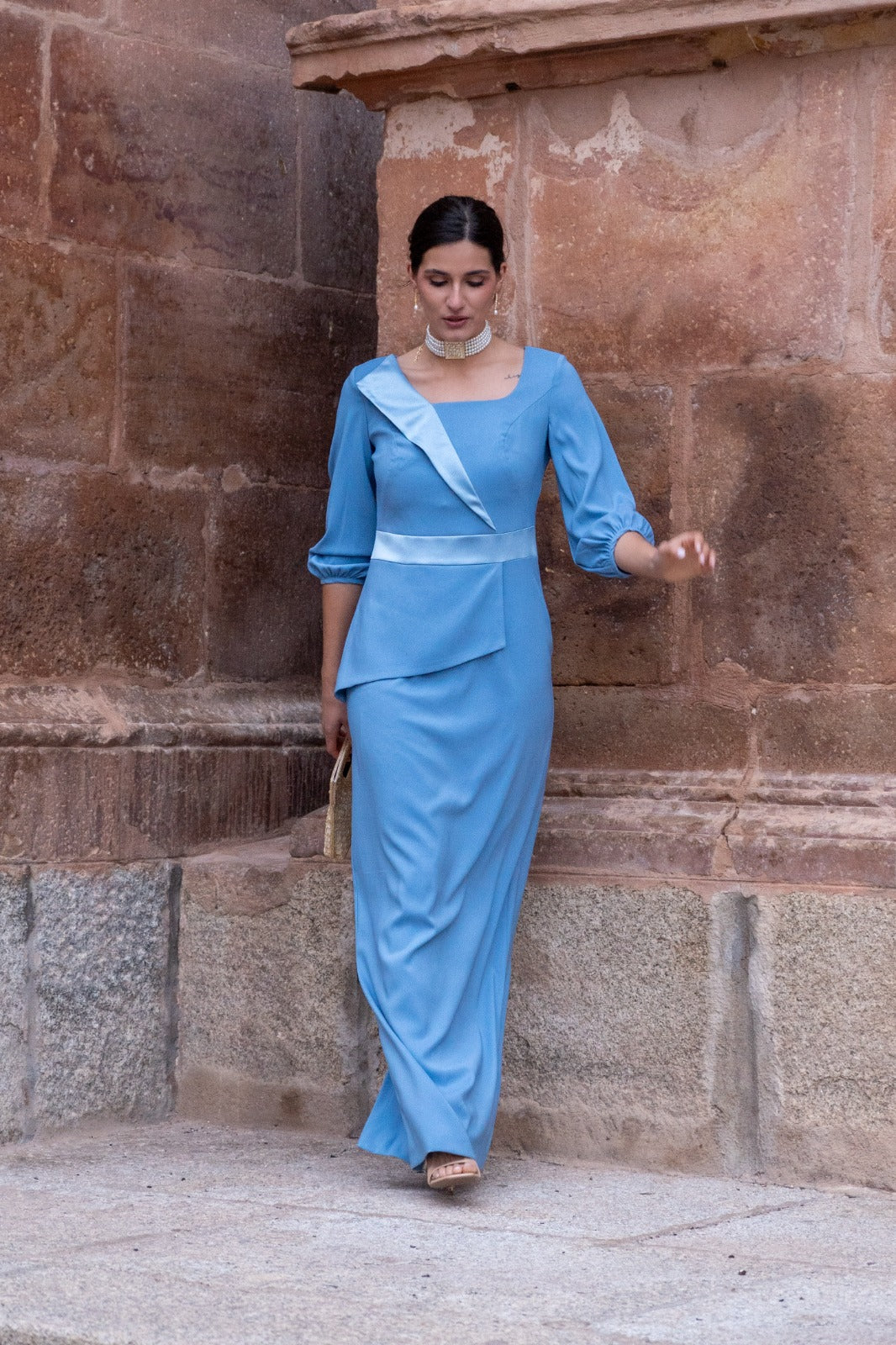 Vestido largo, escote cuadrado con detalle tira en satén, manga francesa, corte en cintura con satén, abertura trasera. En color azul.